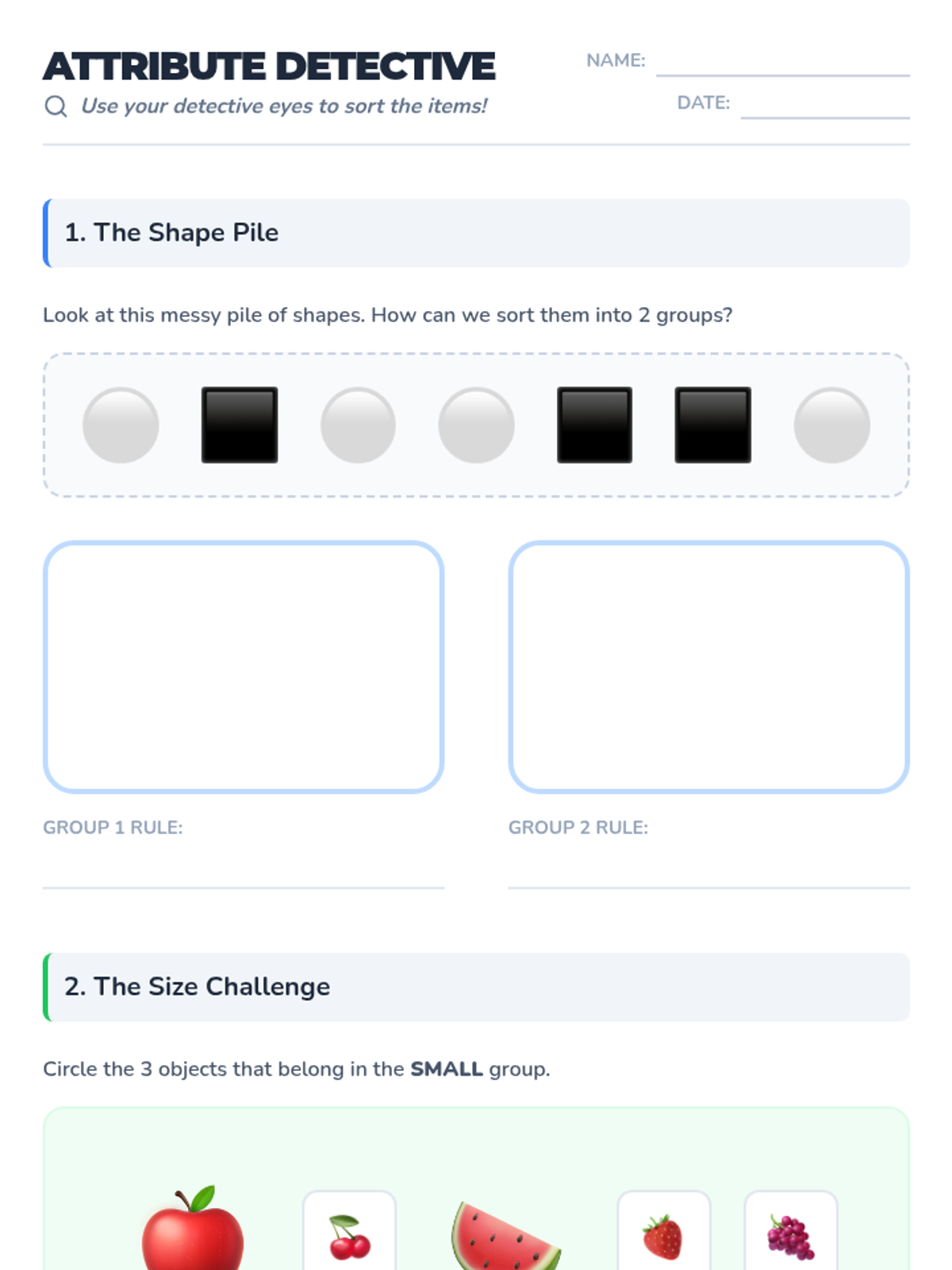 This sequence guides early learners through organizing their world by observing physical properties and grouping objects accordingly, bridging classification and early data analysis.