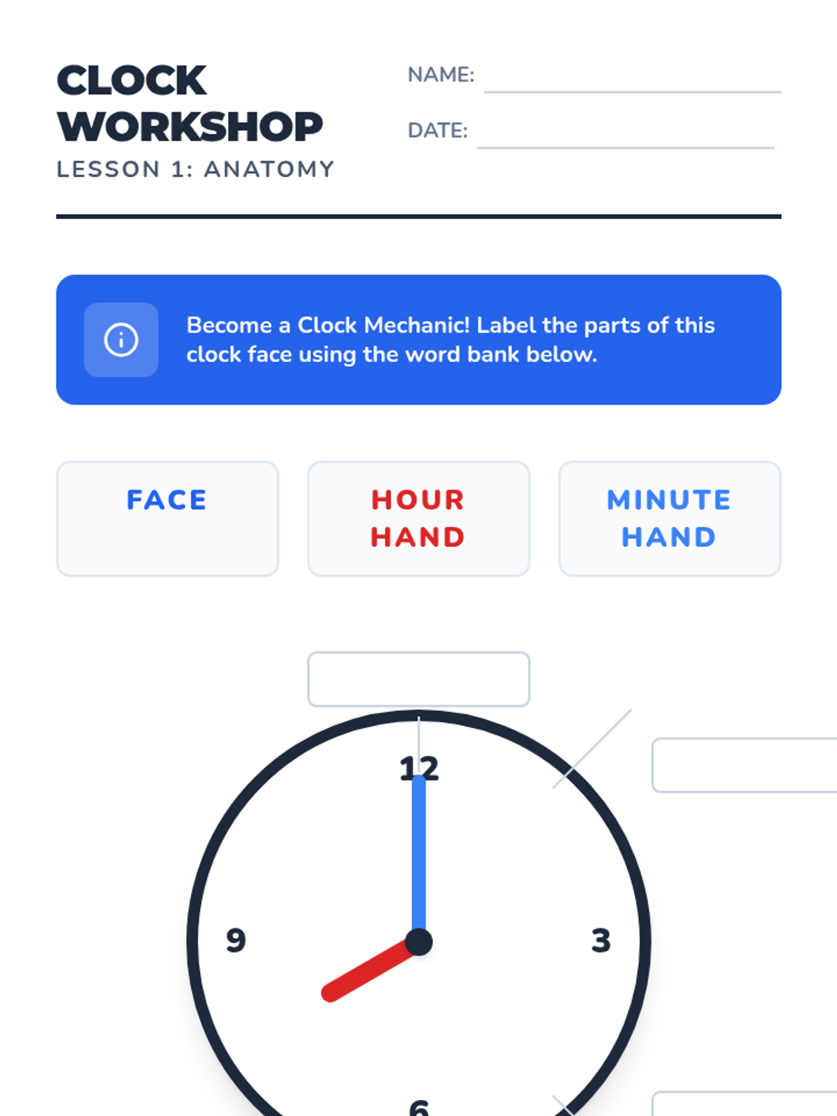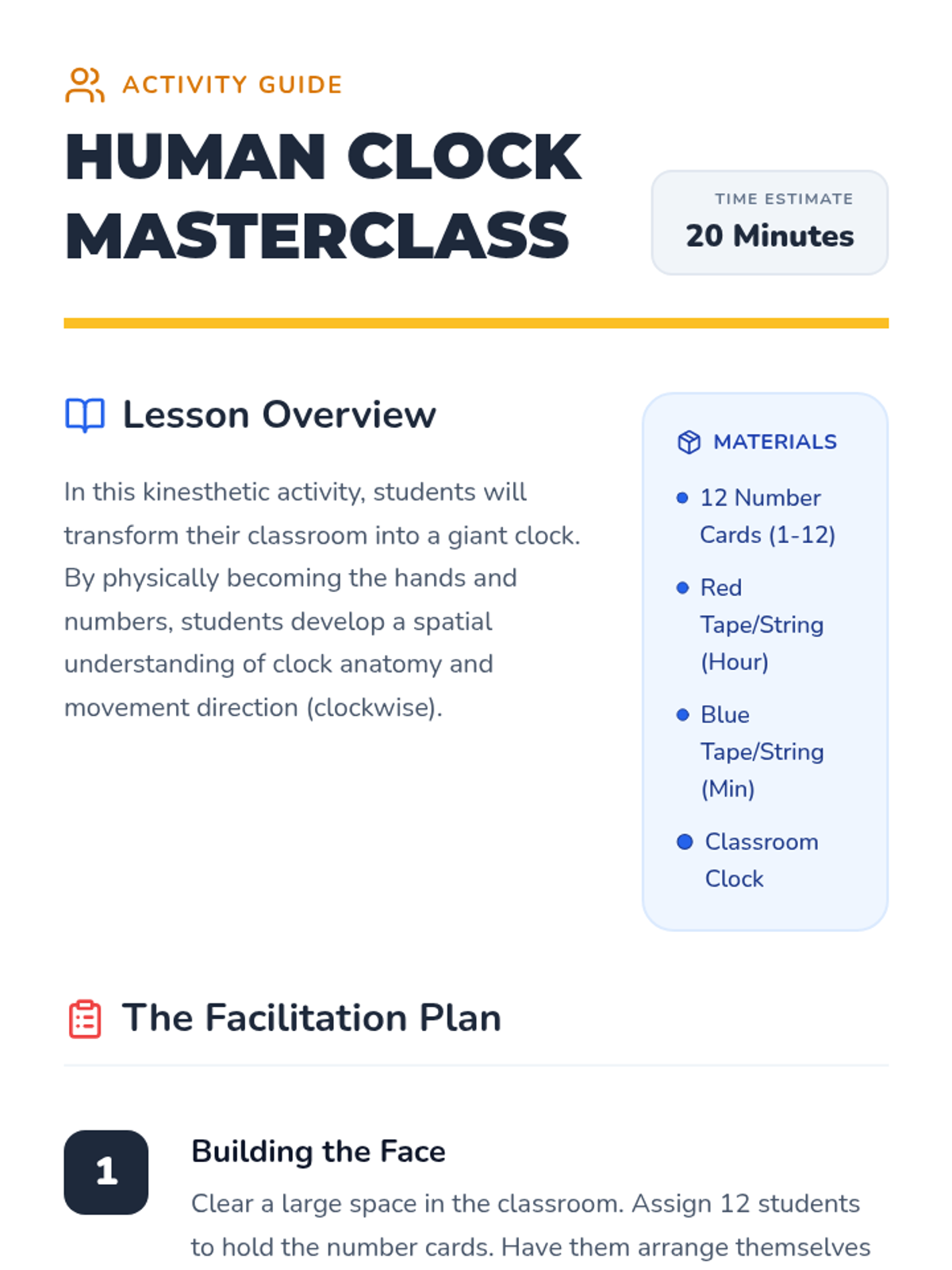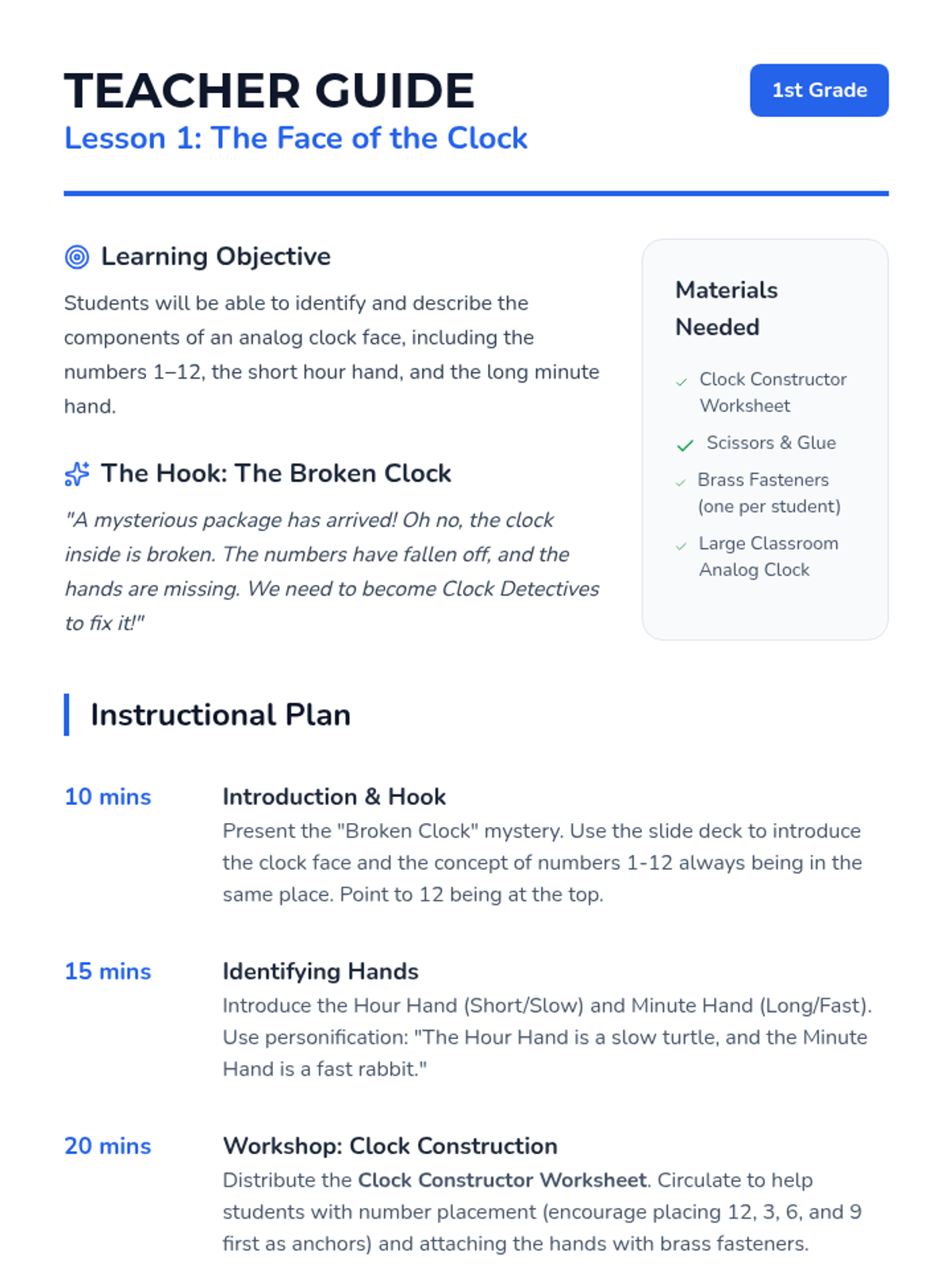 A comprehensive 1st Grade sequence exploring analog and digital time. Students learn clock anatomy, telling time to the hour and half-hour, and connecting time to their daily routines through hands-on activities and interactive lessons.