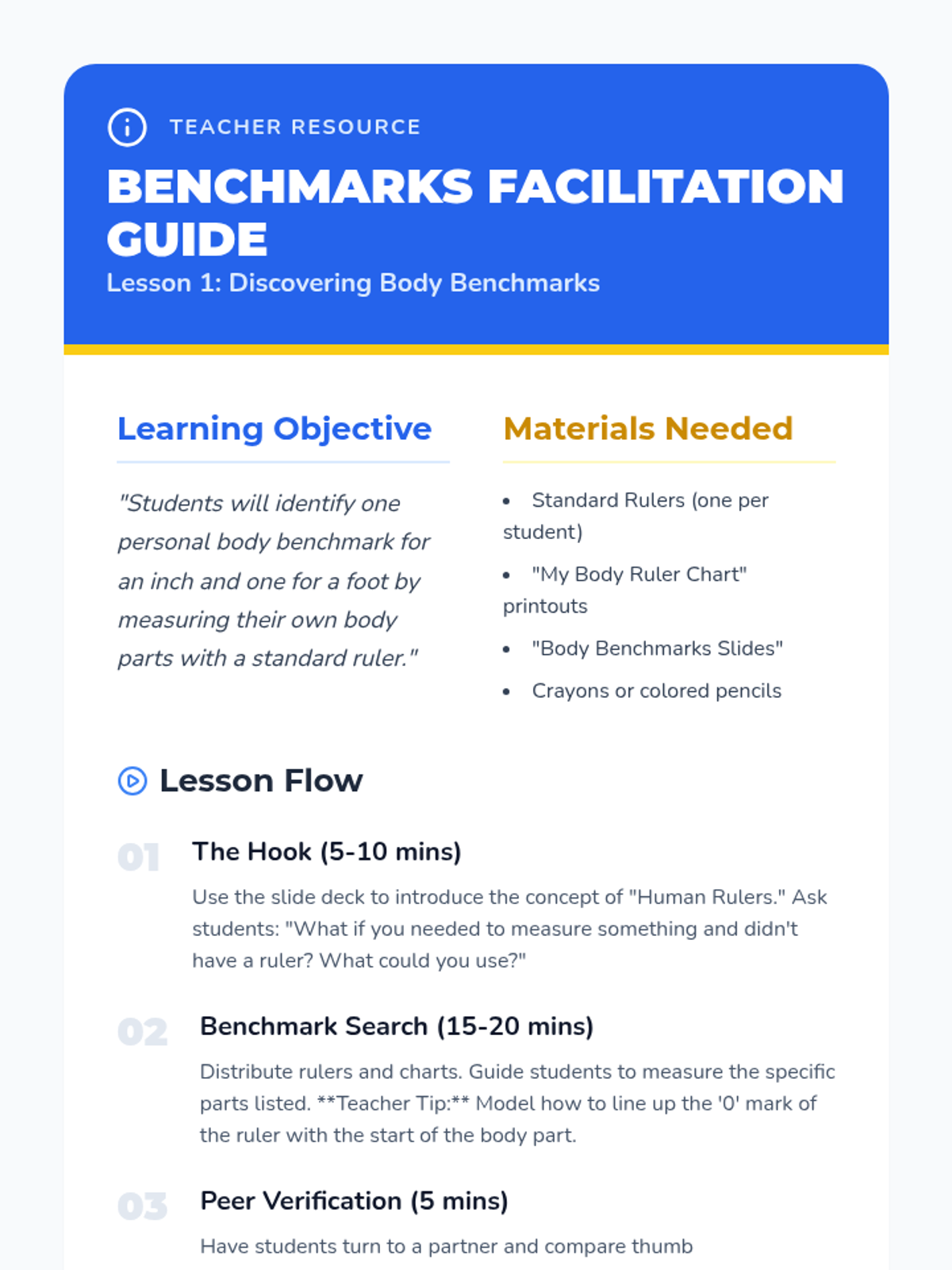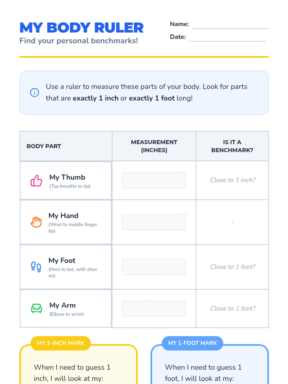 This sequence helps 1st Grade students develop 'measurement sense' by finding personal body benchmarks (like their thumb or foot) to estimate lengths before verifying with standard tools. Through gamified activities like 'The Estimation Jar' and 'Estimation Olympics,' students internalize the magnitude of inches and feet.