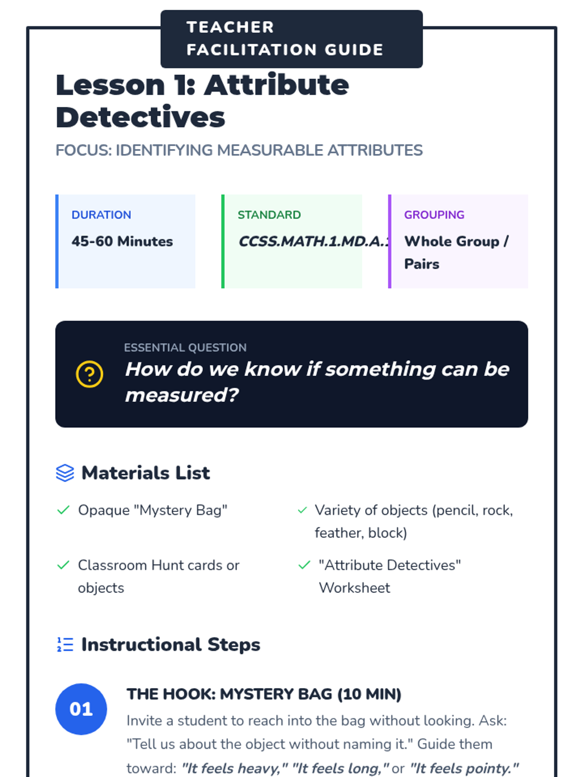 A foundational first-grade sequence focusing on measurable attributes like length and weight. Students learn to distinguish measurable properties, use direct comparison techniques, order multiple objects, and explore indirect comparison using intermediary tools.
