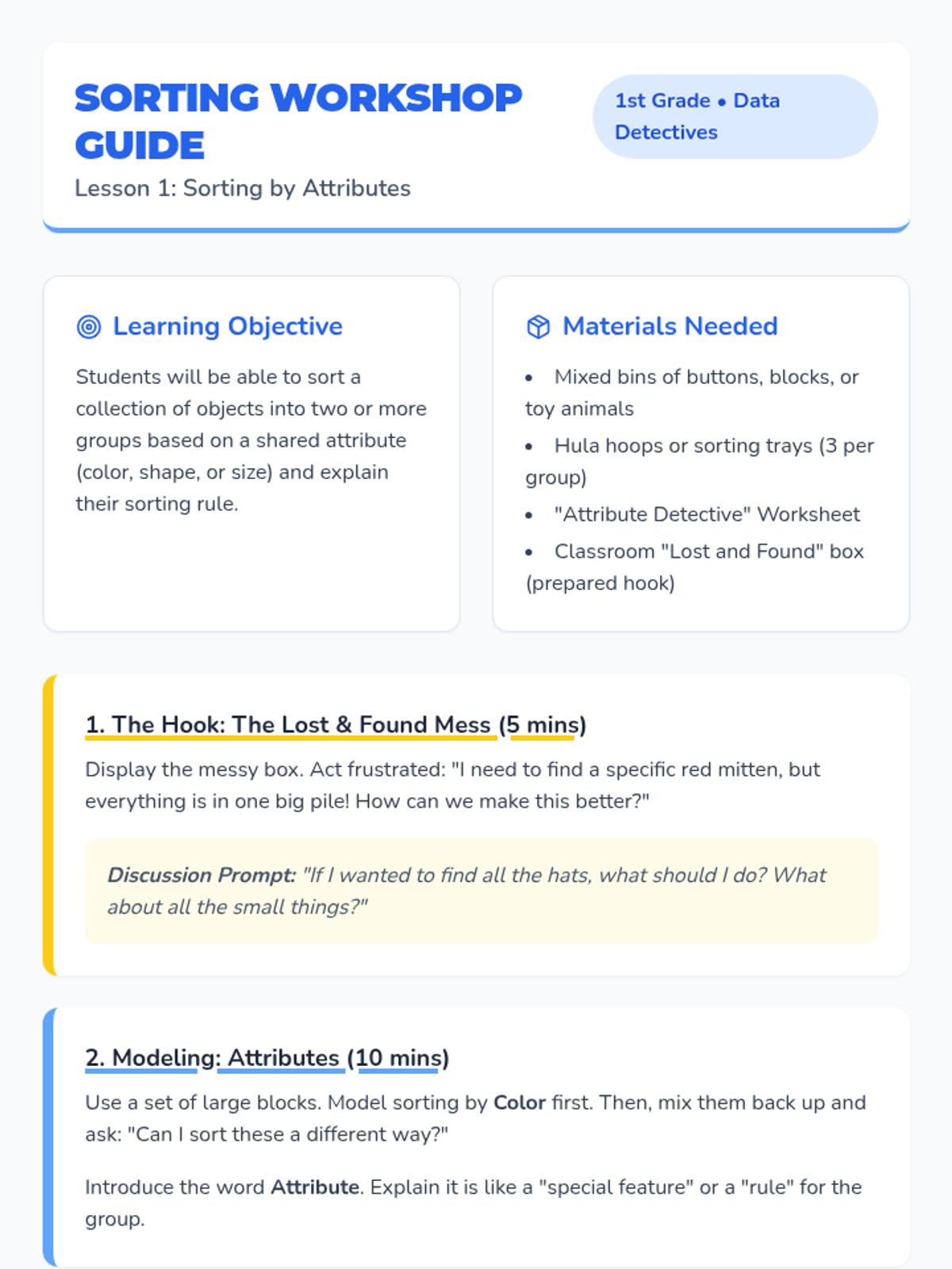 A 1st-grade sequence focused on sorting objects by various attributes, counting categorized groups, and comparing quantities to build foundational data interpretation skills. Students take on the role of 'Data Detectives' to organize chaotic collections into orderly sets.