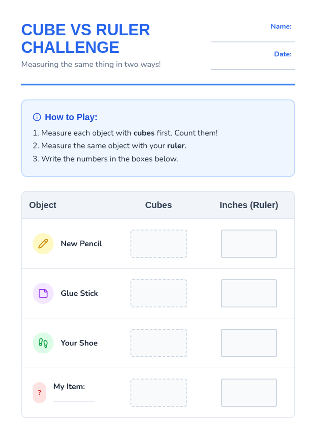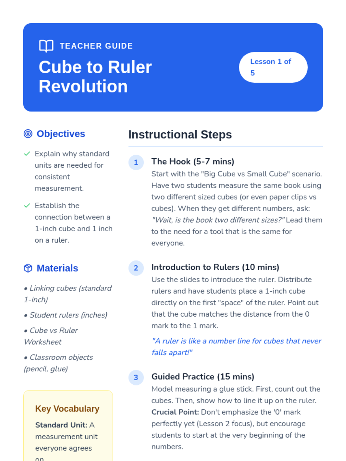 A sequence designed to help 1st graders transition from non-standard measurement to using standard rulers. Students learn to align the zero mark, measure to the nearest inch, and compare lengths.