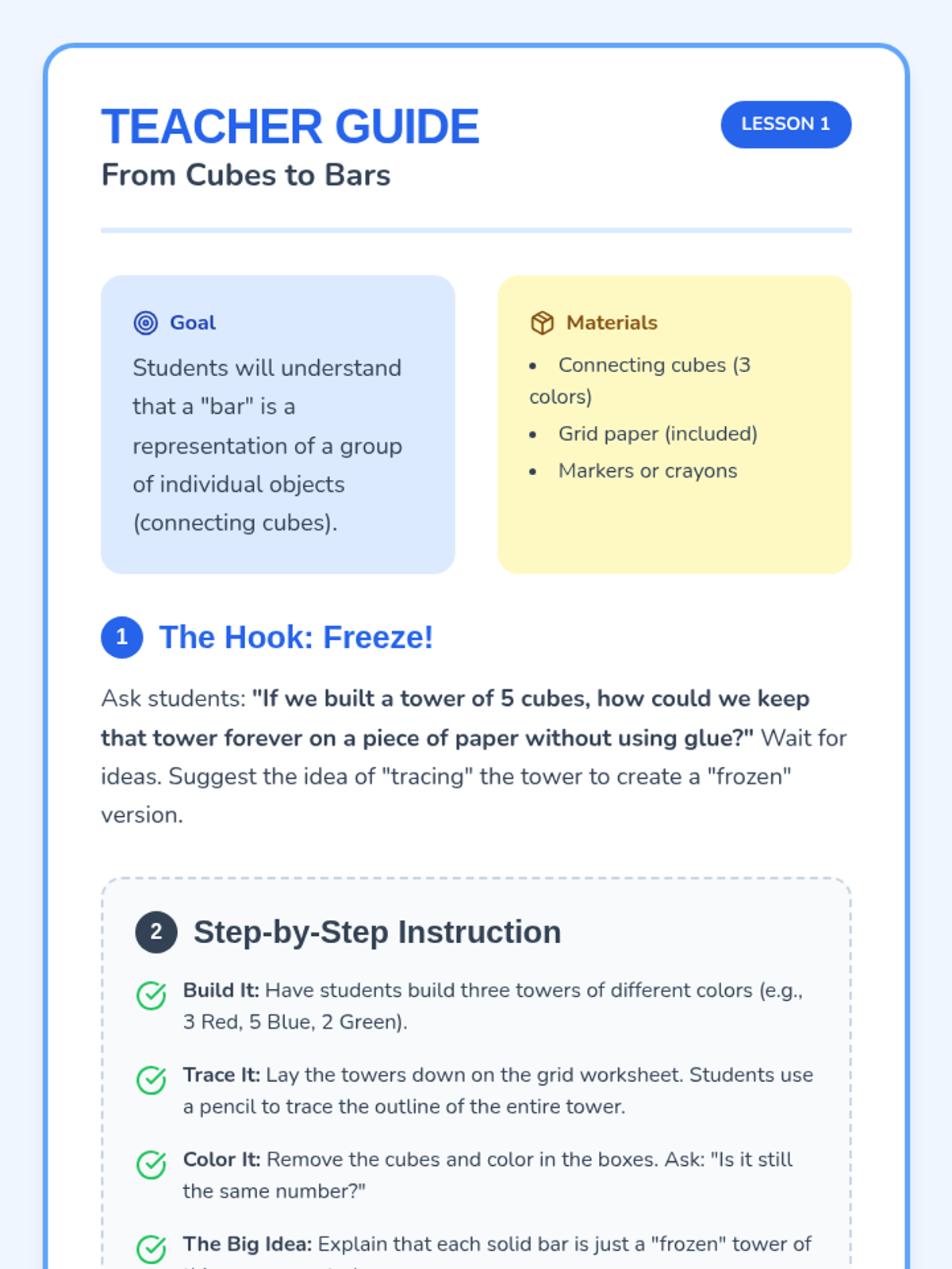 A 1st-grade unit on creating and interpreting picture graphs, moving from concrete 3D objects to abstract 2D representations. Students learn one-to-one correspondence, alignment, and data interpretation through hands-on activities.
