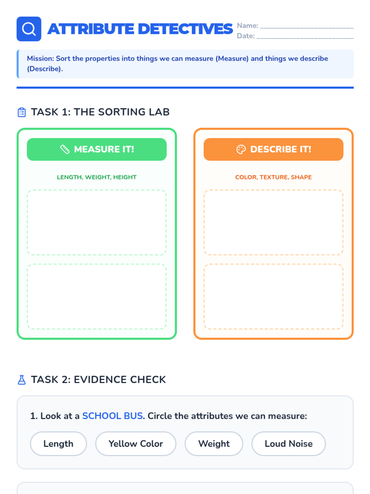 A comprehensive 1st-grade math unit where students learn to identify physical attributes, sort objects into categories, count totals, and compare data sets using a 'Data Detective' theme.