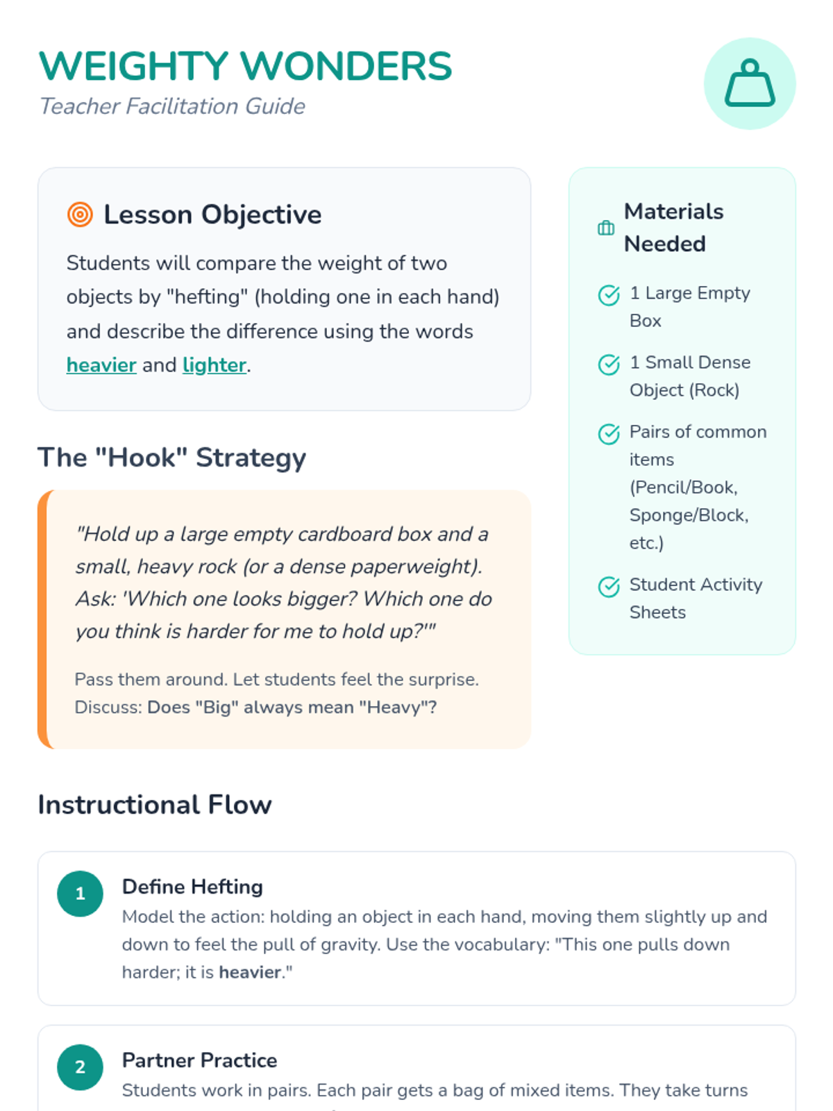 A hands-on exploration of weight and capacity for 1st-grade students, focusing on sensory 'hefting', visual verification with scales, and volume comparison through pouring and counting units. Students conclude with a marketplace simulation to apply their skills in a real-world context.