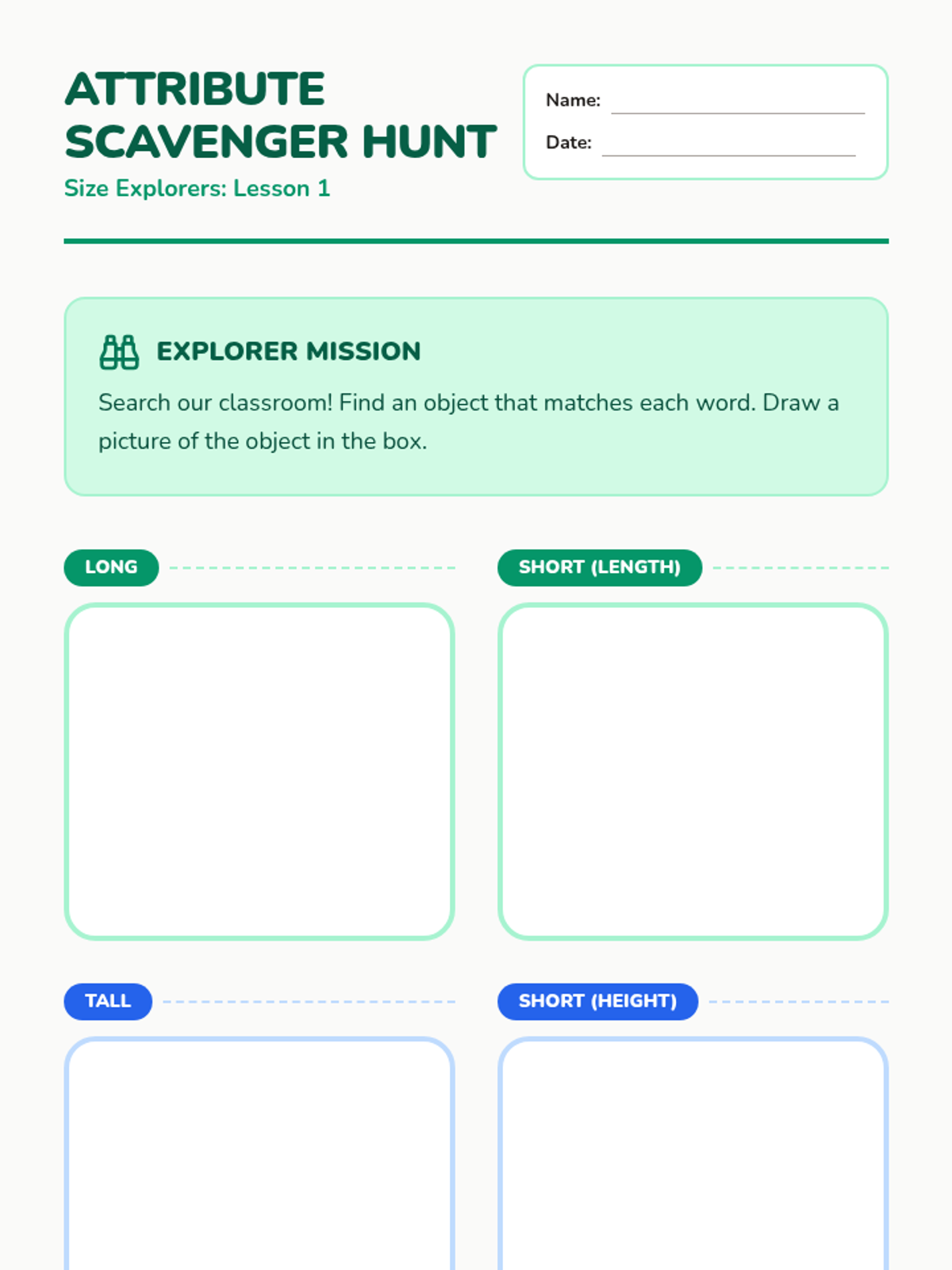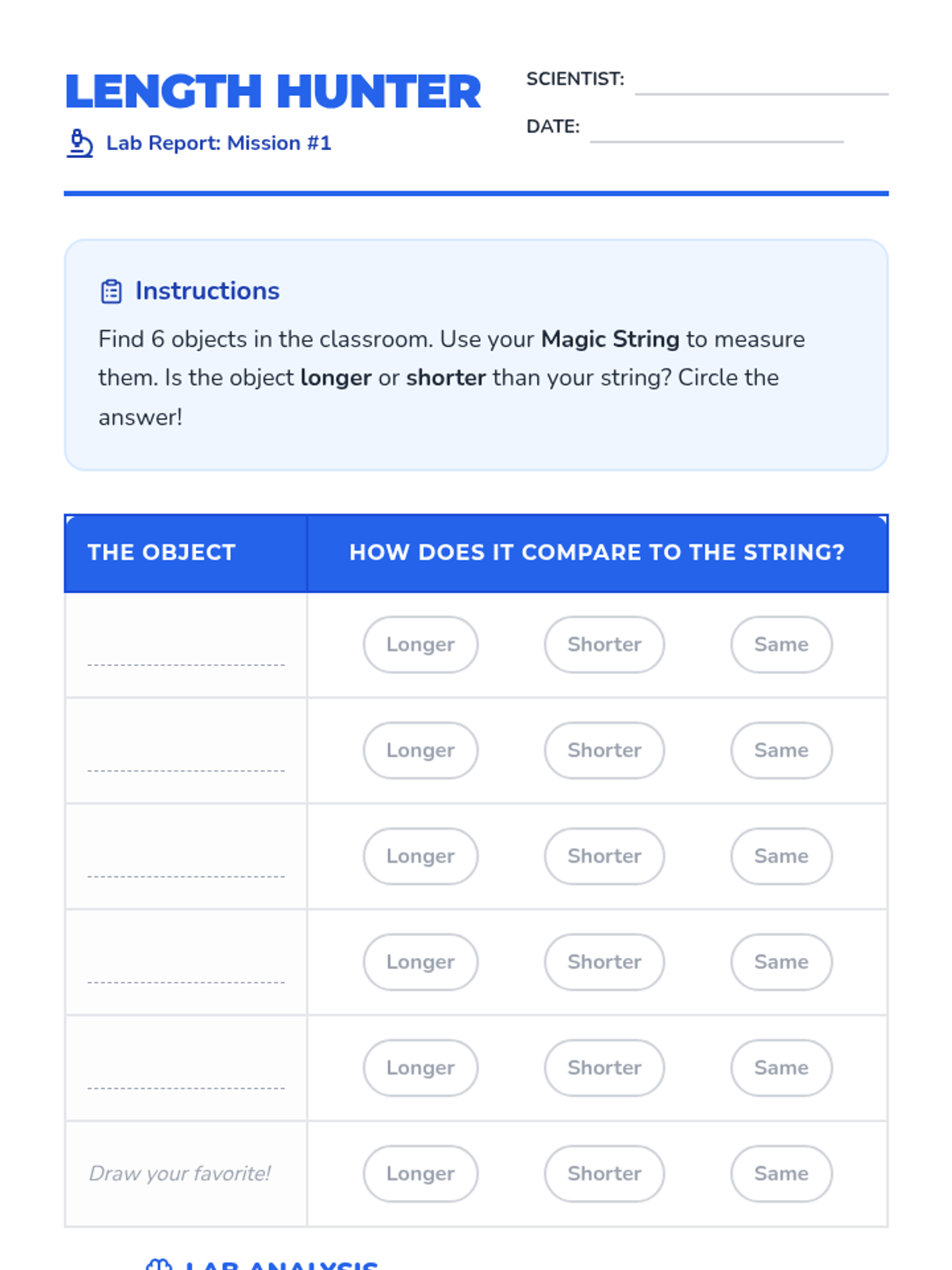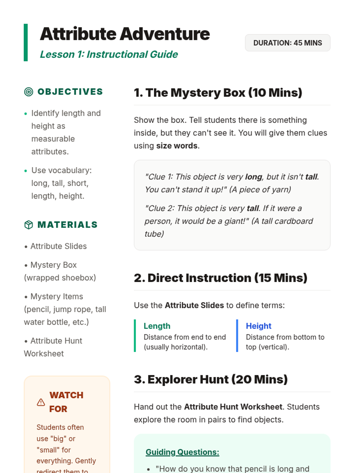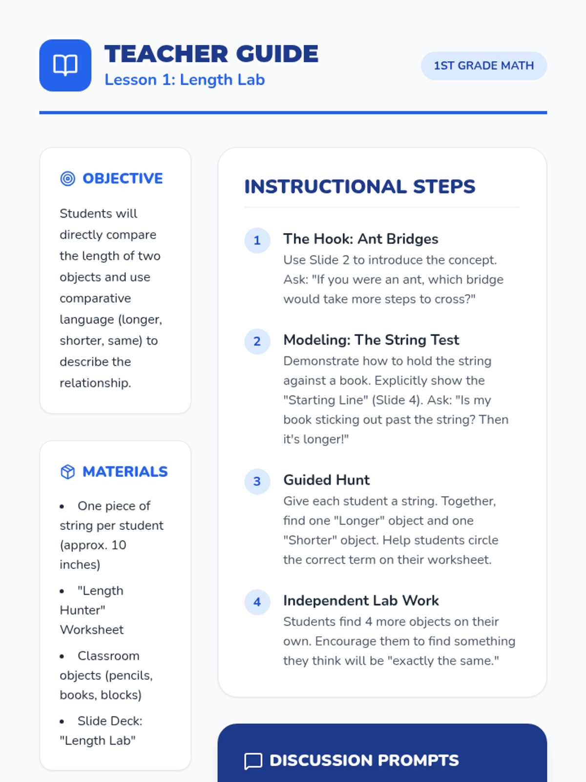 A foundational unit for 1st graders exploring the comparative language and logic of measurement. Students master direct and indirect comparison, ordering by attributes, and spatial reasoning before moving to standard units.