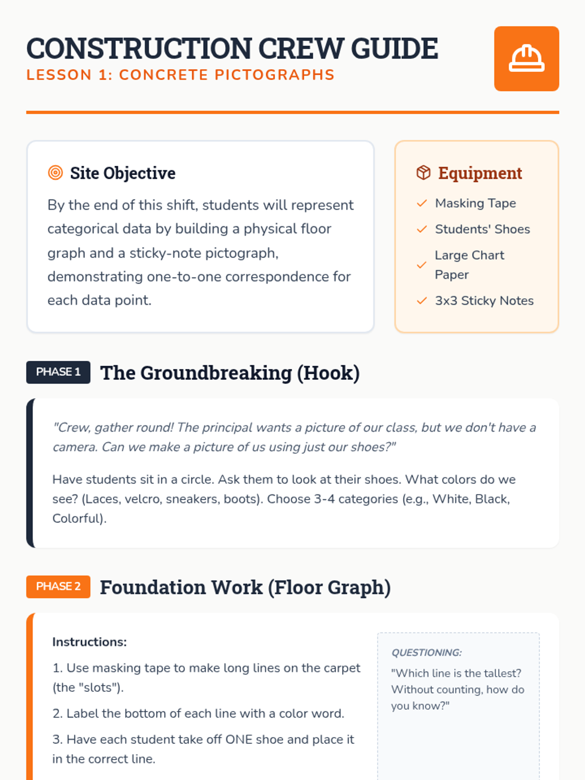 A construction-themed sequence where 1st graders learn to build and interpret pictographs and bar graphs through hands-on activities and visual representations.