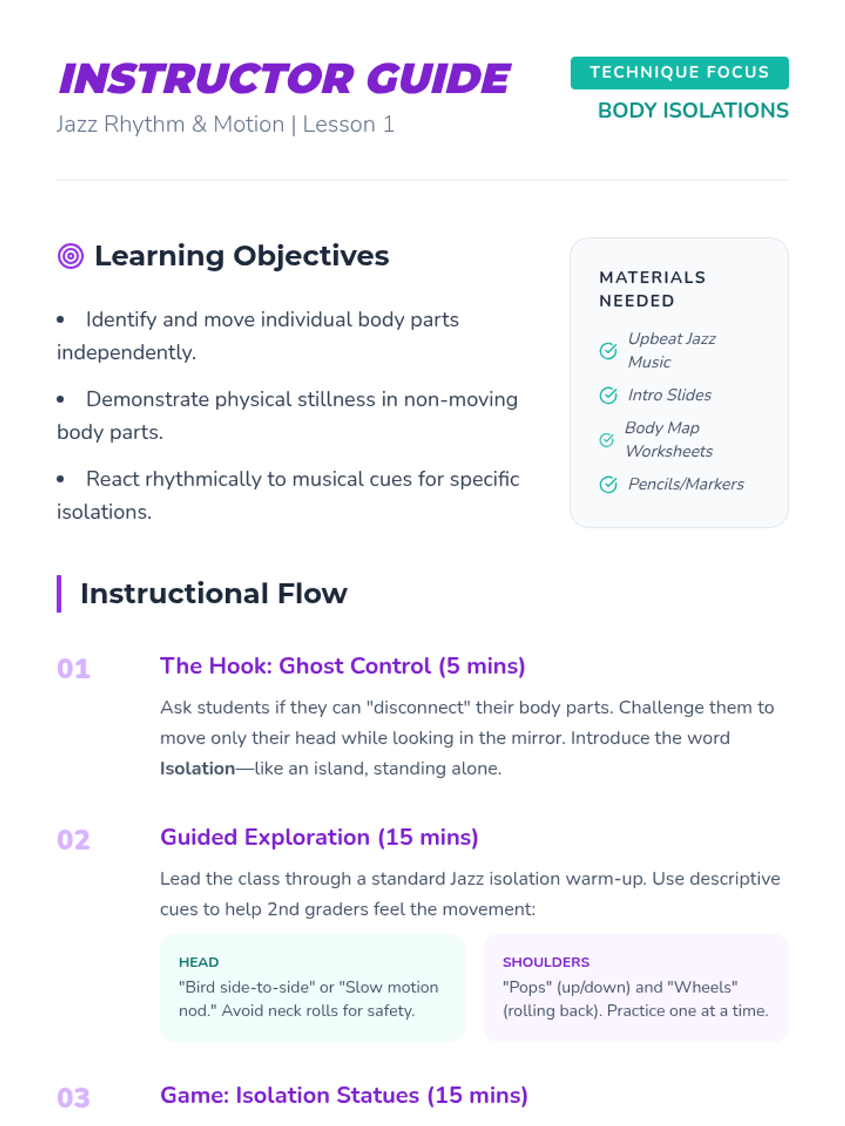 A 5-lesson sequence for 2nd graders focusing on jazz dance technique, including body isolations, locomotor movements like jazz walks and chassés, and expressive energy qualities.