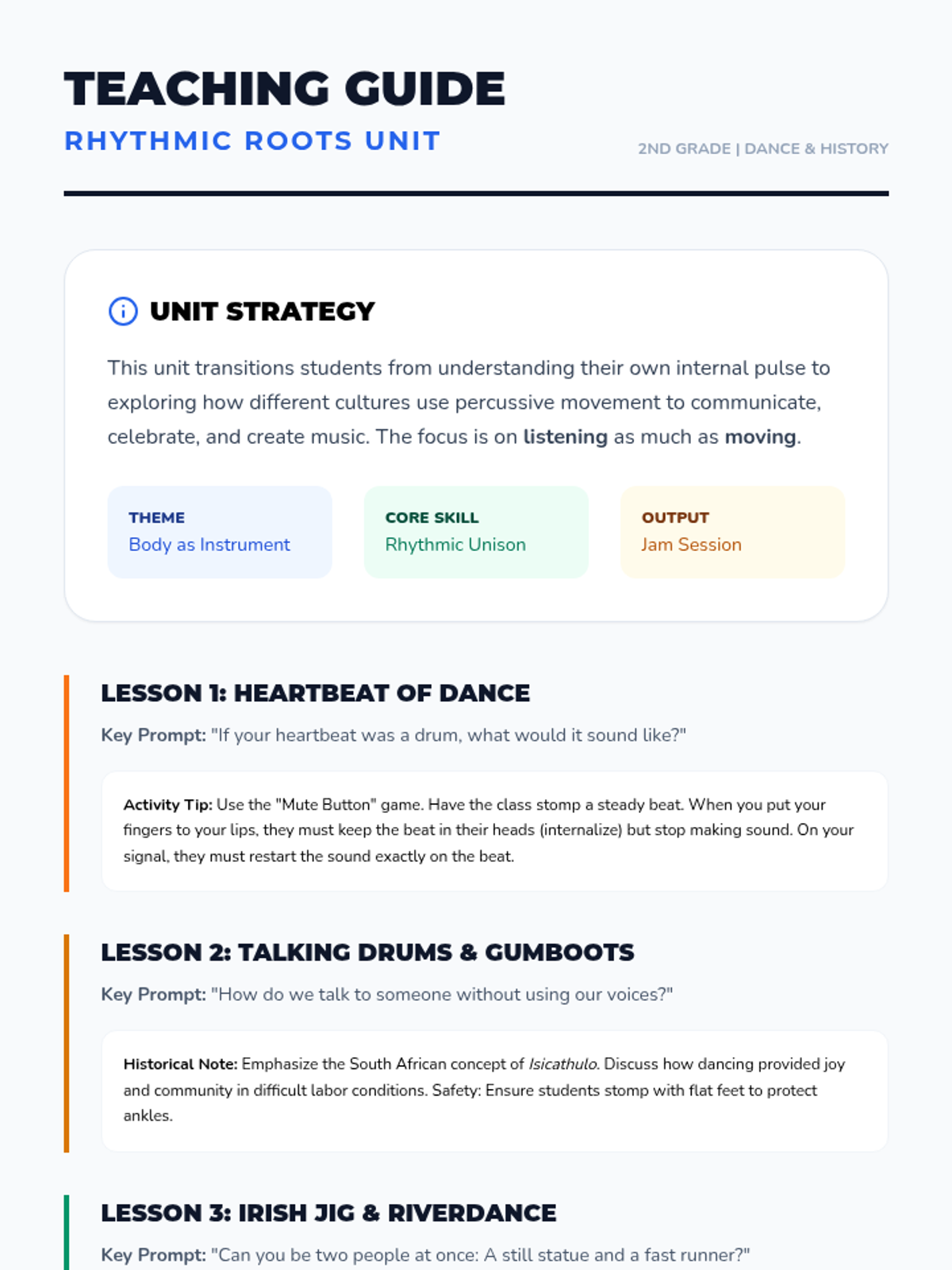 A 5-lesson unit for 2nd graders exploring the global history of percussive dance, from African and Irish roots to American Tap, focusing on how dancers use their bodies as musical instruments.