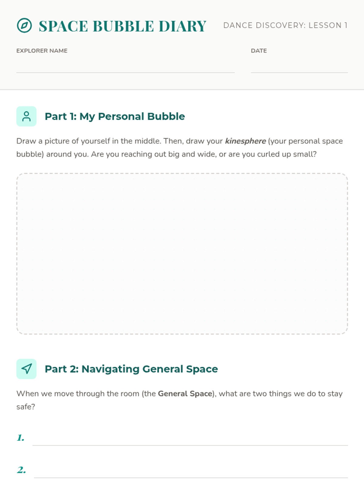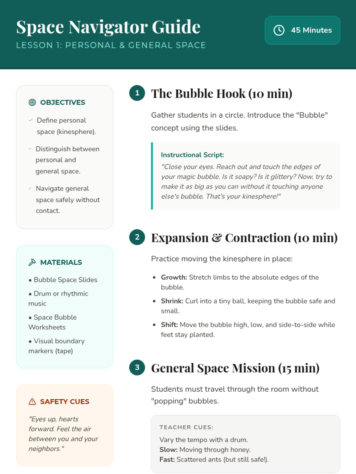 A 2nd Grade dance sequence focused on contemporary dance concepts of spatial awareness, floor pathways, and transitions. Students explore personal vs. general space, geometric pathways, floor-to-standing transitions, and safe jumping techniques through an inquiry-based explorer theme.