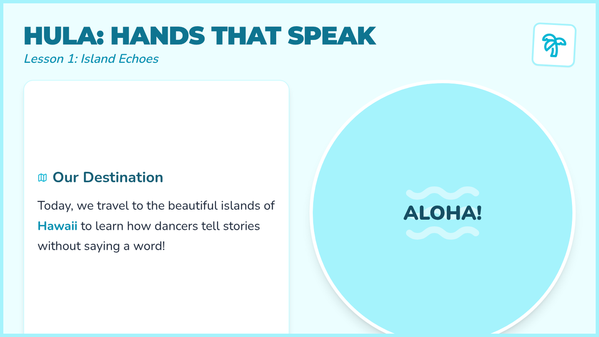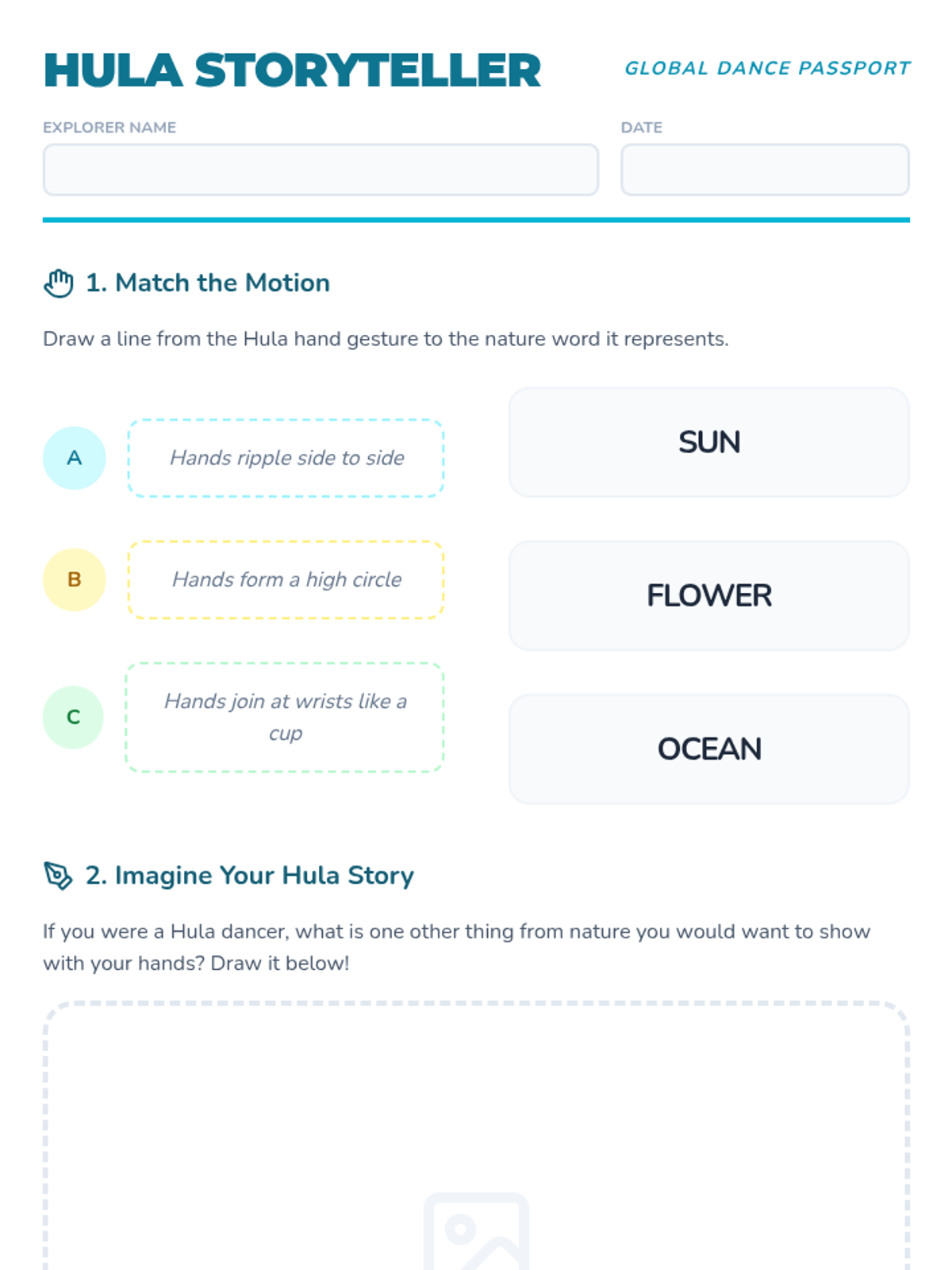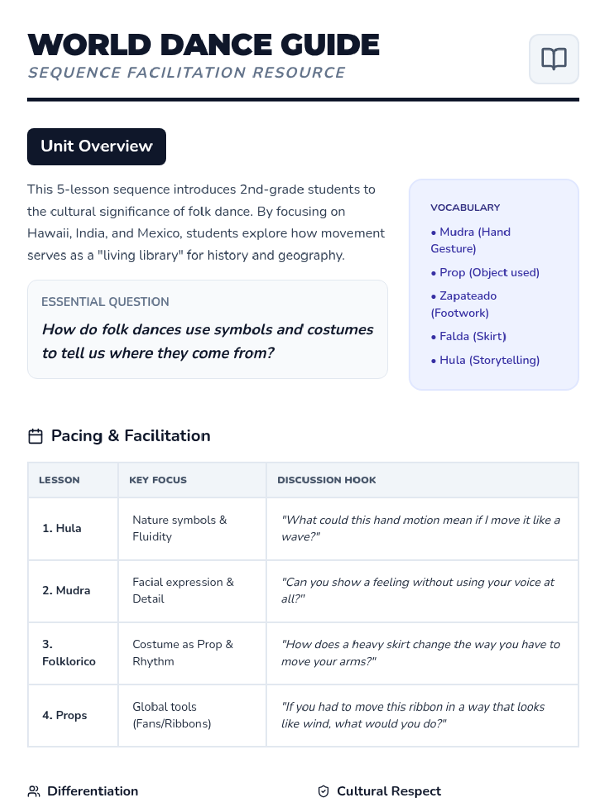 A 2nd-grade dance sequence exploring how folk dances from Hawaii, India, and Mexico use props, costumes, and gestures to tell cultural stories and connect with geography.
