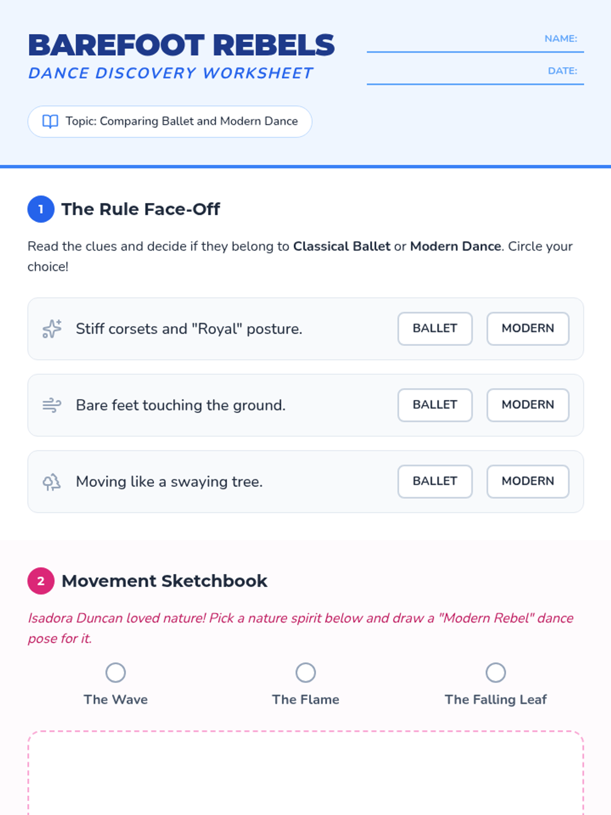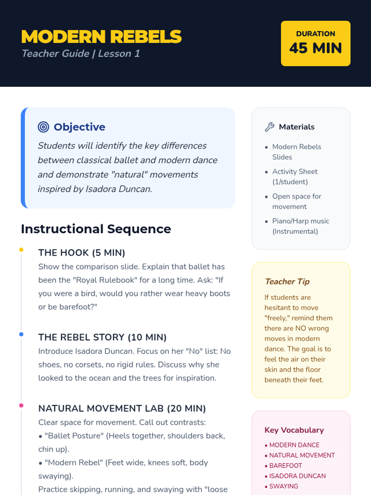 A 5-lesson unit for 2nd graders exploring the evolution of dance from classical ballet to modern, jazz, and hip hop, emphasizing rule-breaking, emotional expression, and cultural history.