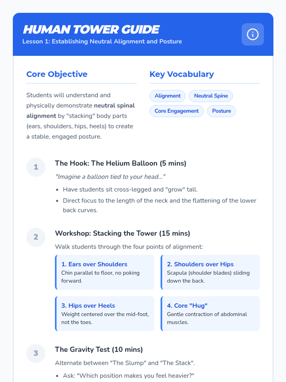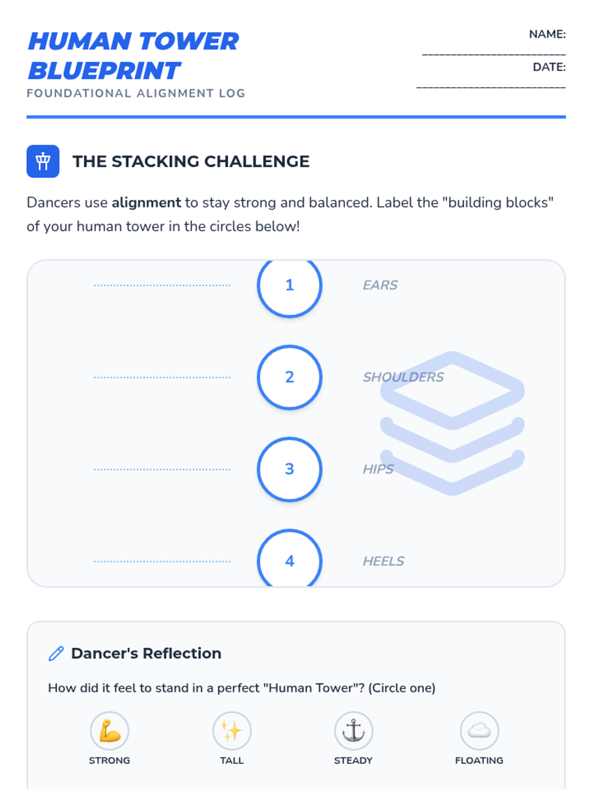 A dance technique sequence for 2nd graders focusing on body alignment, balance, and foundational ballet movements. Students learn to 'stack' their skeletal structure for stability and grace.