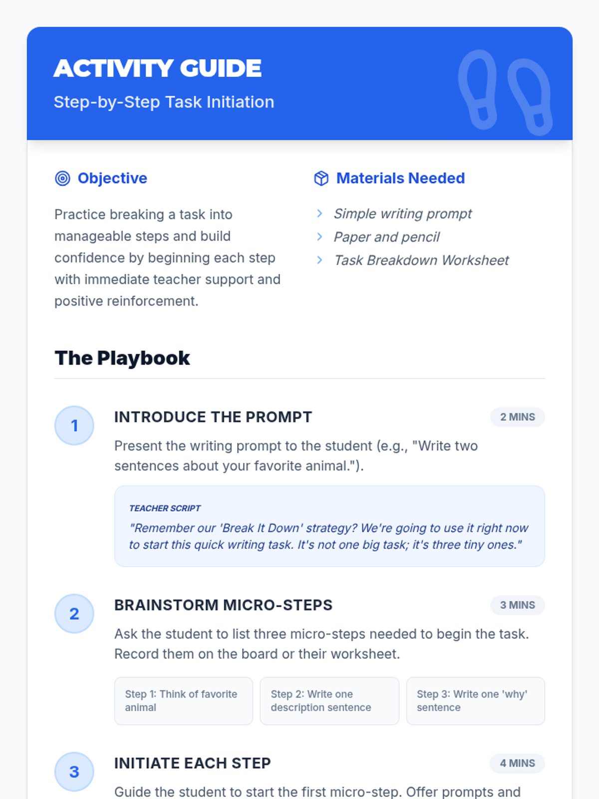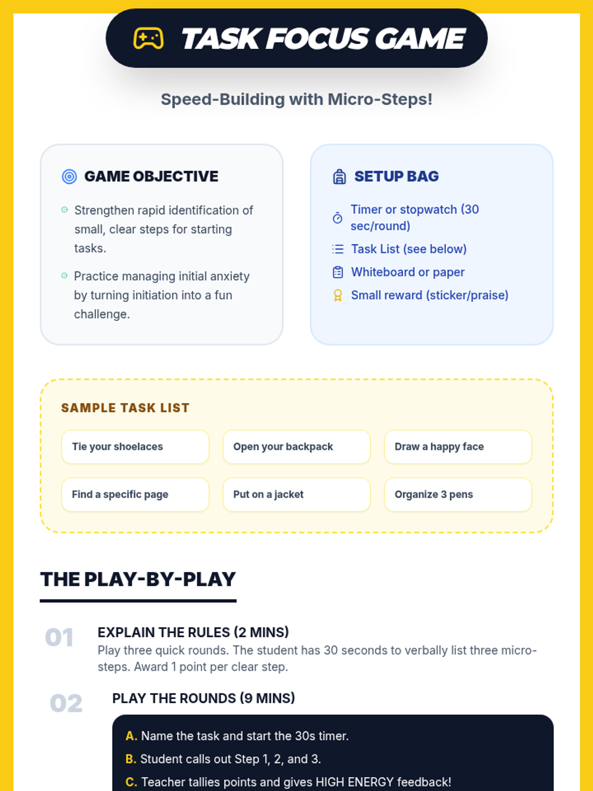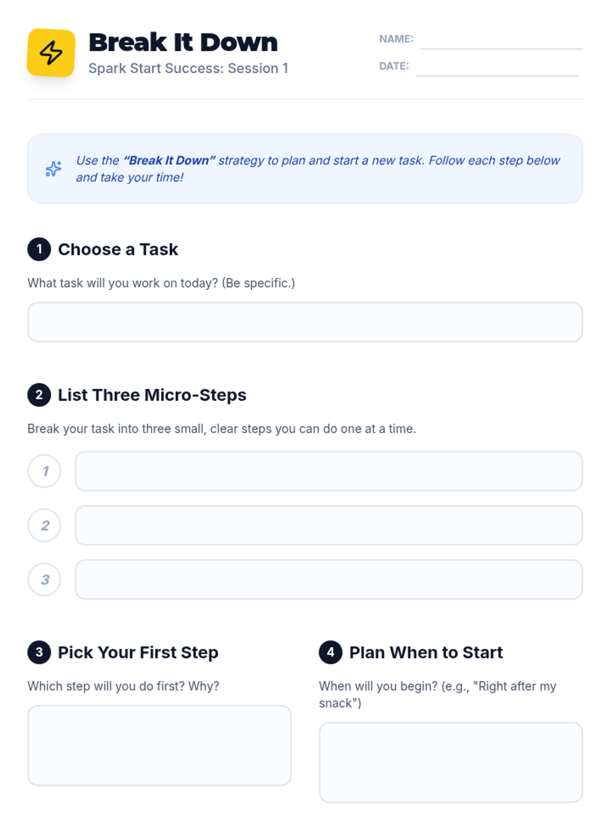 A 4-session individual support series designed to help students overcome anxiety and build the skills needed to independently initiate and complete academic tasks through structured strategies and playful engagement.