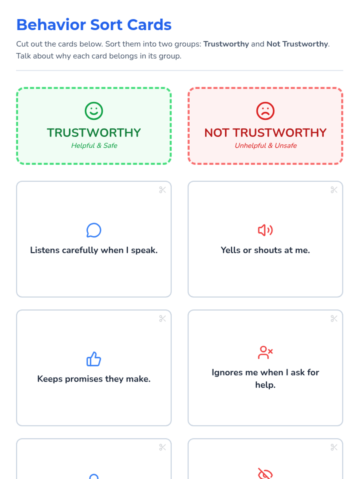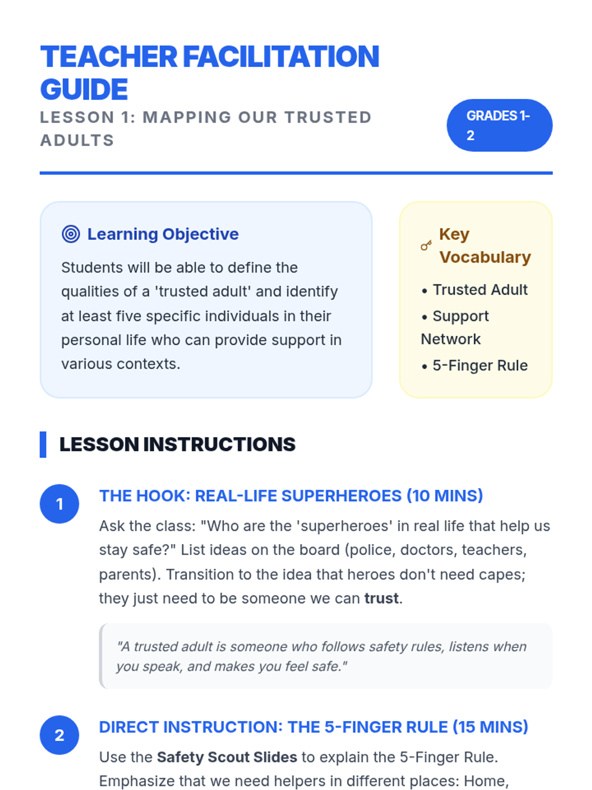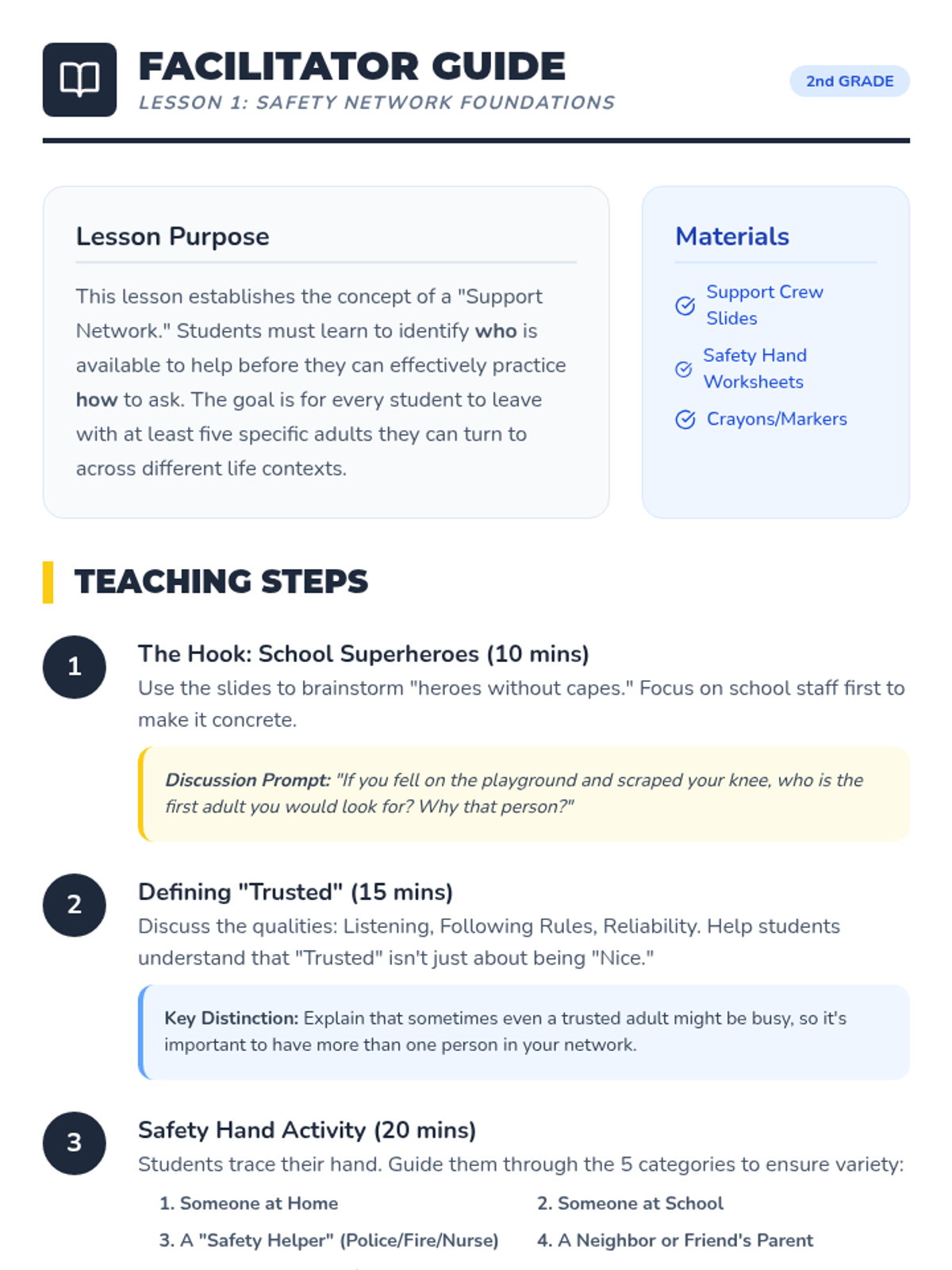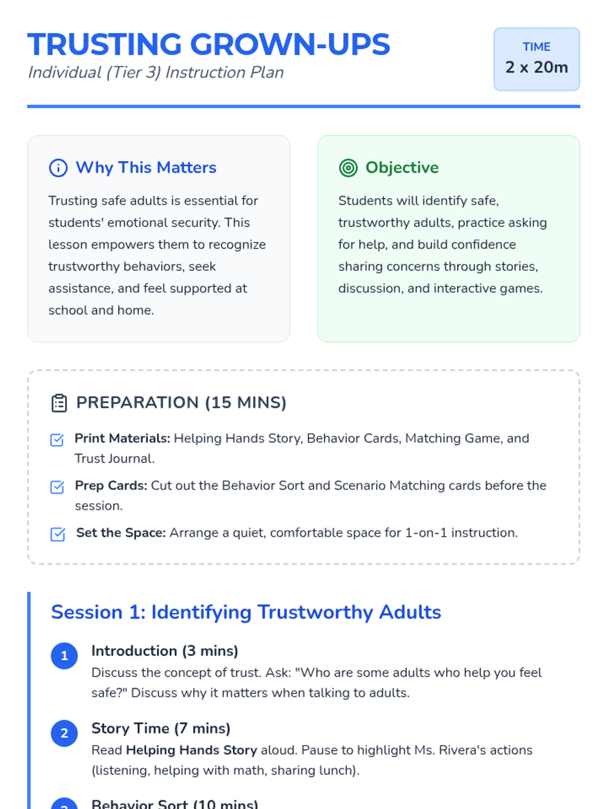 A two-session mini-unit designed for individual Tier 3 instruction to help 2nd grade students identify trustworthy adult behaviors, practice seeking help, and build emotional security.