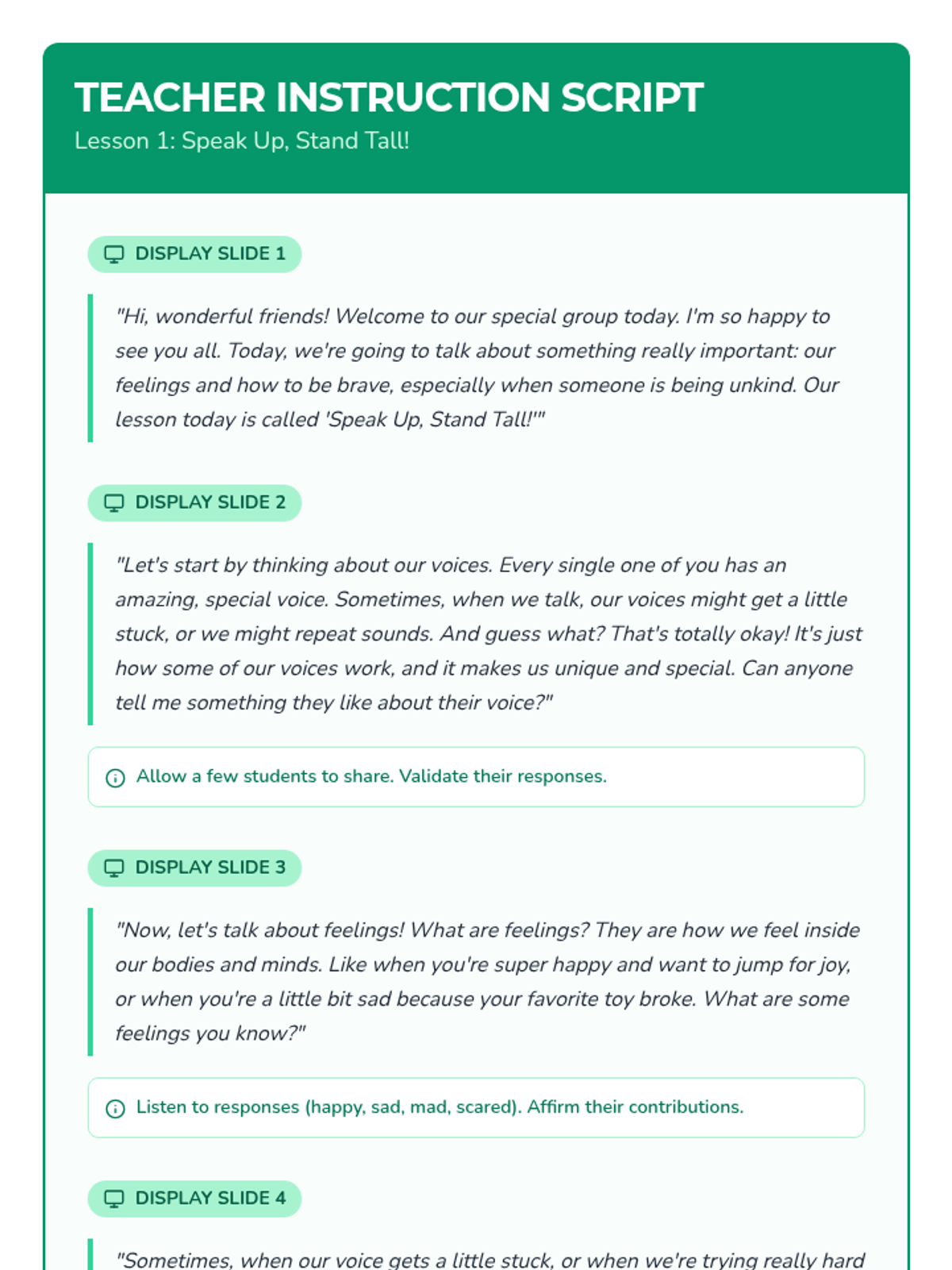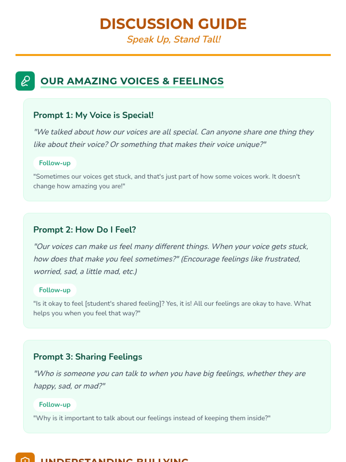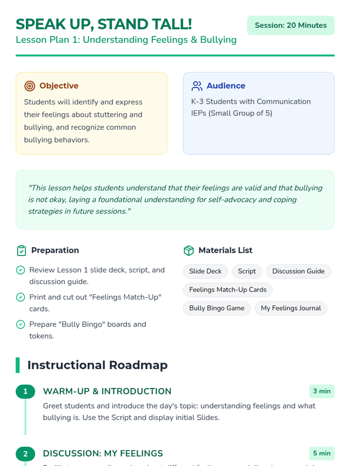 A six-lesson series for K-3 students with communication IEPs, specifically those who stutter. The sequence focuses on defining bullying, identifying feelings, building self-advocacy through brave words and I-statements, and fostering empathy to become upstanders.