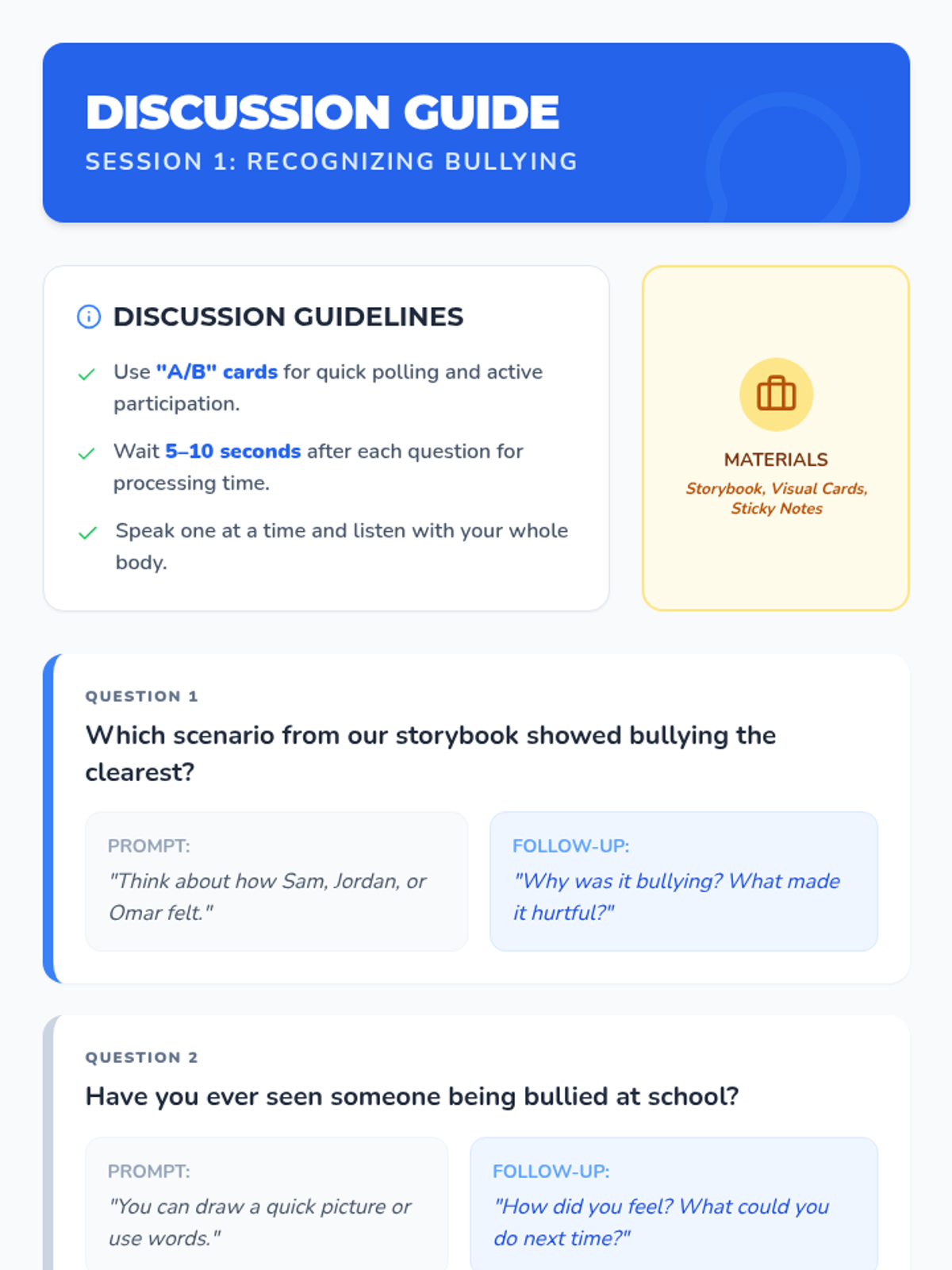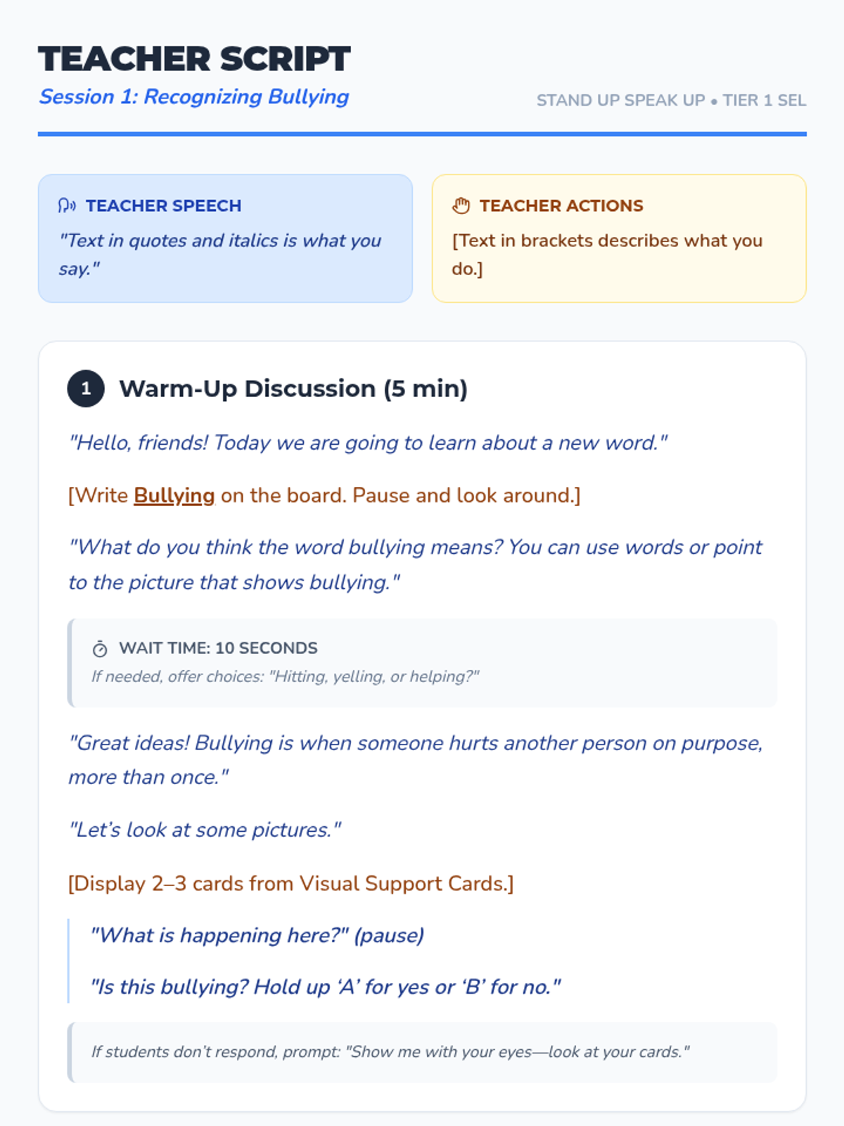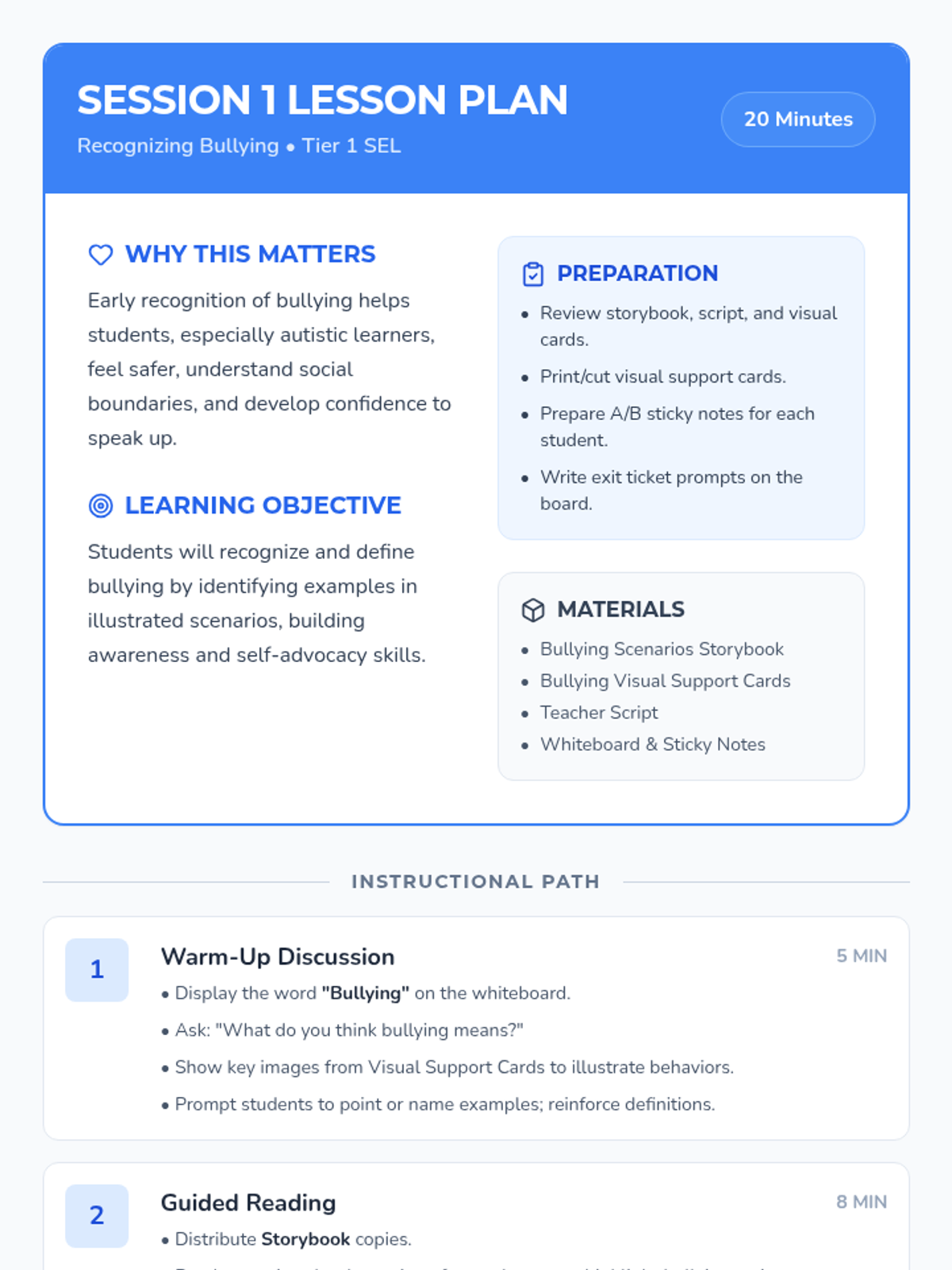 A three-session Tier 1 SEL sequence designed for autistic students to recognize, prevent, and respond to bullying through visual supports, clear scripts, and interactive scenarios.