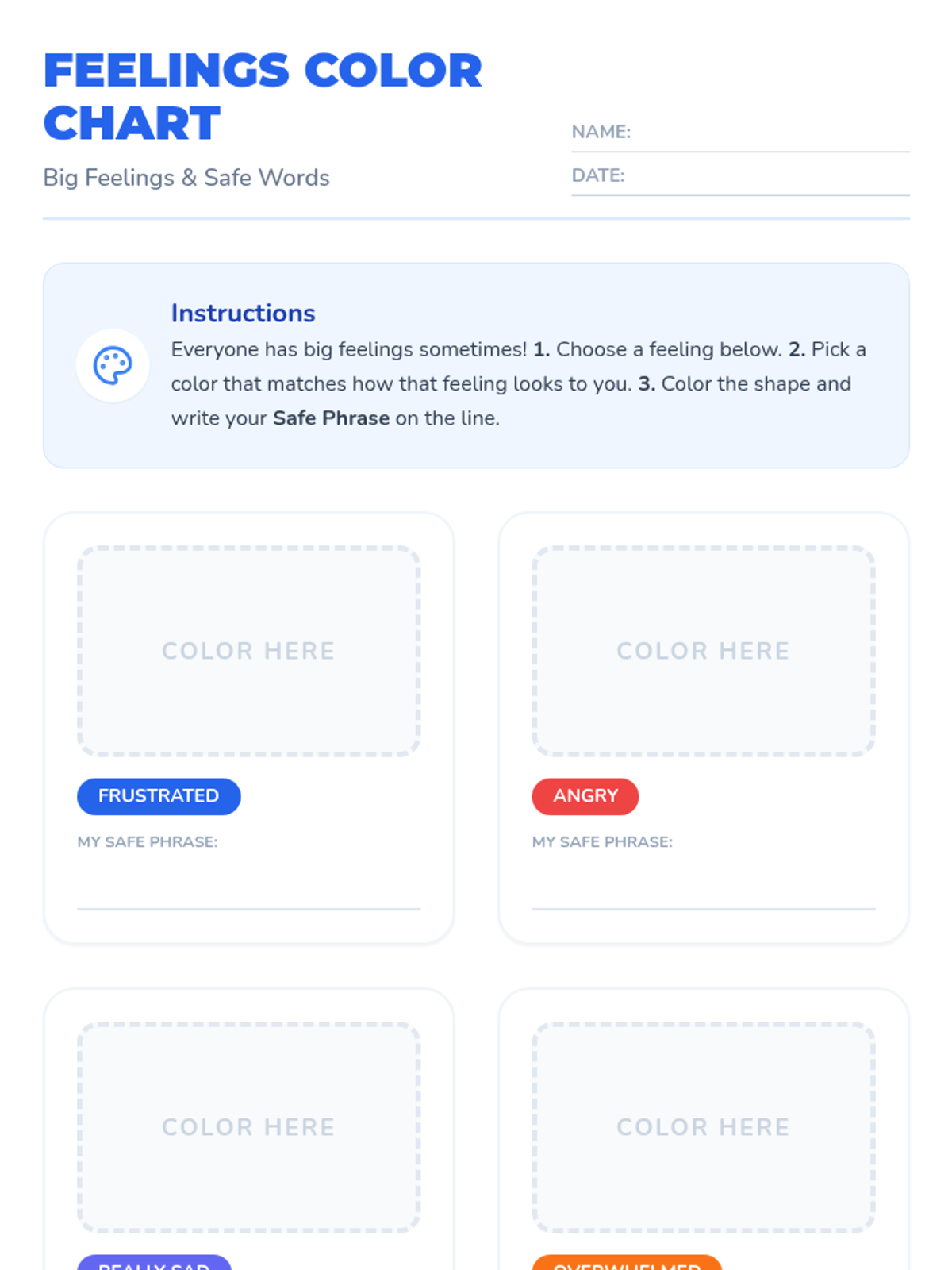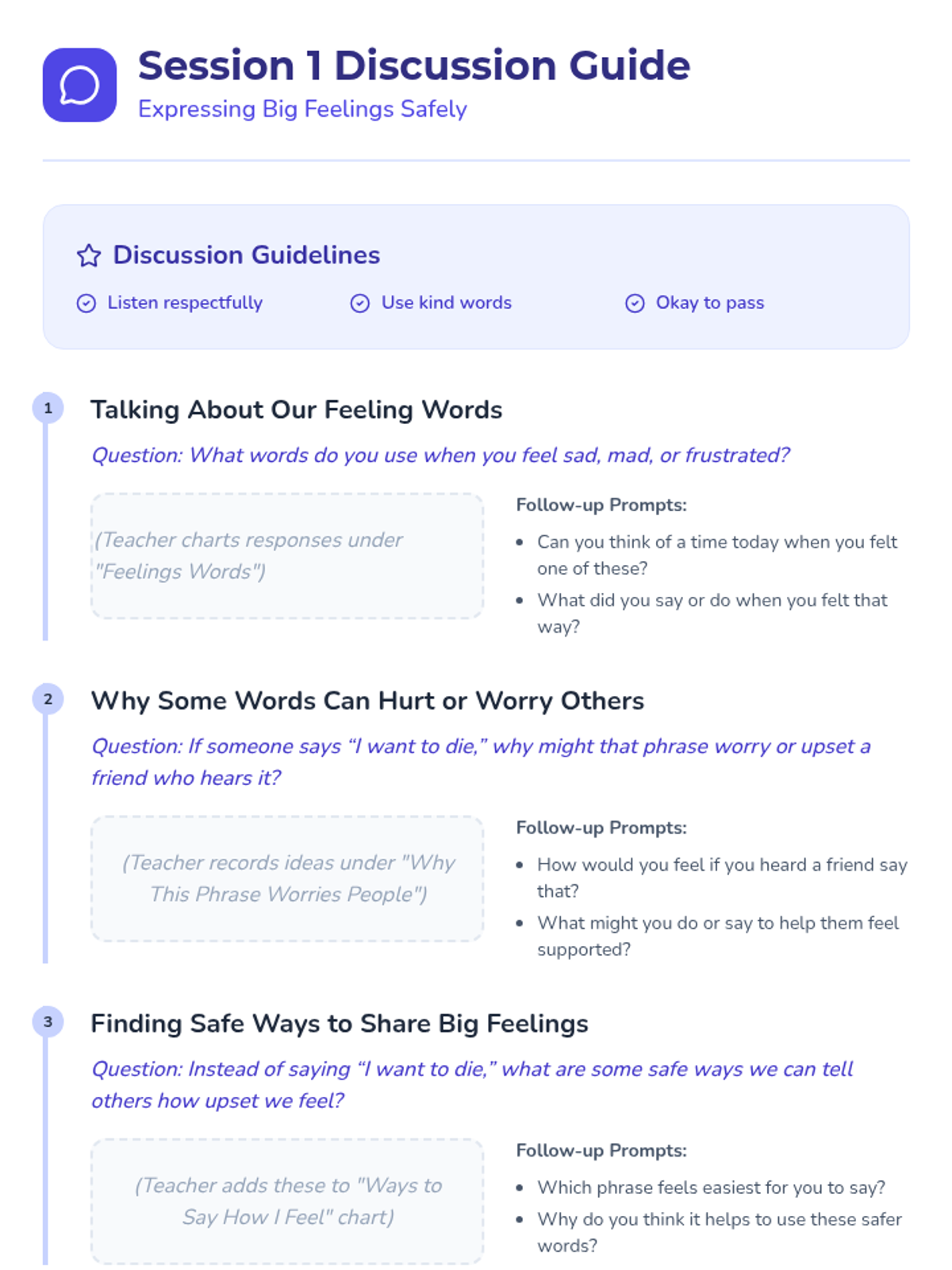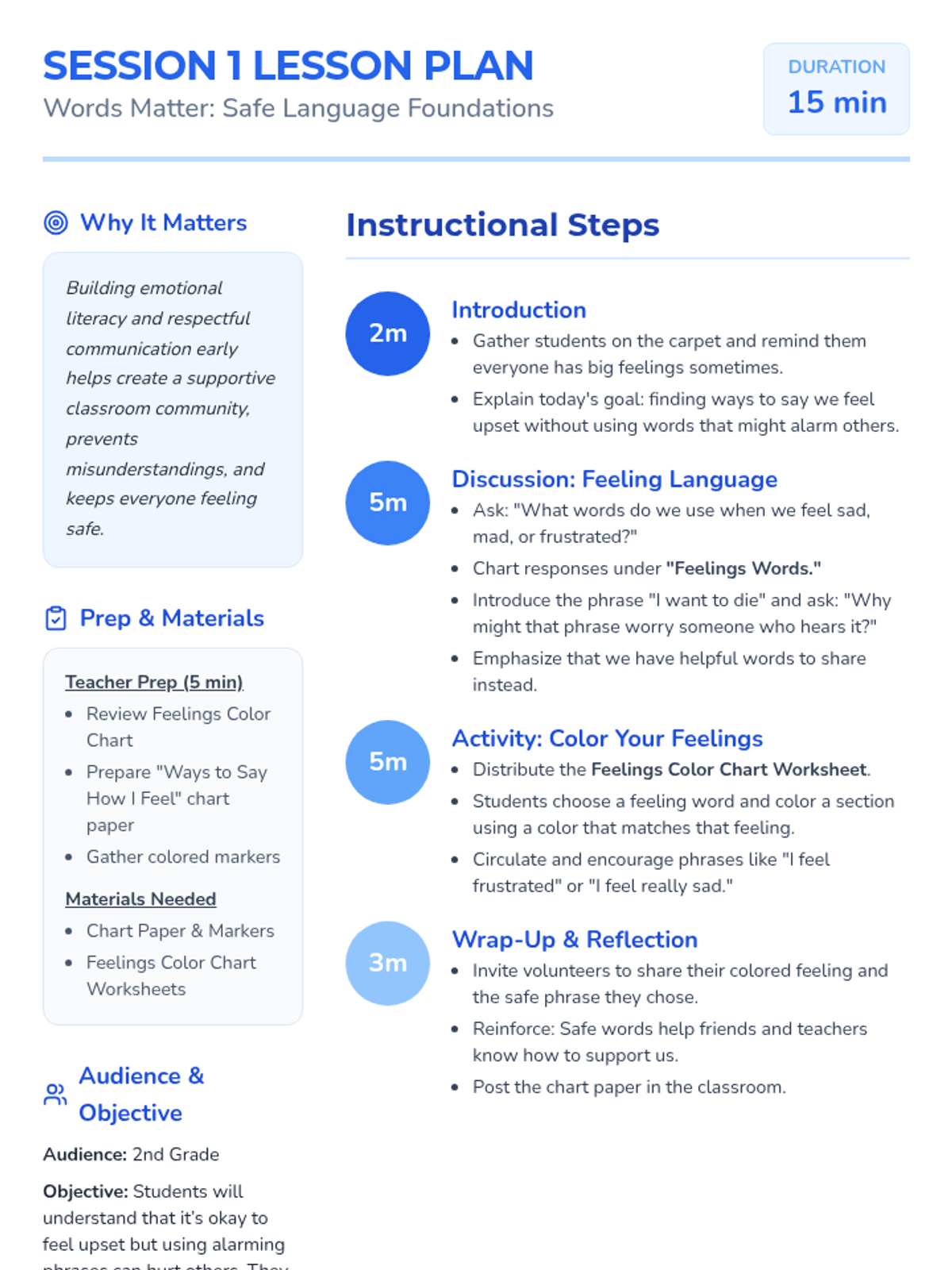 A 2-session Tier 1 classroom lesson sequence for second graders focused on emotional literacy. Students learn why certain phrases can be alarming and practice using safe, respectful language to express big feelings and support their peers.