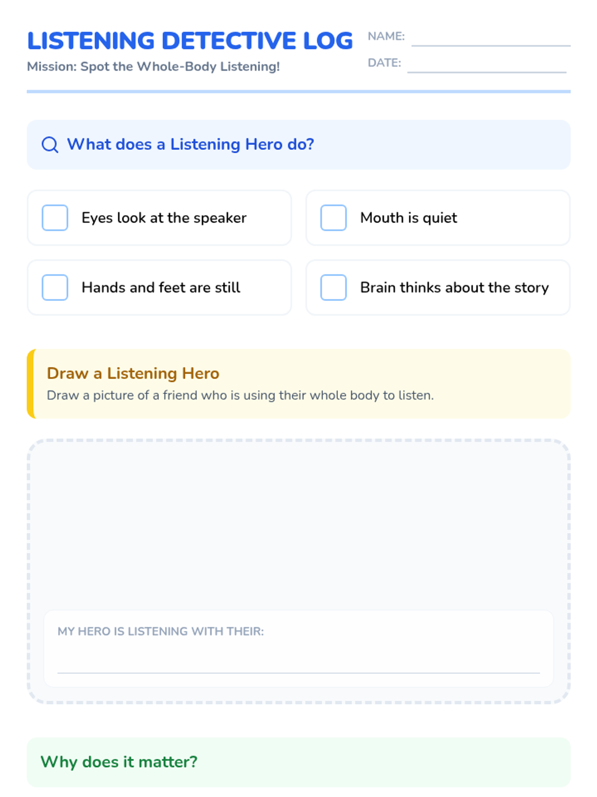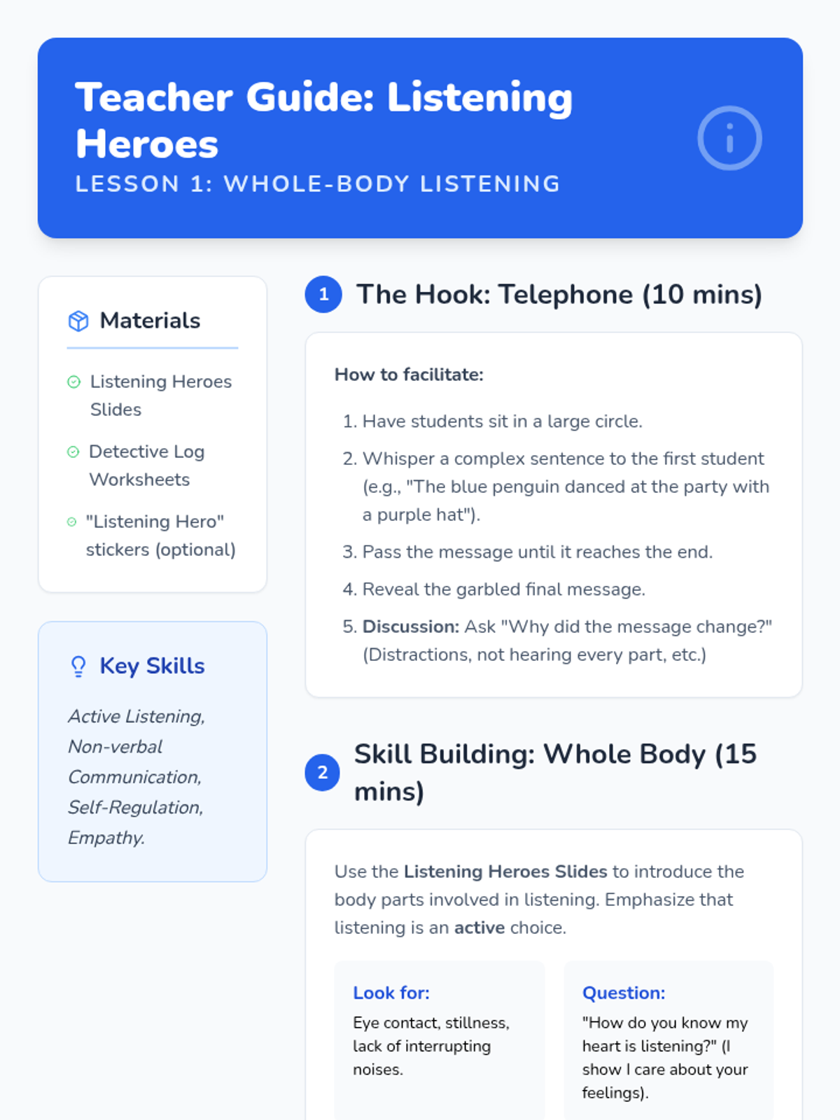 This sequence teaches 2nd-grade students the essential skills for participating in a supportive sharing group, focusing on active listening, empathy, boundary setting, and kind responses.