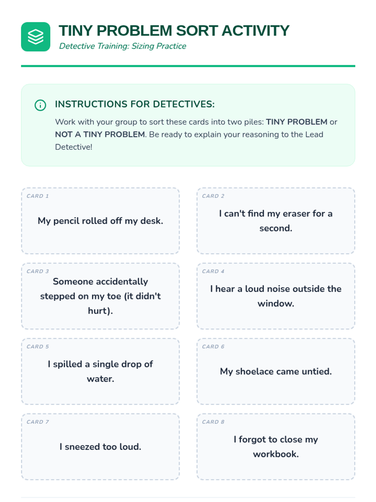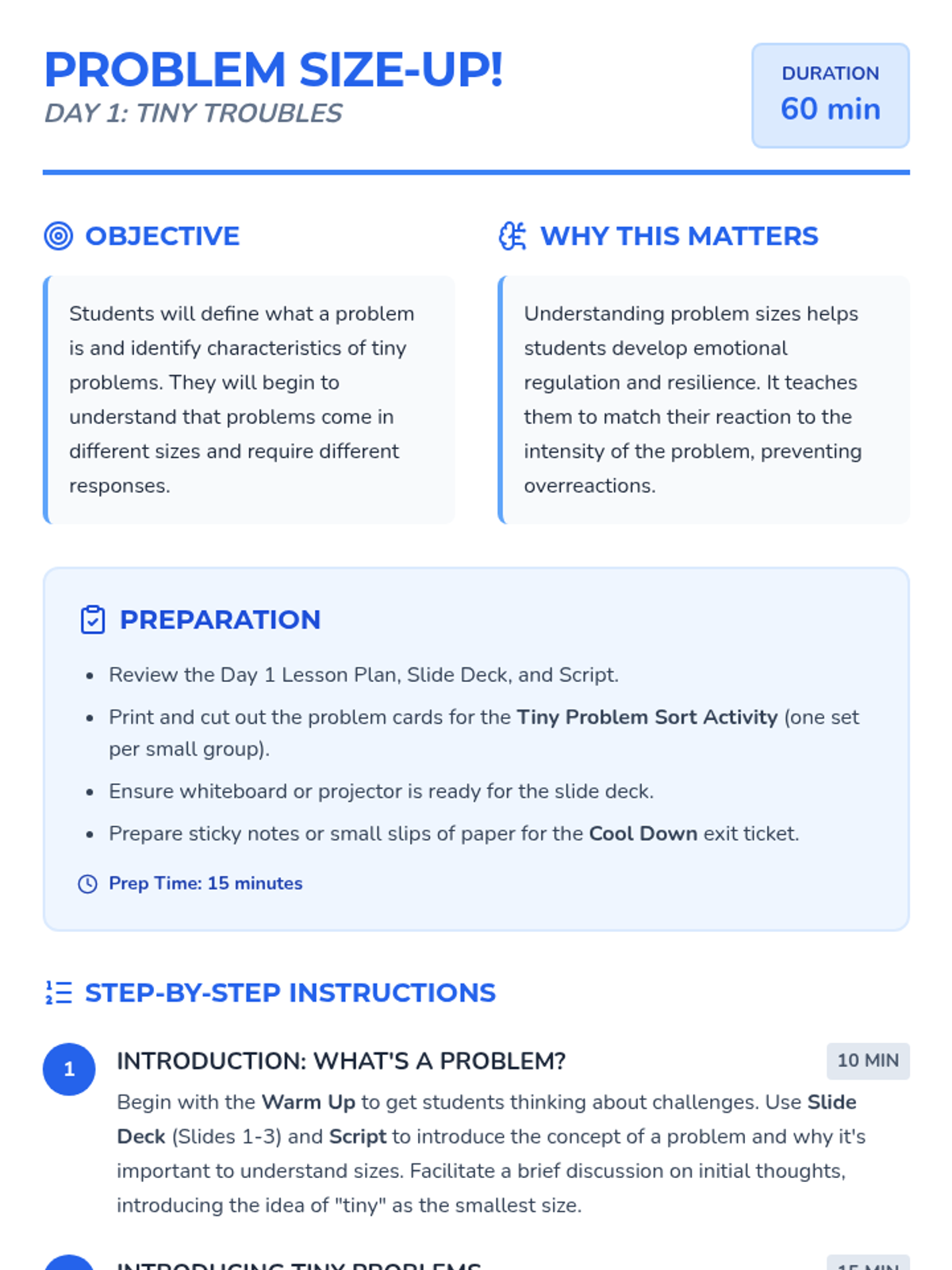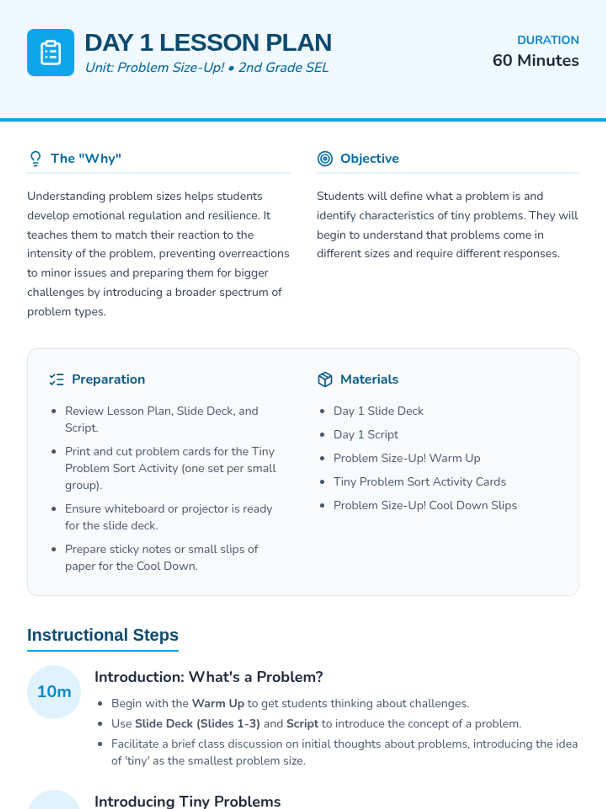 A 4-day Social-Emotional Learning unit for 2nd-grade students to identify problem sizes (tiny to huge) and match appropriate coping strategies. Students learn through sorting activities, games, and scenario practice.