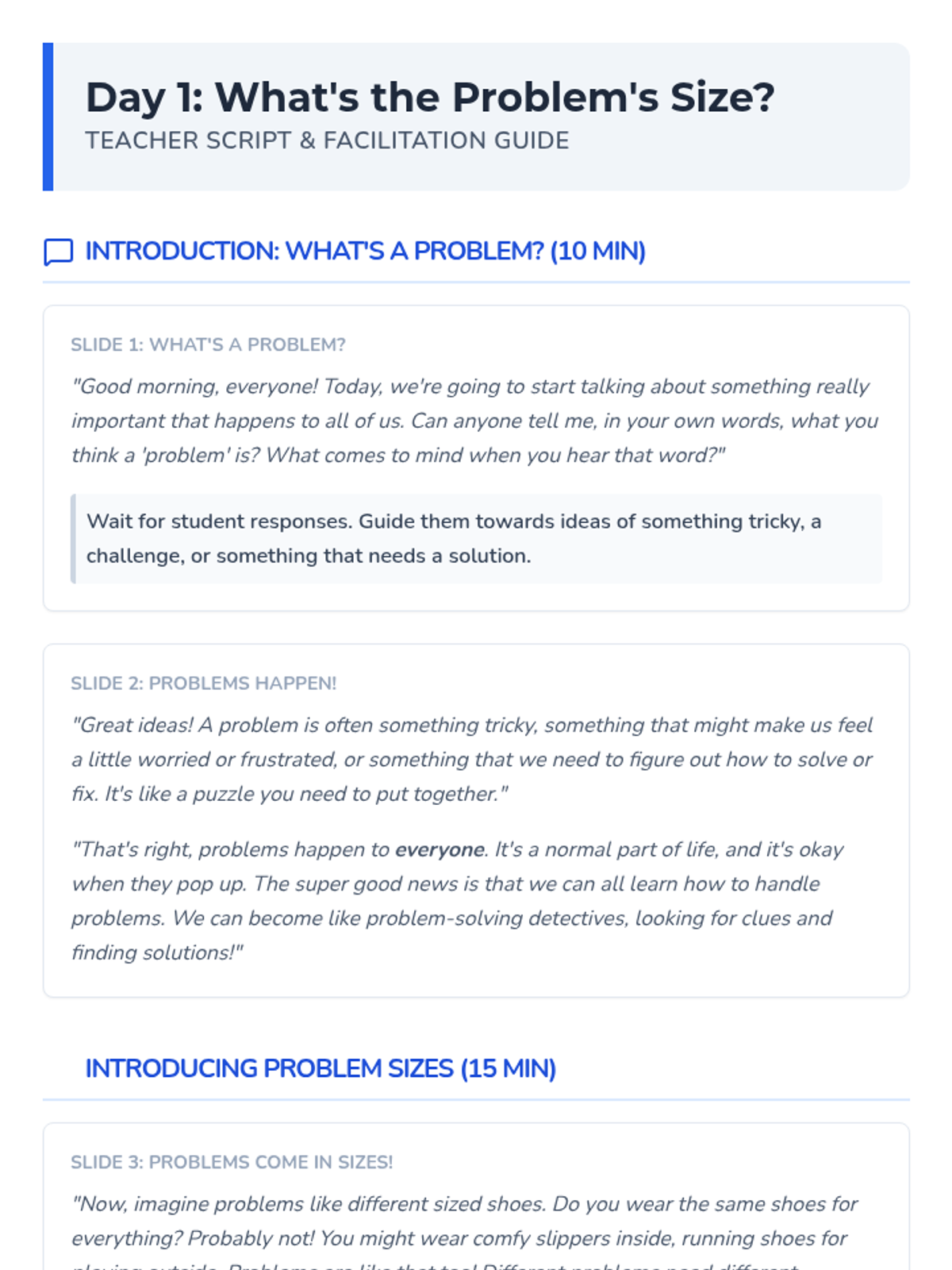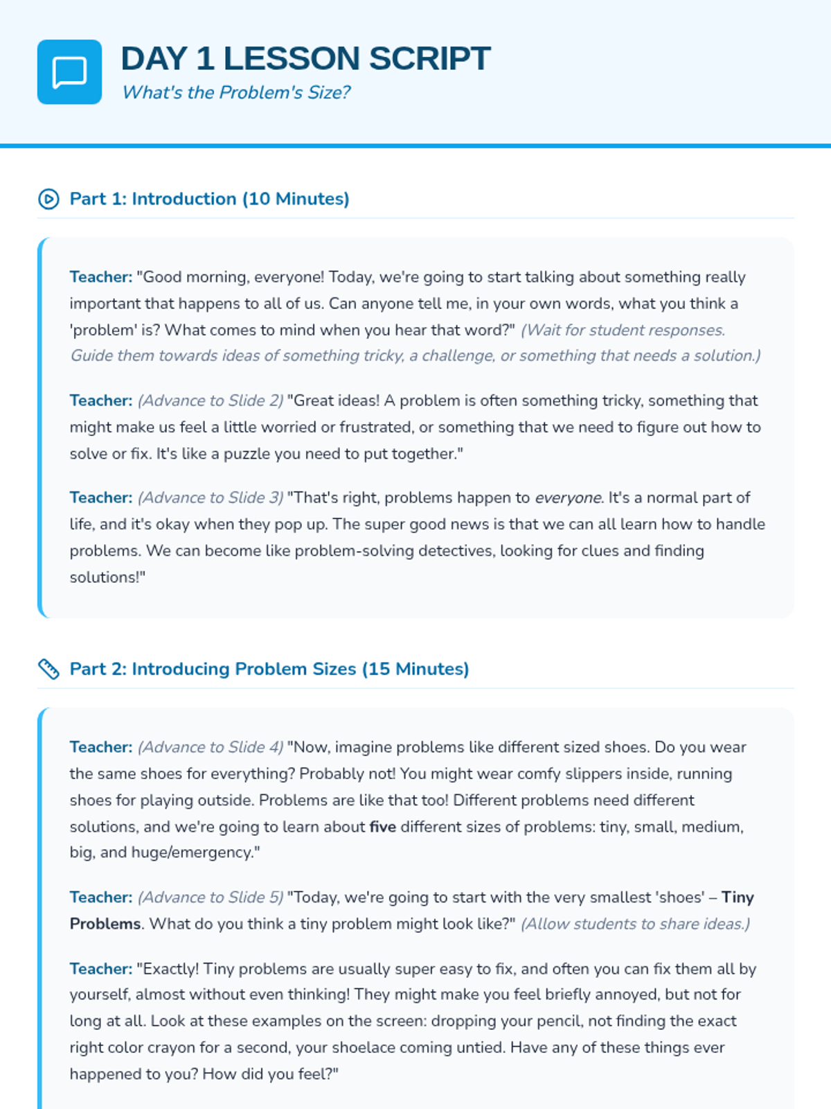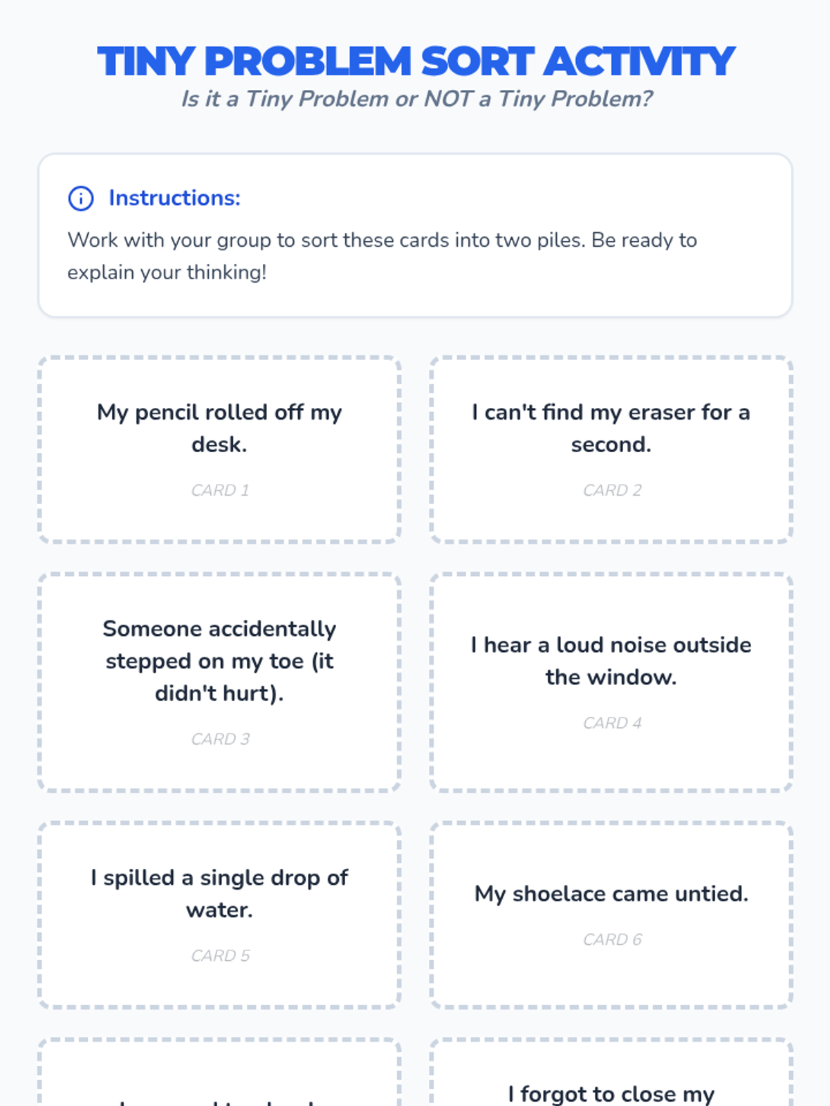 A 4-day Social-Emotional Learning unit for 2nd-grade students to identify problem sizes (tiny to huge) and match appropriate coping strategies. Students learn through sorting activities, games, and scenario practice.