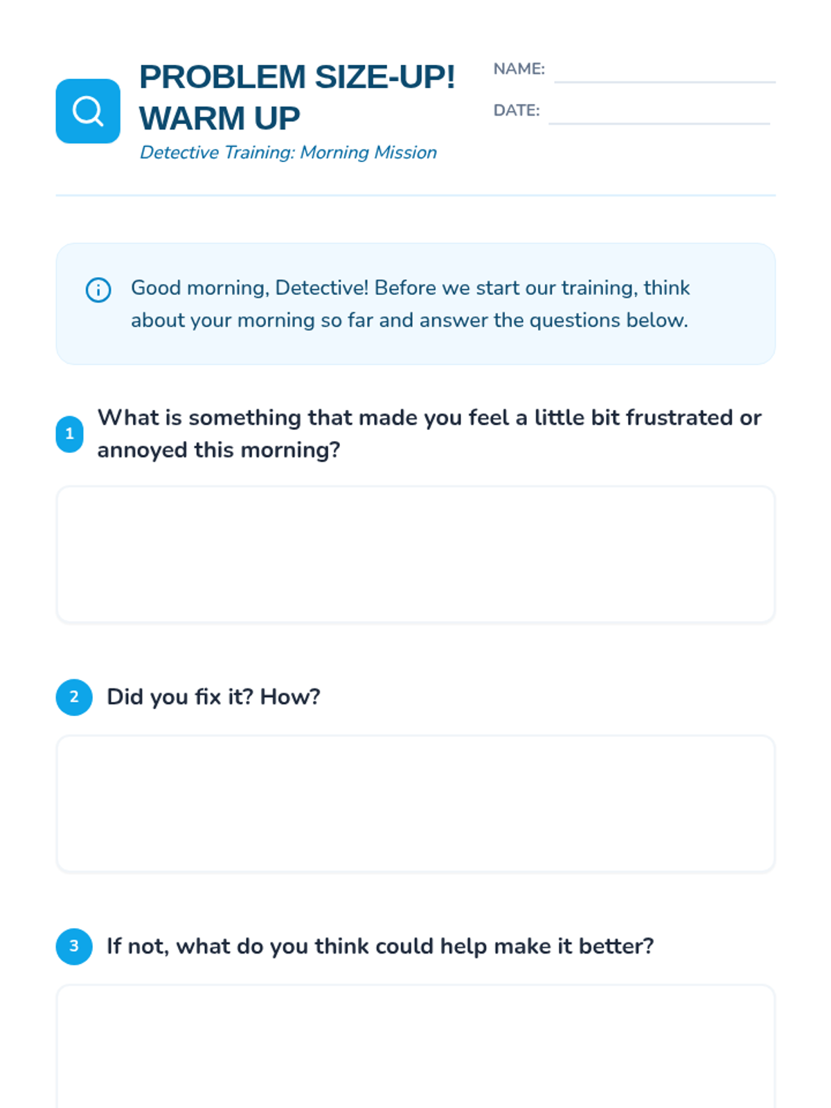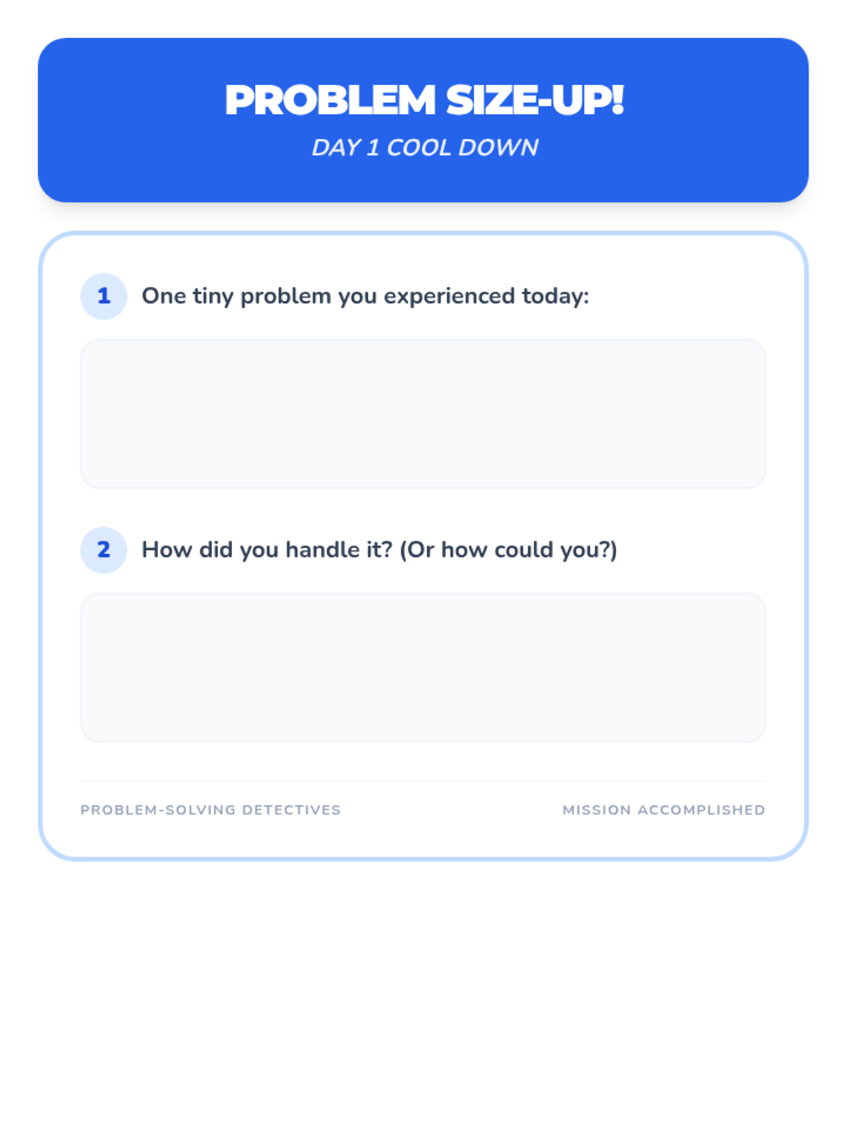 A 4-day SEL unit for 2nd grade focusing on identifying problem sizes (tiny to huge) and matching reactions to those sizes. Students use a detective theme to learn emotional regulation and appropriate problem-solving strategies.