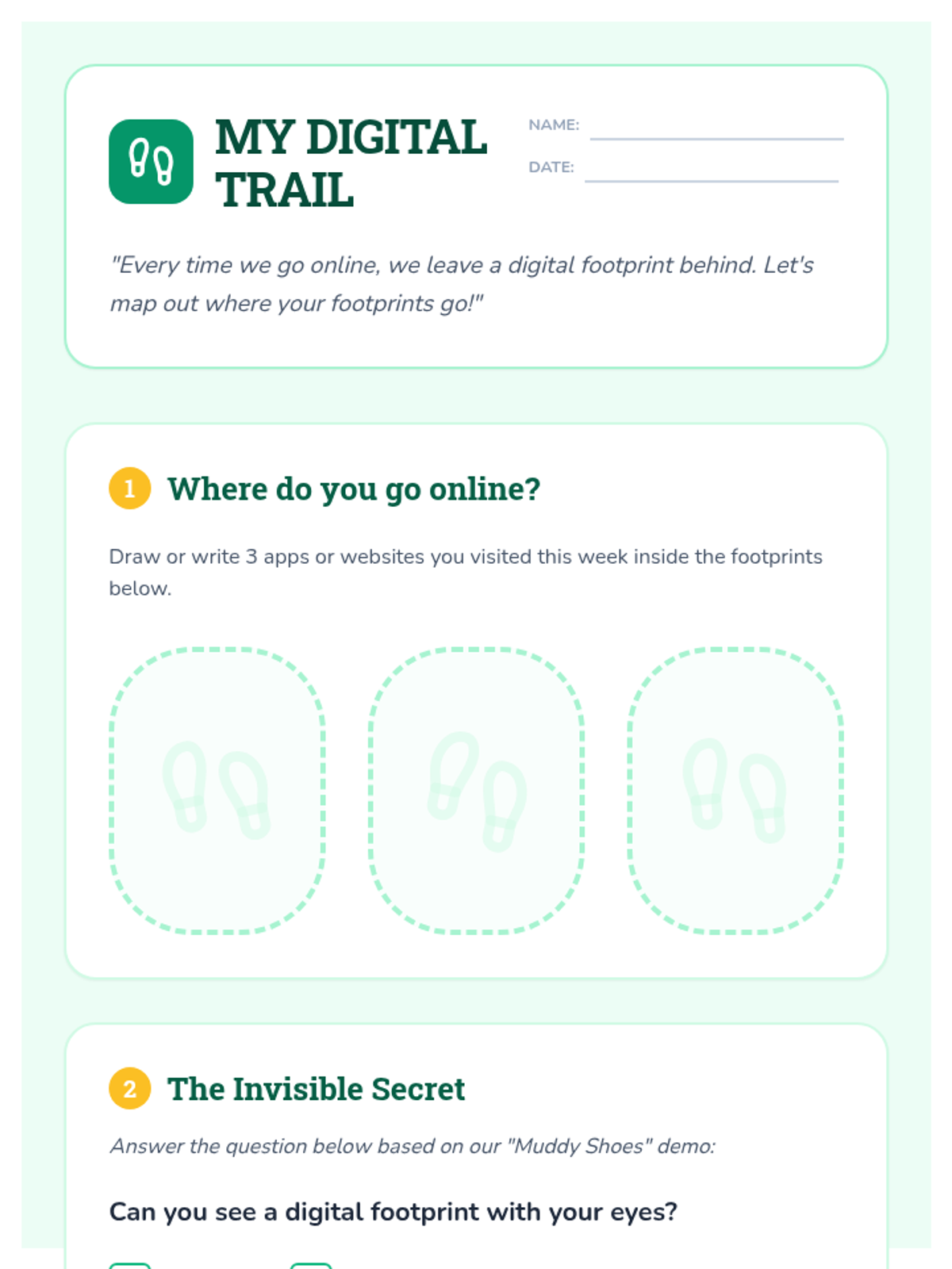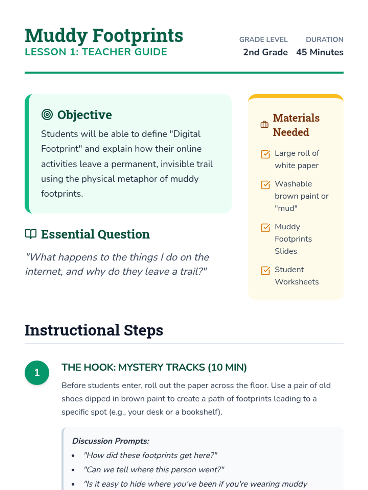 This sequence introduces 2nd graders to the concept of digital footprints, the permanence of the internet, and healthy media balance using concrete metaphors and a 'Nature Trail' theme.