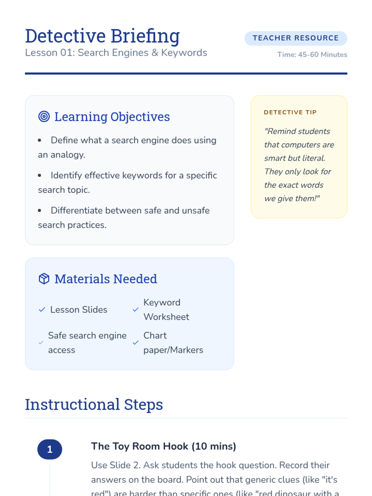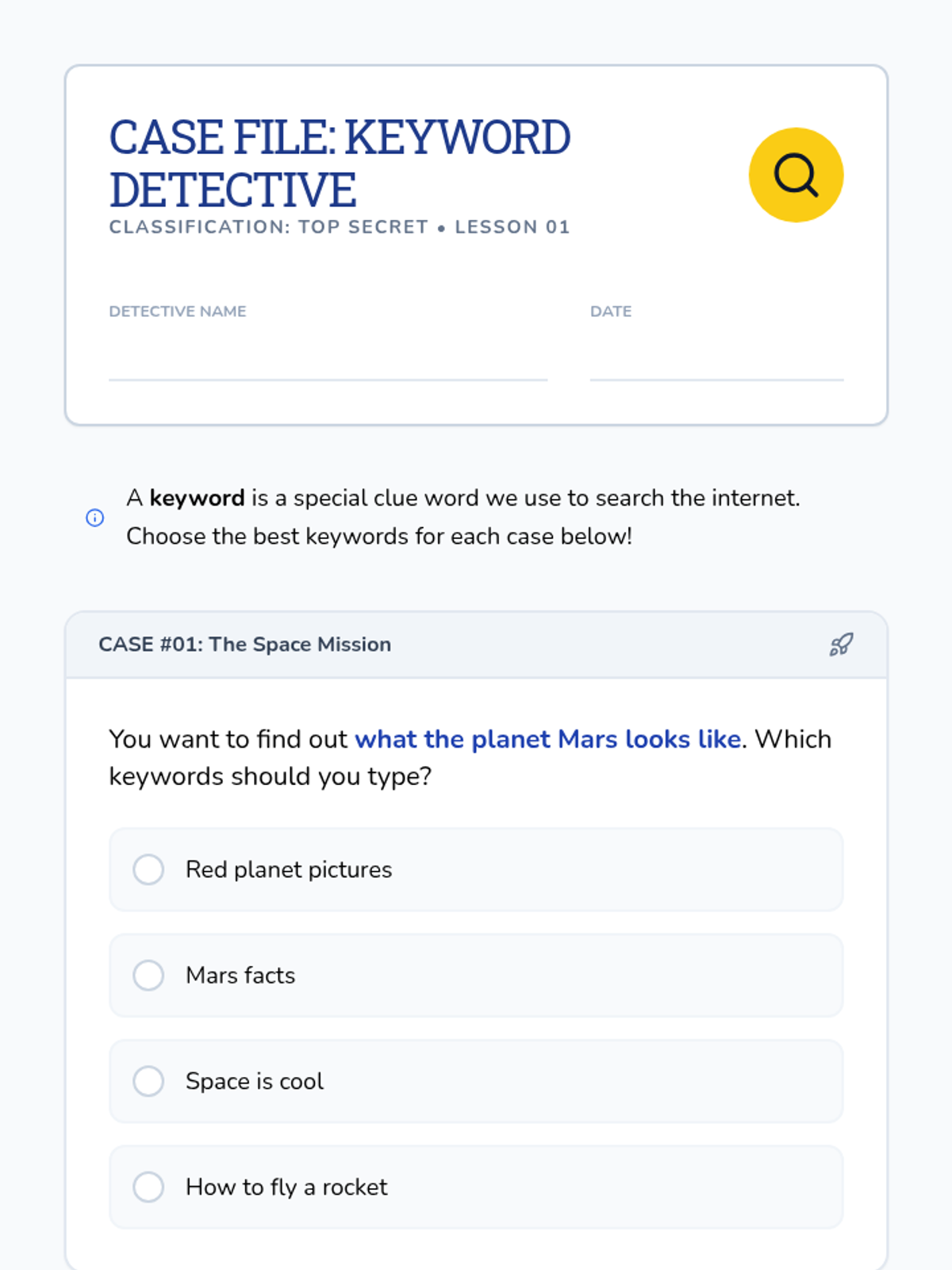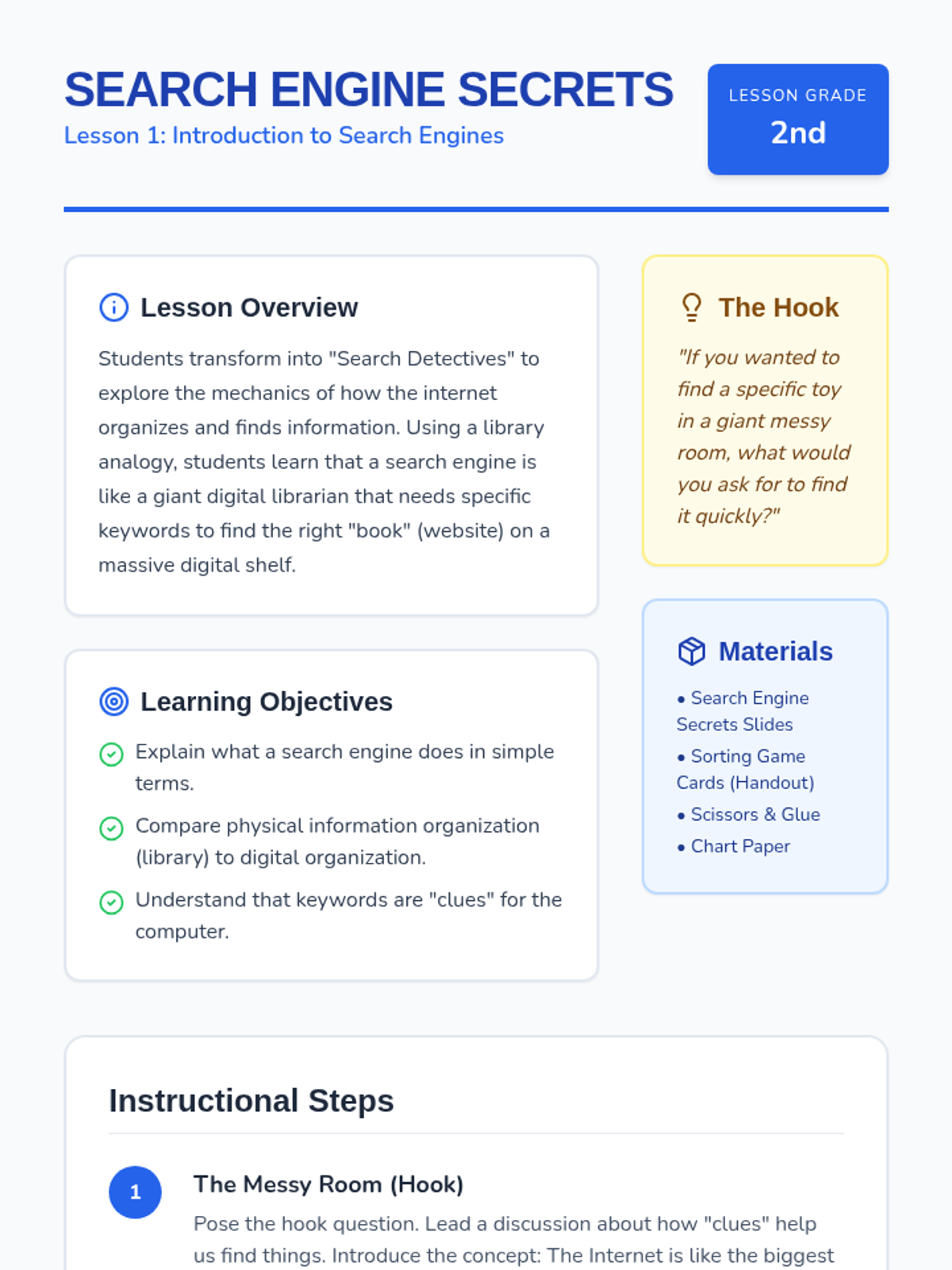 A 5-lesson unit for 2nd graders to master the art of keyword searching. Students become 'Search Detectives' to understand how the internet organizes information, how to extract keywords from questions, and how to refine their searches using synonyms and specific terms.