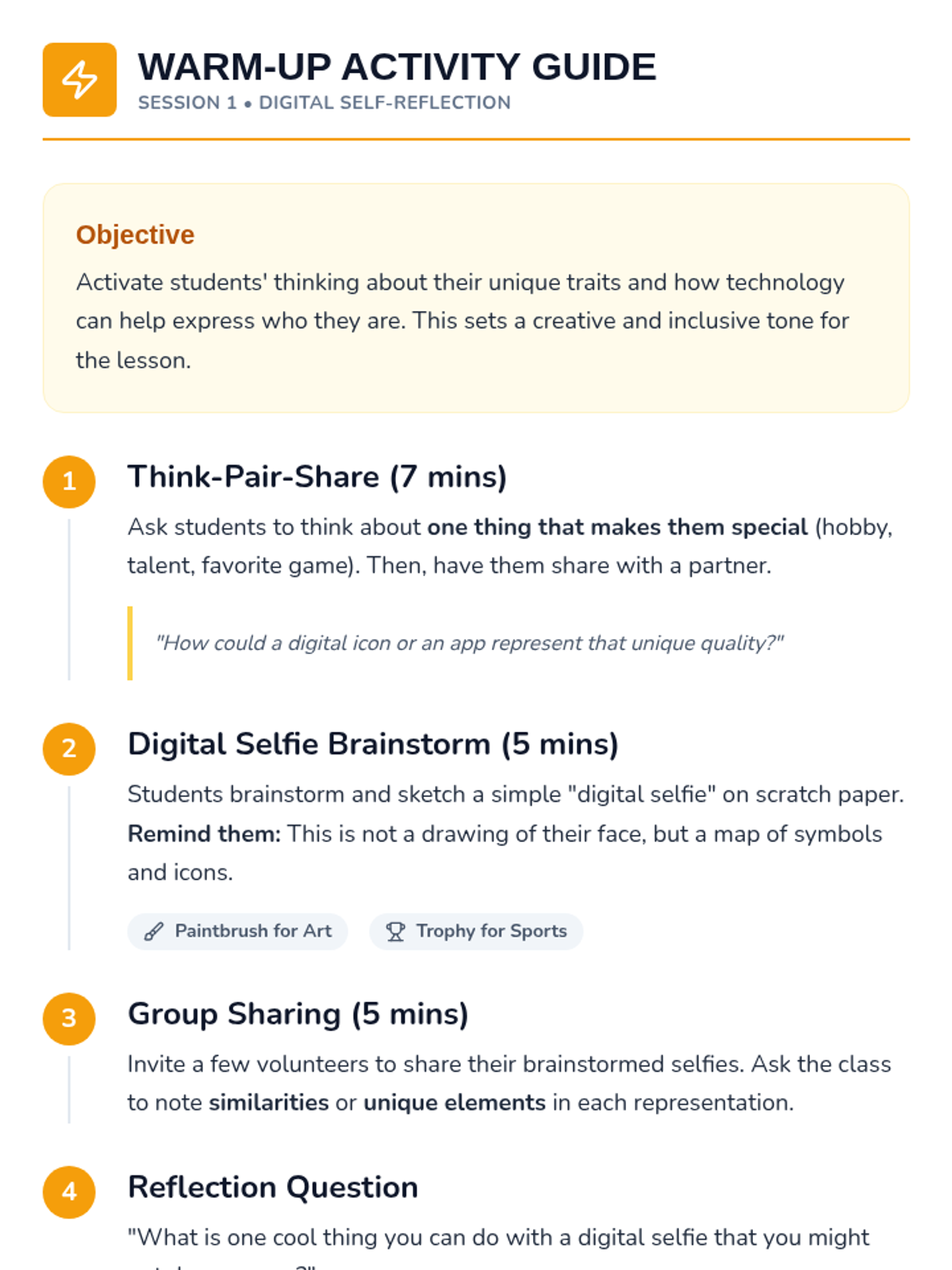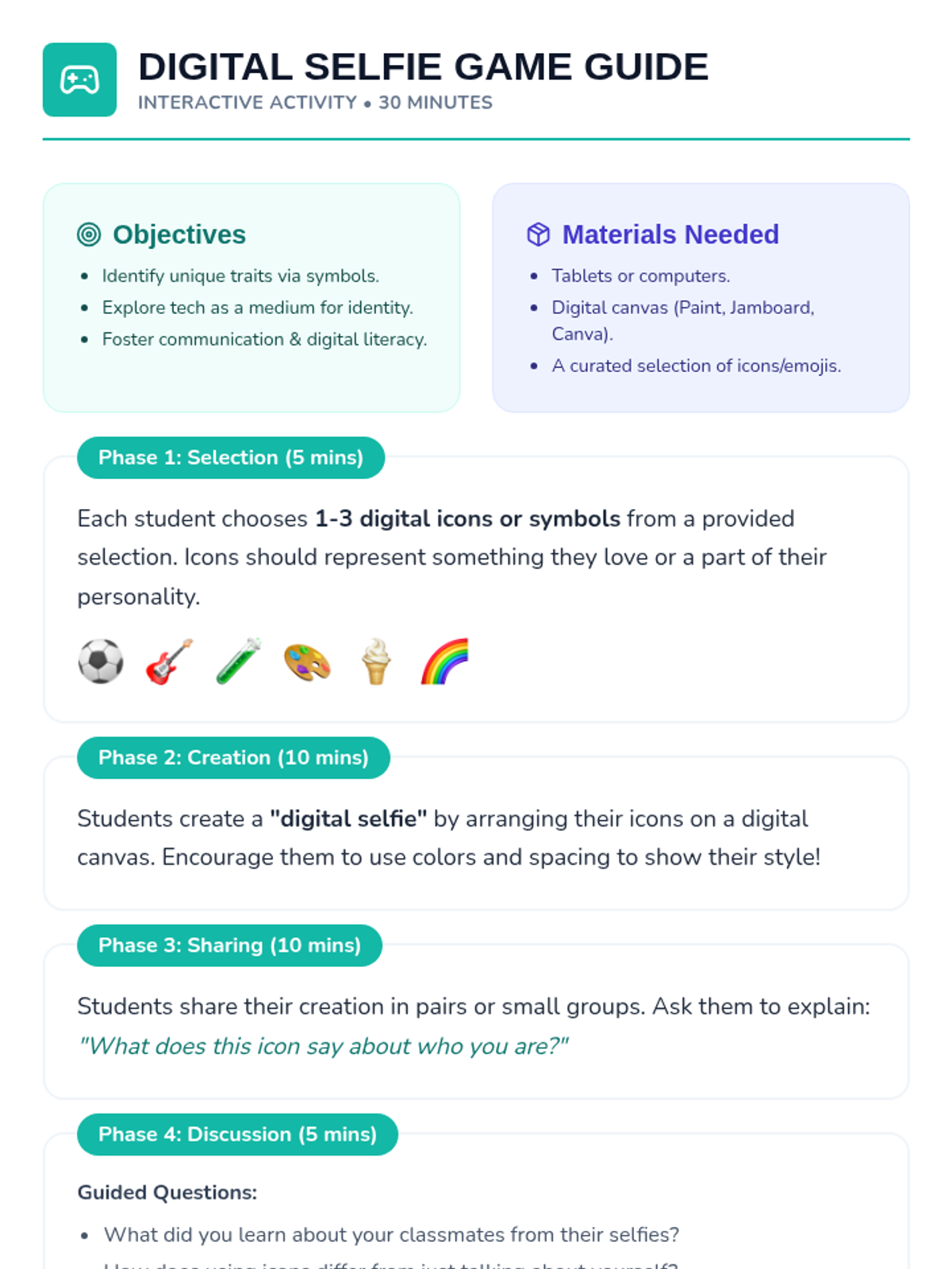 A two-session sequence for 7-8 year olds that explores self-expression and identity using digital tools. Students will learn to create 'digital selfies', participate in tech-based scavenger hunts, and reflect on their digital footprint in a creative and safe environment.