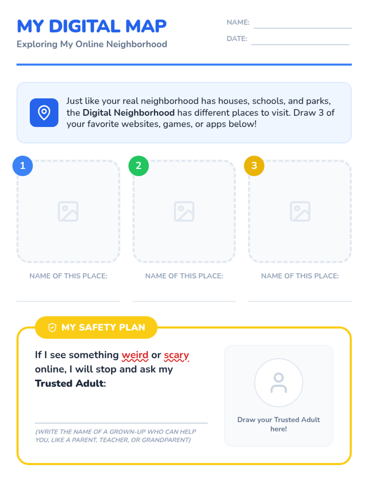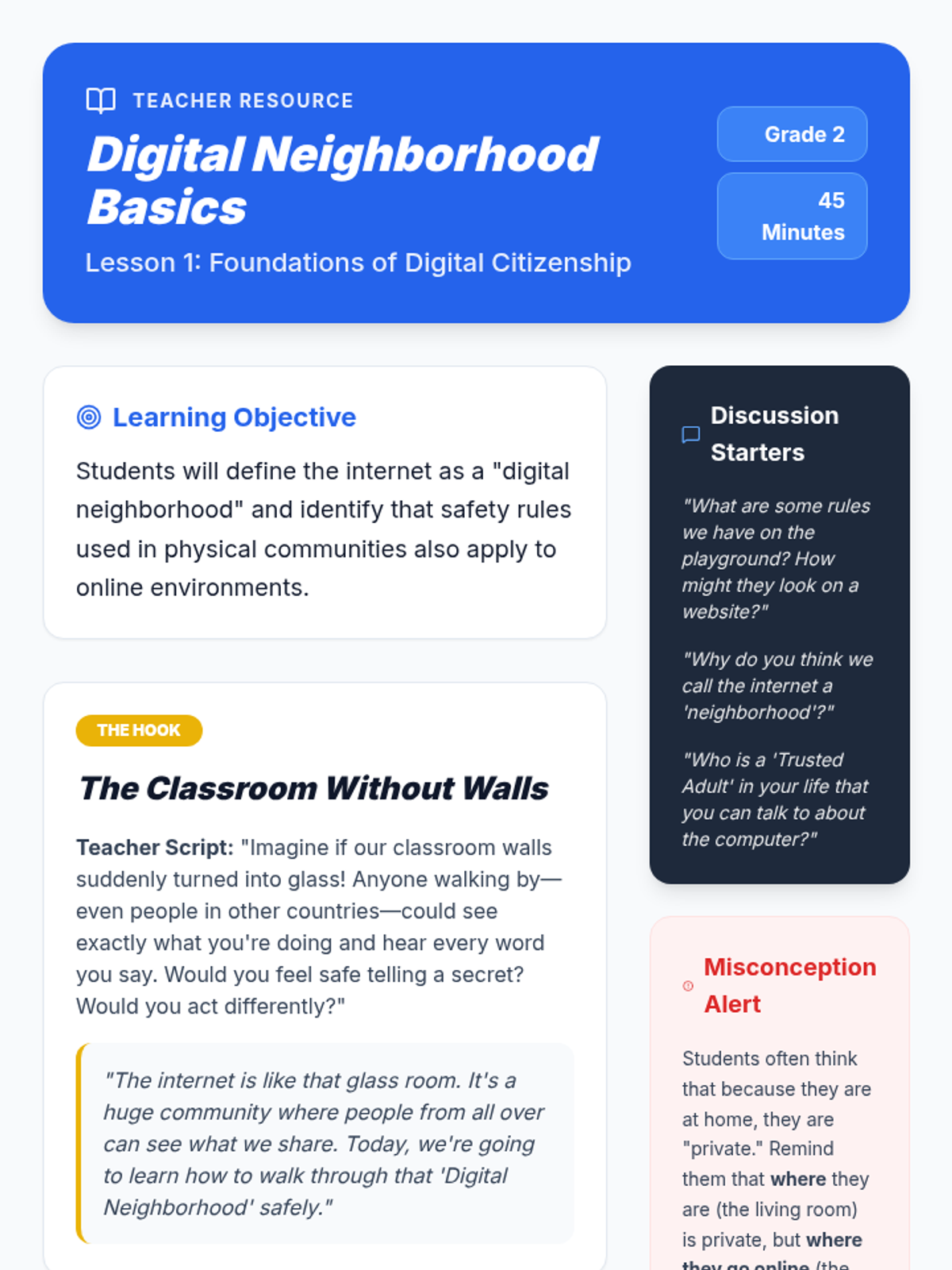 A comprehensive 2nd-grade sequence introducing digital citizenship through the analogy of a 'digital neighborhood.' Students learn to distinguish between private and public information, recognize that avatars don't always match real-life identities, practice digital empathy, and understand the permanence of their digital footprint.