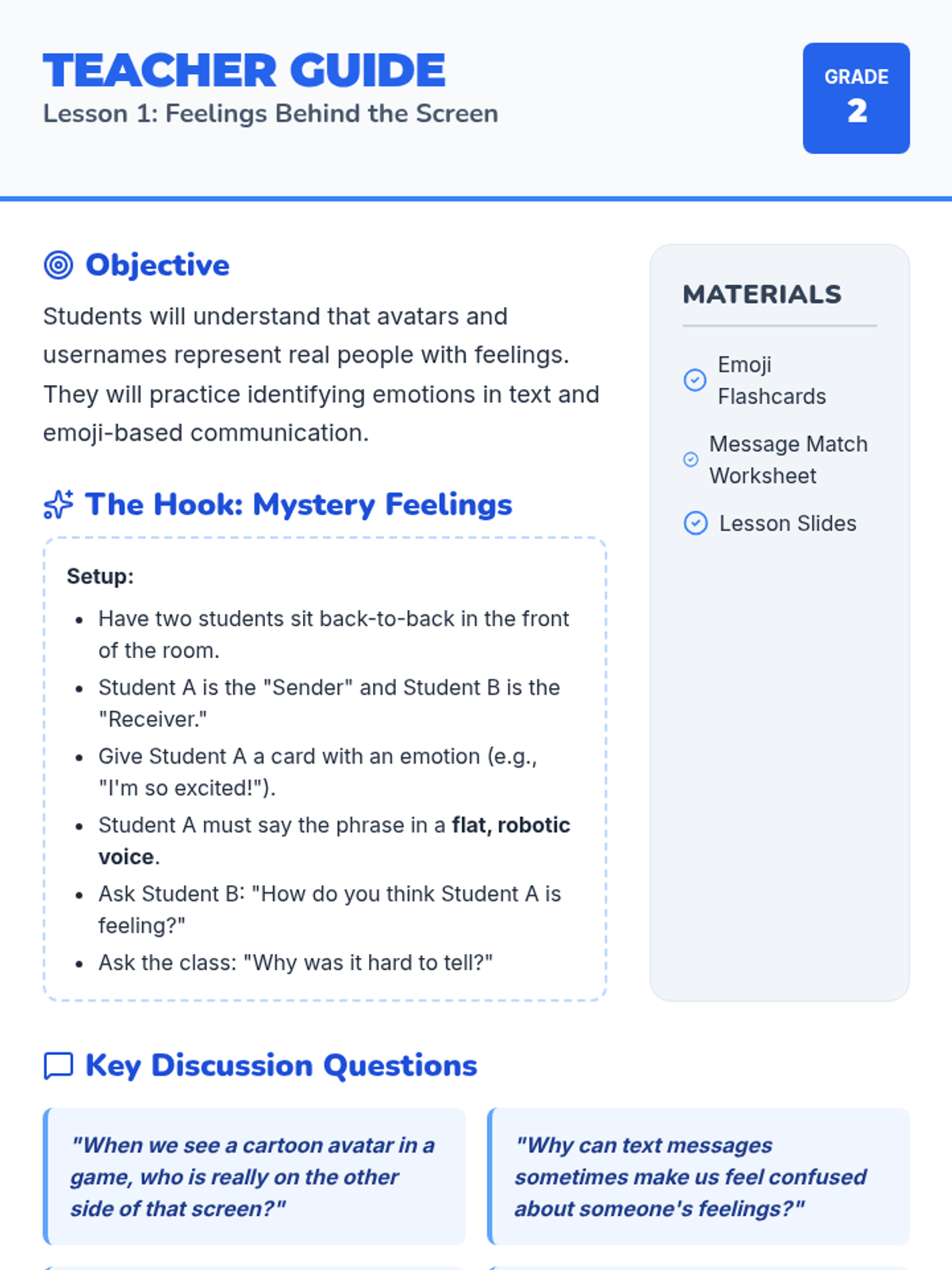 A 2nd-grade unit focused on empathy, safety, and respect in digital spaces. Students learn to recognize feelings behind the screen, identify unkind behavior, follow safety protocols, and act as upstanders to build a positive online community.