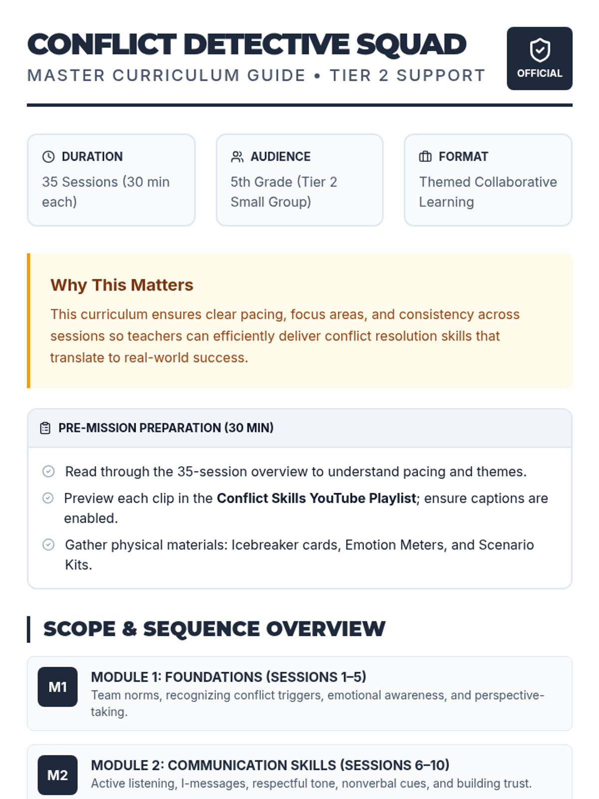 A comprehensive 35-session Tier 2 social-emotional curriculum designed for 5th graders and 2nd-3rd graders, focusing on conflict resolution, communication, and emotional regulation through a themed 'Detective' and 'Explorer' lens.