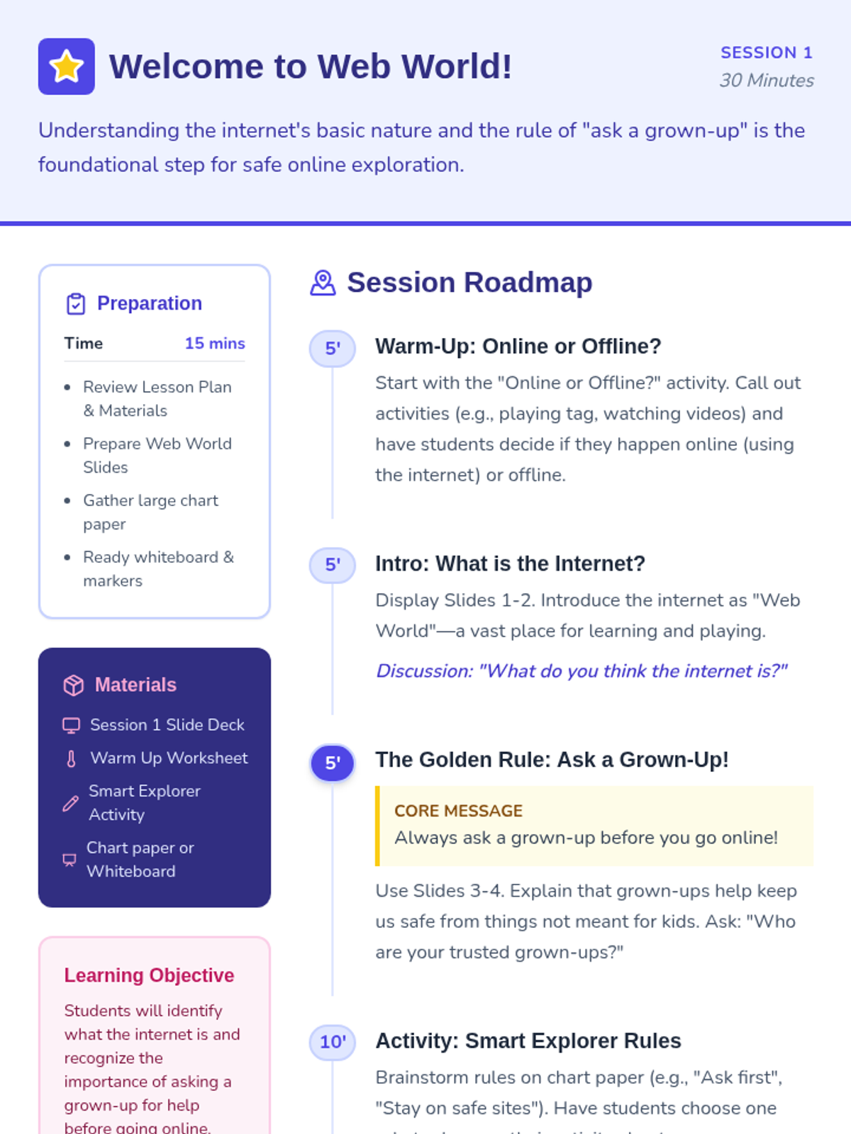 Una secuencia educativa diseñada para enseñar a niños de 7 años las reglas básicas de seguridad en internet, el manejo de información personal y la importancia de la supervisión de un adulto.