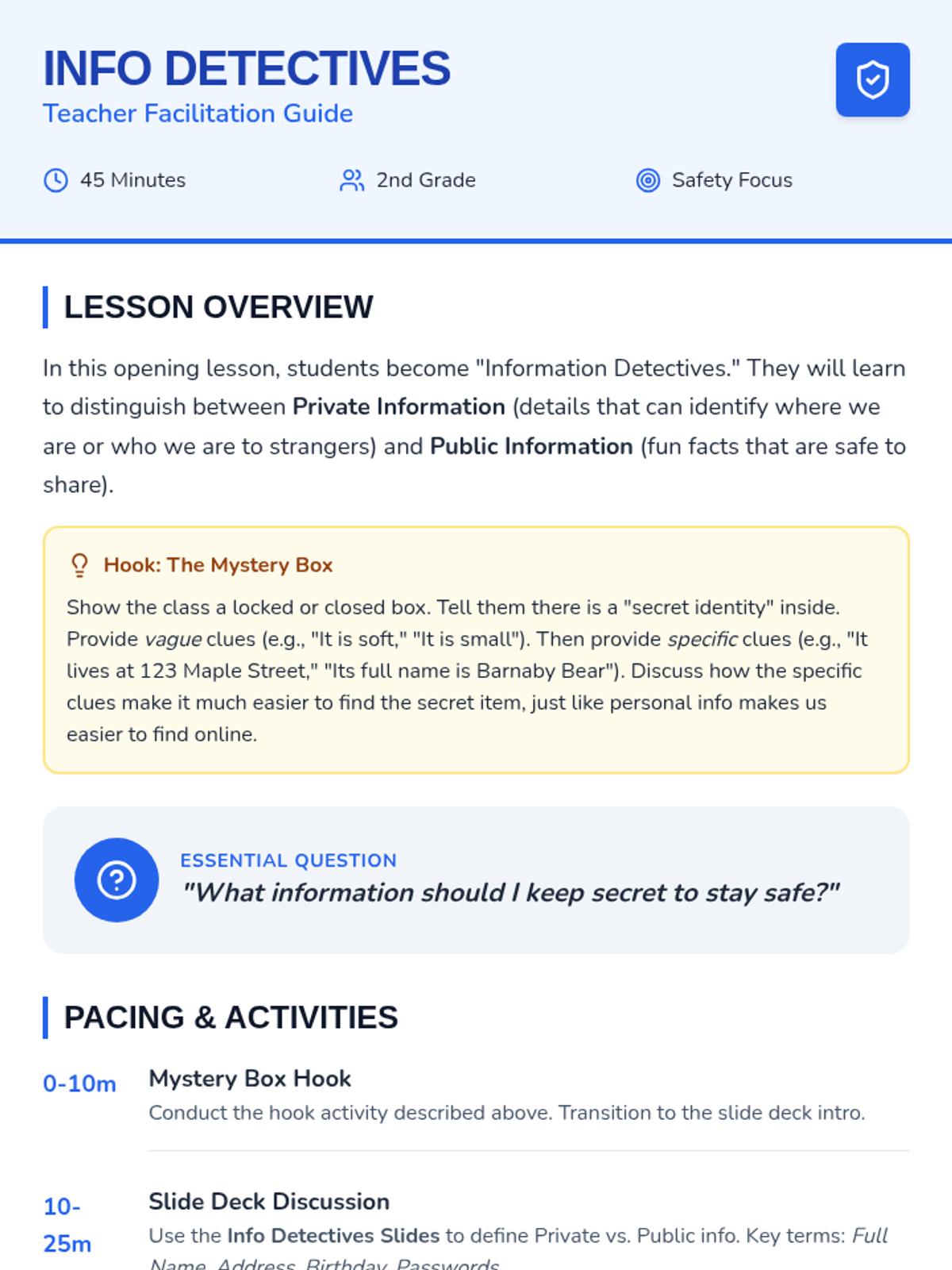 This 5-lesson sequence teaches 2nd graders to distinguish between private and public information, create safe usernames and passwords, and follow the 'Pause and Ask' rule to stay safe online.