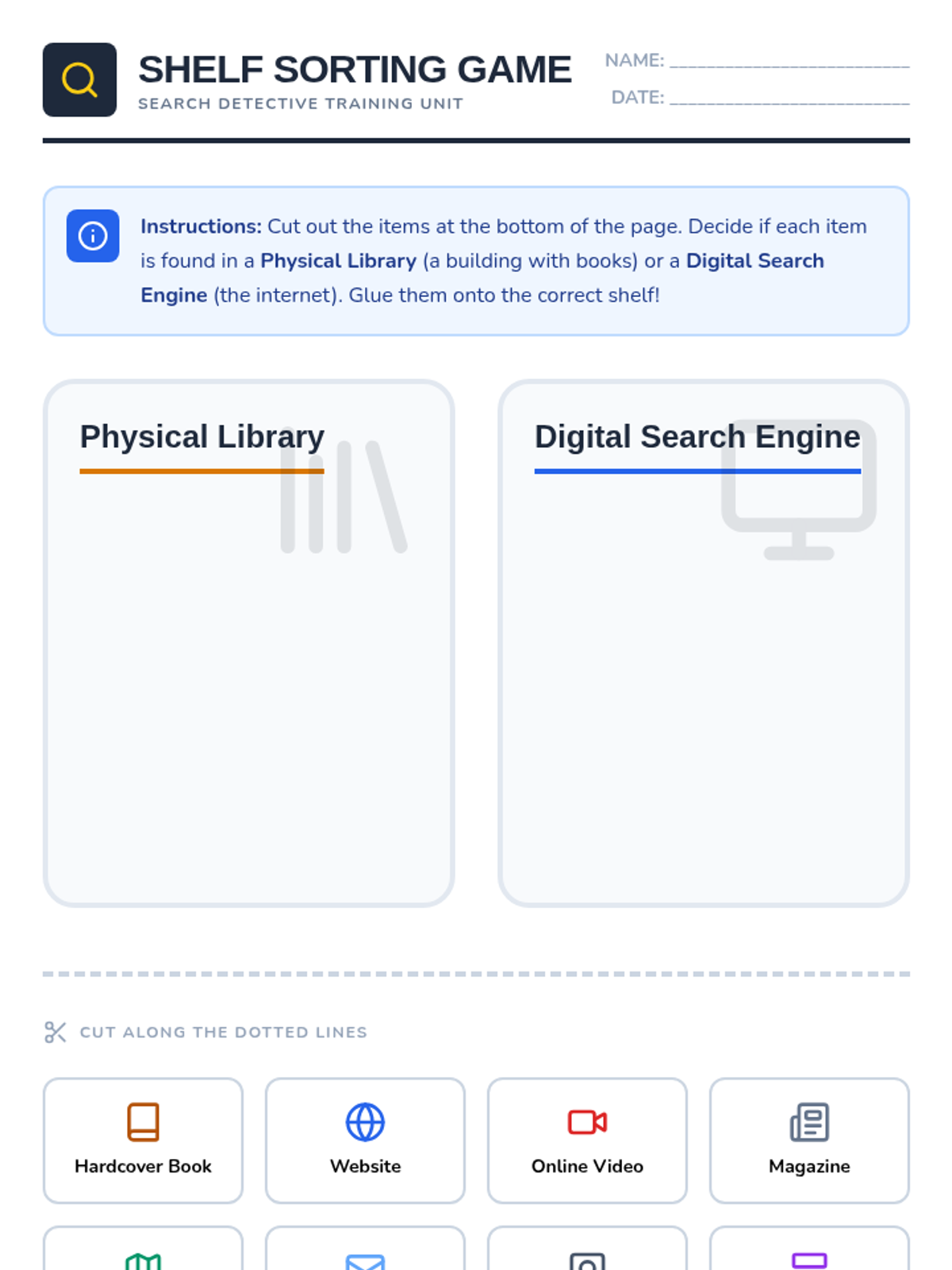 A comprehensive introduction for 2nd graders to the world of online research, focusing on search engine mechanics, keyword selection, media literacy (identifying ads), source evaluation, and basic citation habits. Students act as 'Digital Detectives' to navigate the internet safely and effectively.