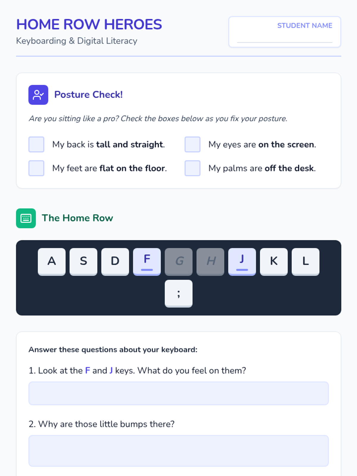 A comprehensive introduction to typing ergonomics, home row placement, and essential digital citizenship concepts like privacy and password security for 2nd graders.