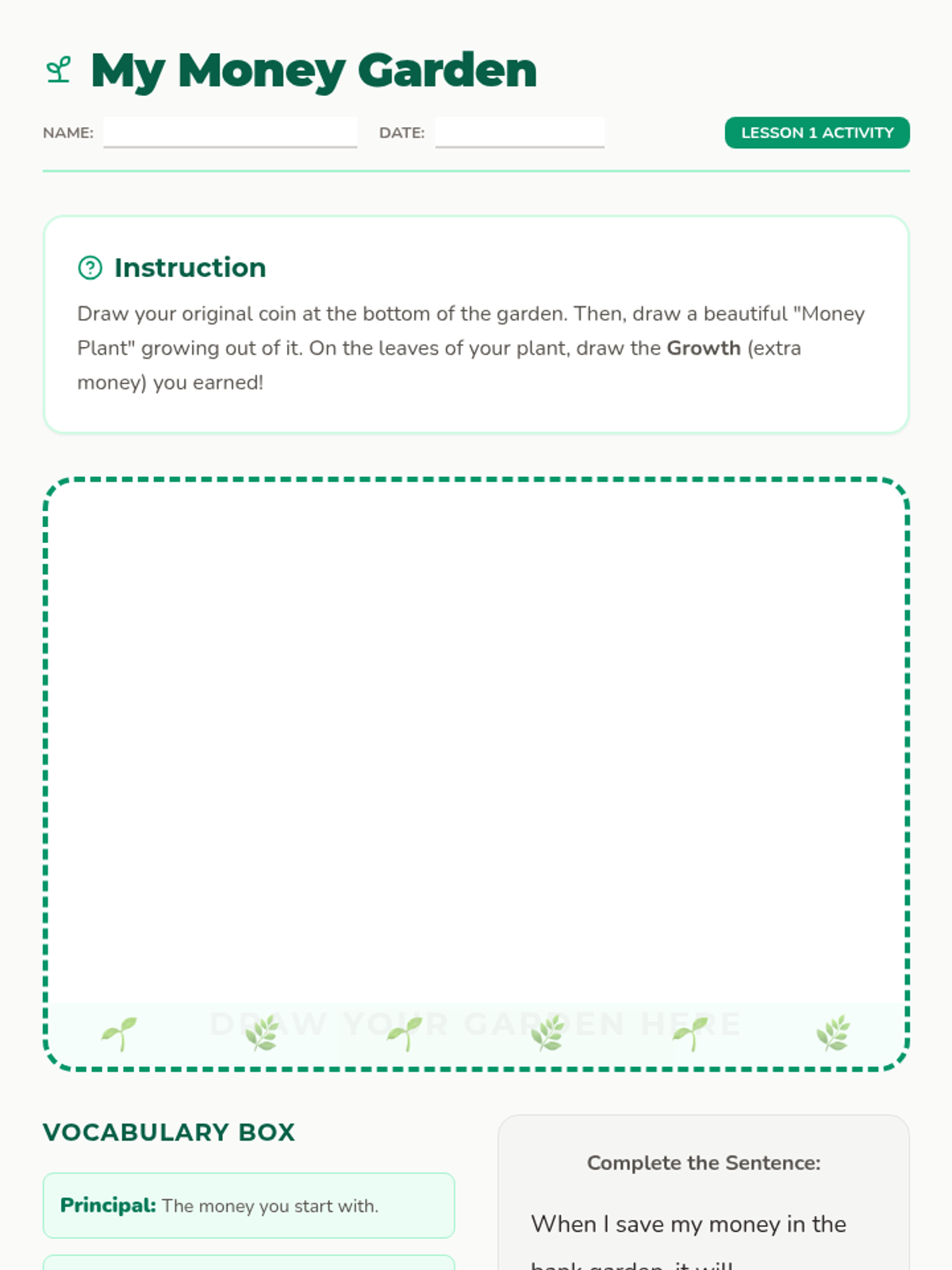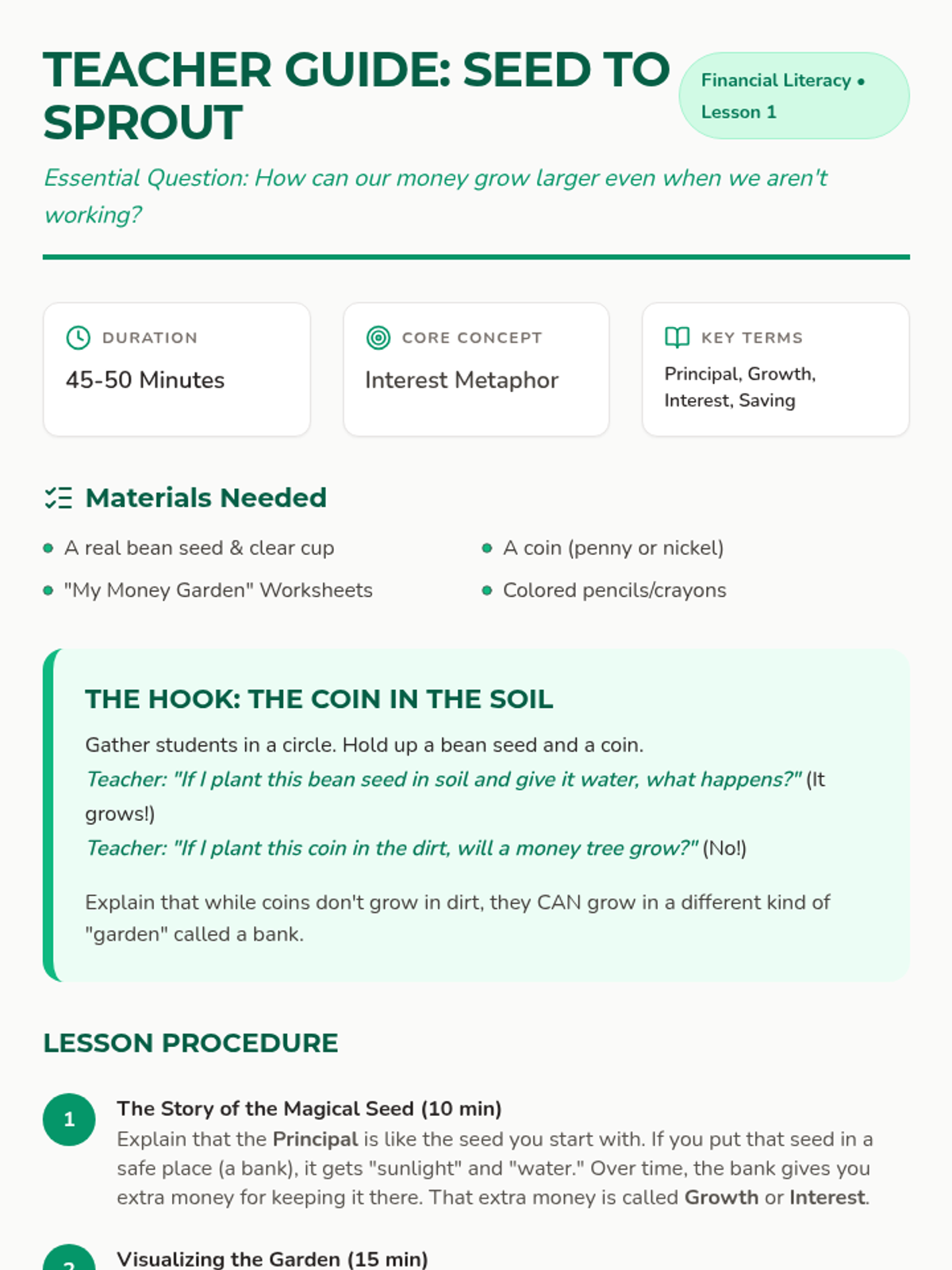 This sequence introduces 2nd-grade students to the concept of interest and money growth using a garden metaphor. Students explore how saving money in a bank leads to growth over time through simulations and hands-on activities.