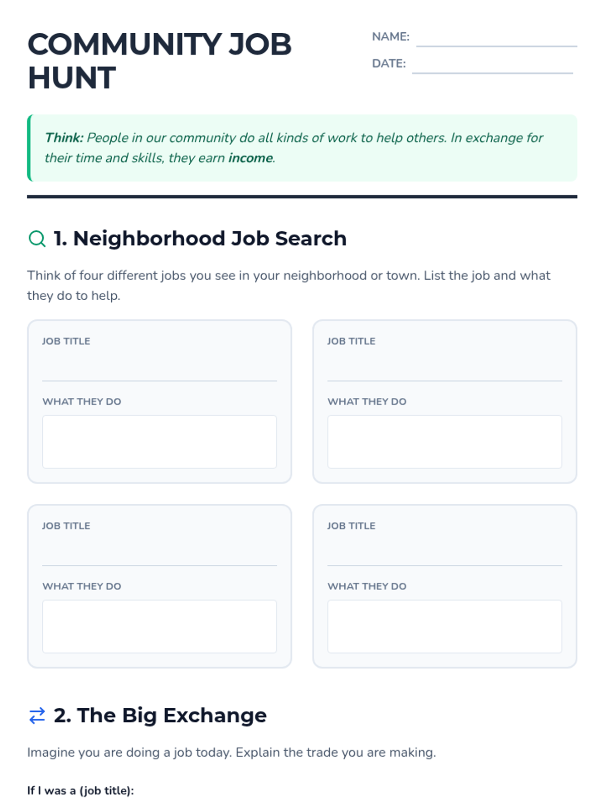 This sequence explores the relationship between education, jobs, and income. Students learn about budgeting, the impact of unexpected expenses, and the intrinsic value of all community work, addressing economic inequality through practical simulations and reflection.