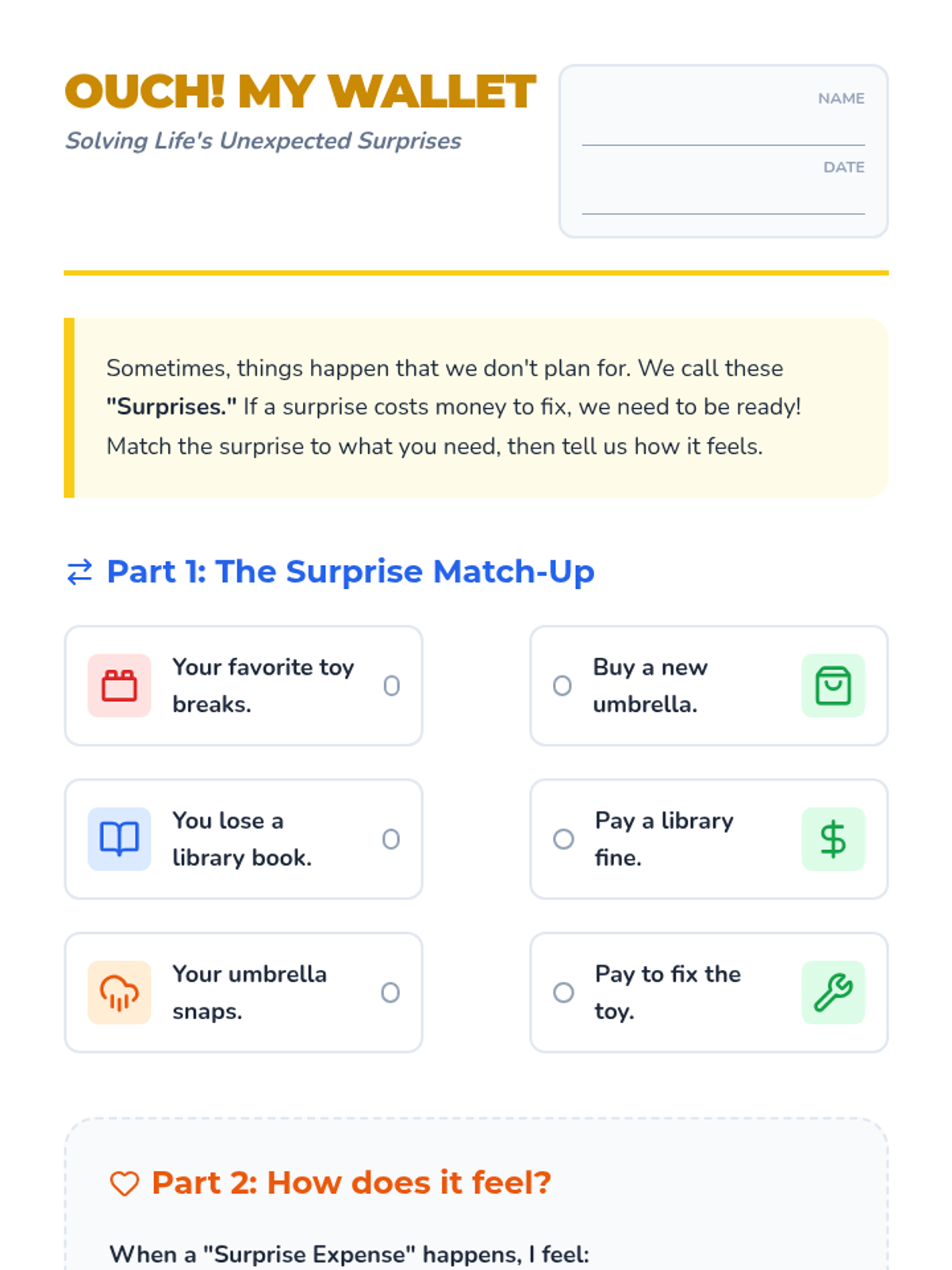 A comprehensive unit for 2nd graders on the importance of emergency funds. Students learn to distinguish between planned and unplanned expenses through stories, sorting activities, and a final budgeting simulation.