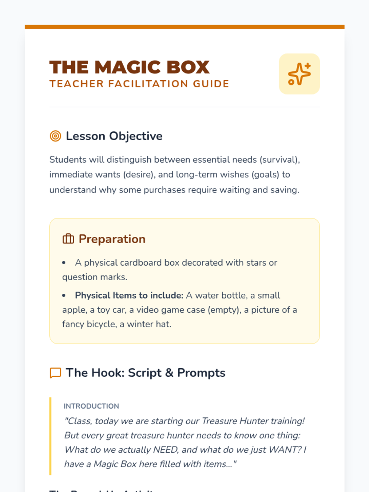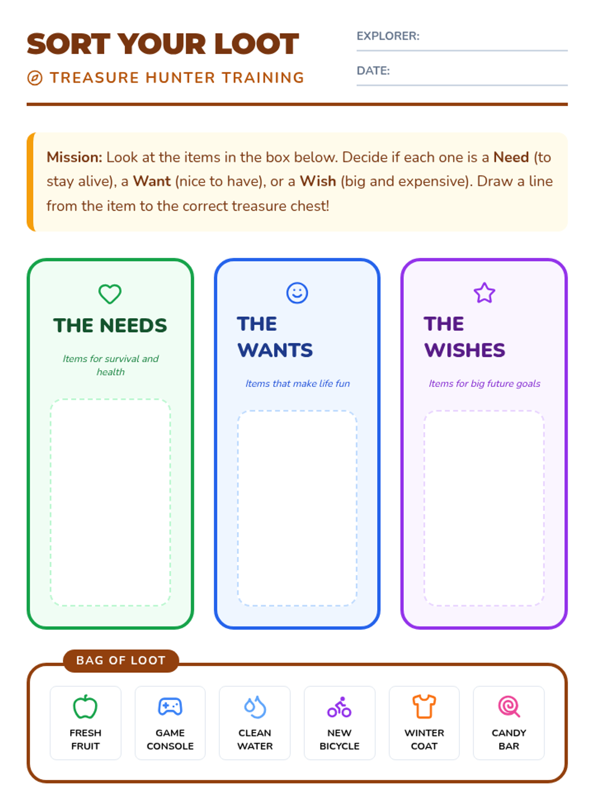 This sequence introduces 2nd graders to saving through a 'Treasure Hunter' theme, covering needs vs. wants, the three-jar method, goal setting, patience, and progress tracking.