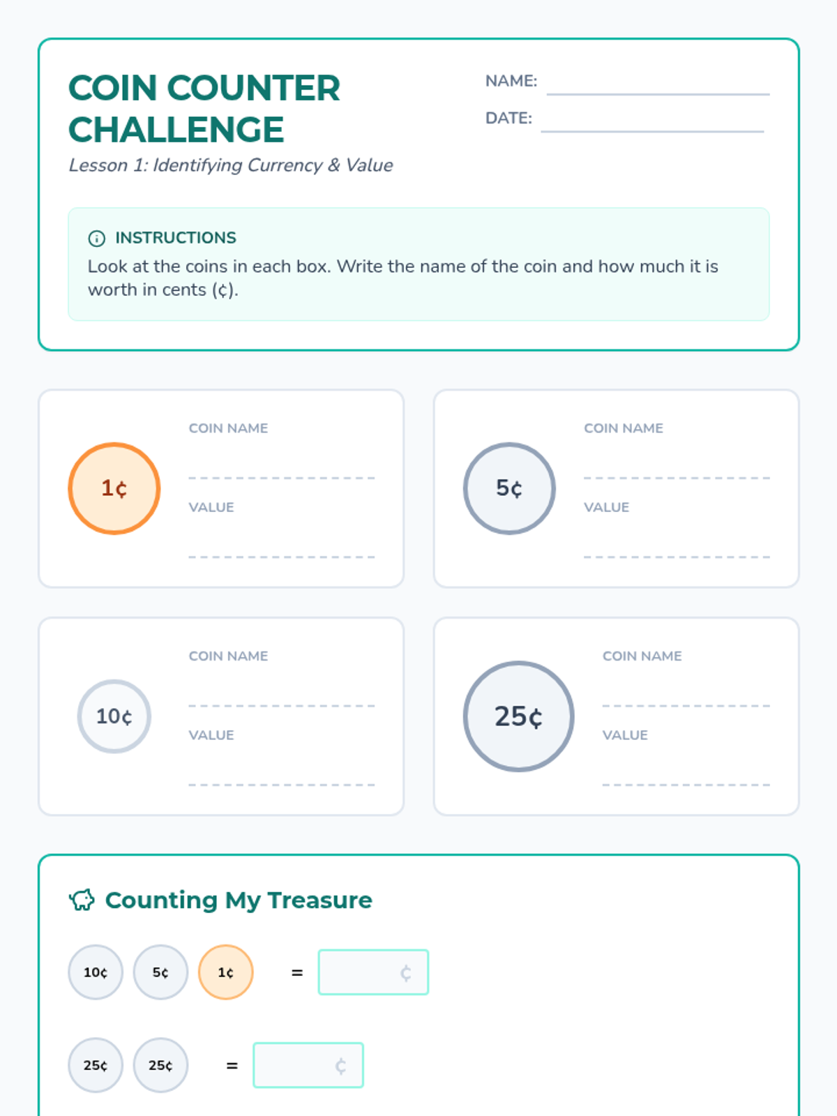 A comprehensive unit on essential financial literacy skills, ranging from basic coin identification to practical budgeting and total calculation.