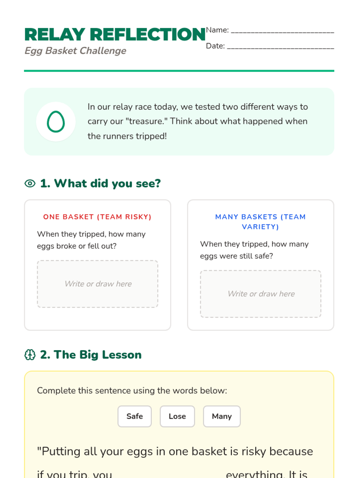 A 2nd-grade financial literacy sequence exploring risk, saving, and investing through the metaphor of 'not putting all your eggs in one basket.' Students learn about diversification, probability, and asset types through games and simulations.