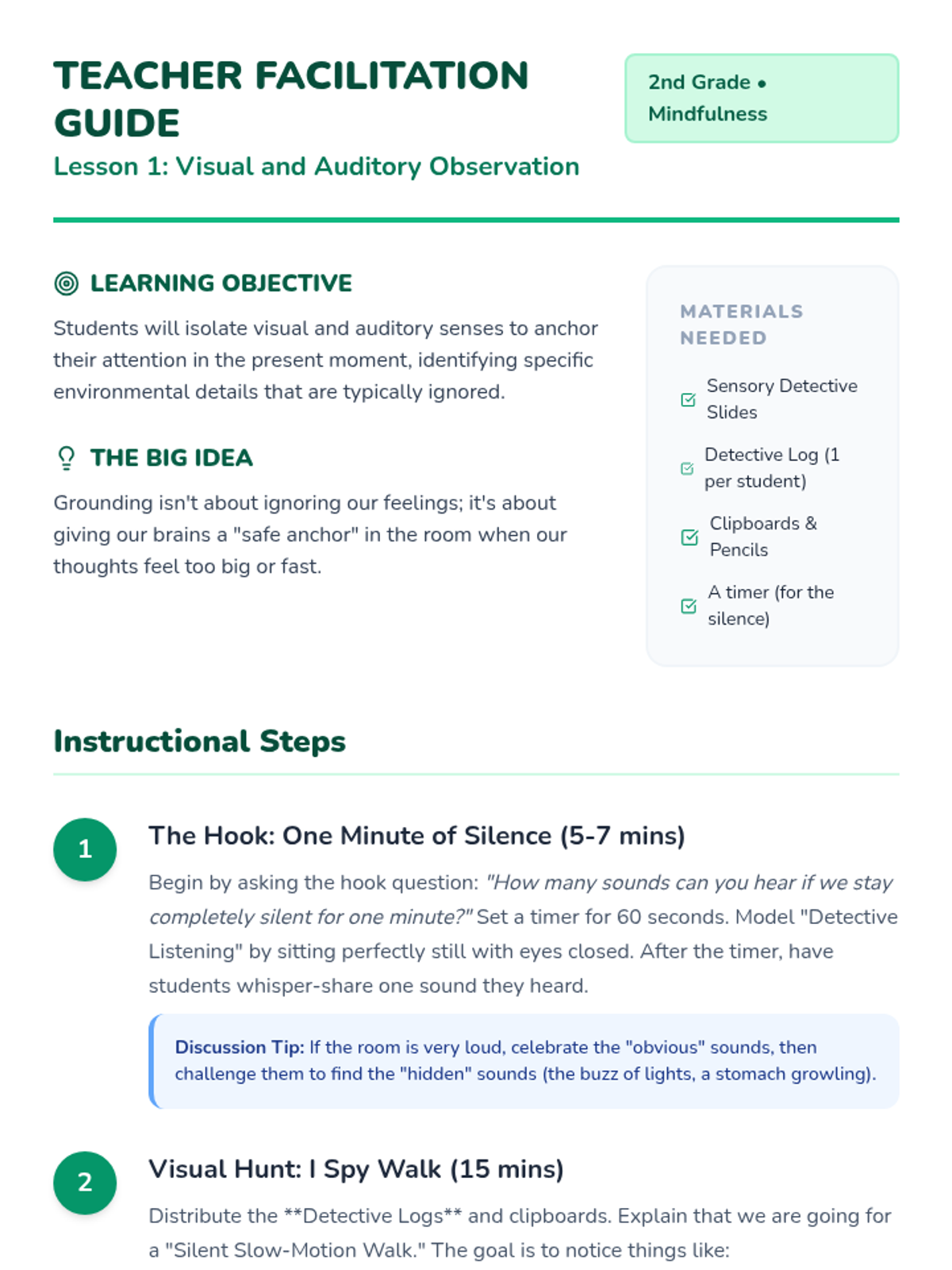 This 2nd Grade sequence teaches sensory grounding techniques to help students manage overwhelm and stay present. Students move from individual sensory exploration to mastering the 5-4-3-2-1 coping strategy, ending with a personalized sensory anchor plan.