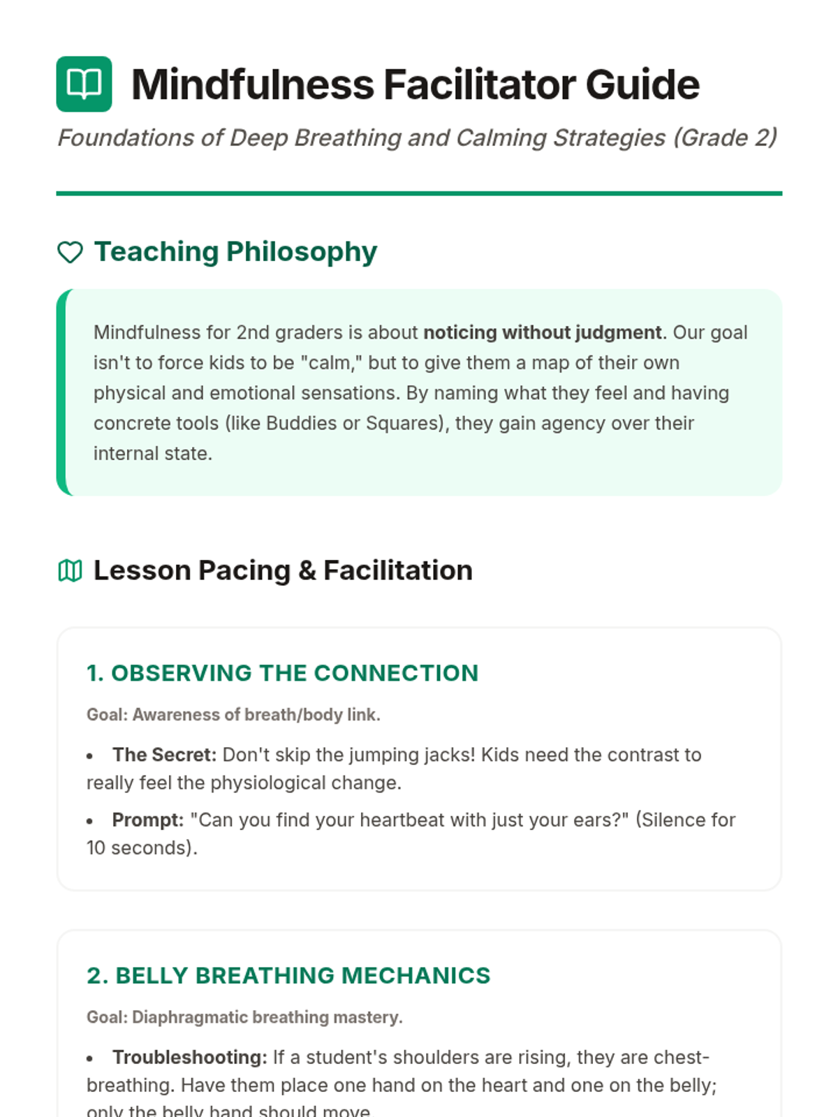 A comprehensive introduction to mindfulness for 2nd graders, focusing on the connection between breath and emotions. Students learn to observe their bodies, master belly breathing, use visualization, and apply techniques to manage everyday stress.