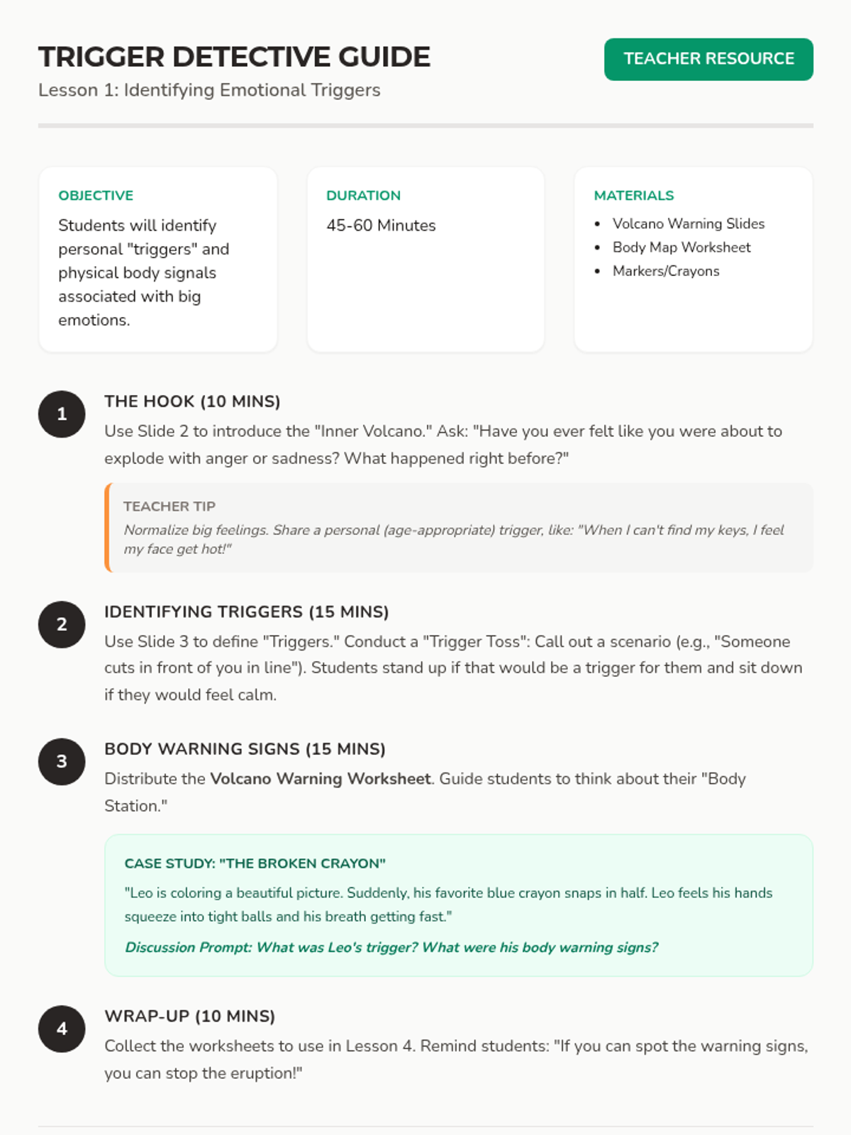 A comprehensive four-lesson series designed to help students identify their emotions, recognize physical triggers, build a coping toolbox, and align their reactions with the size of their problems.