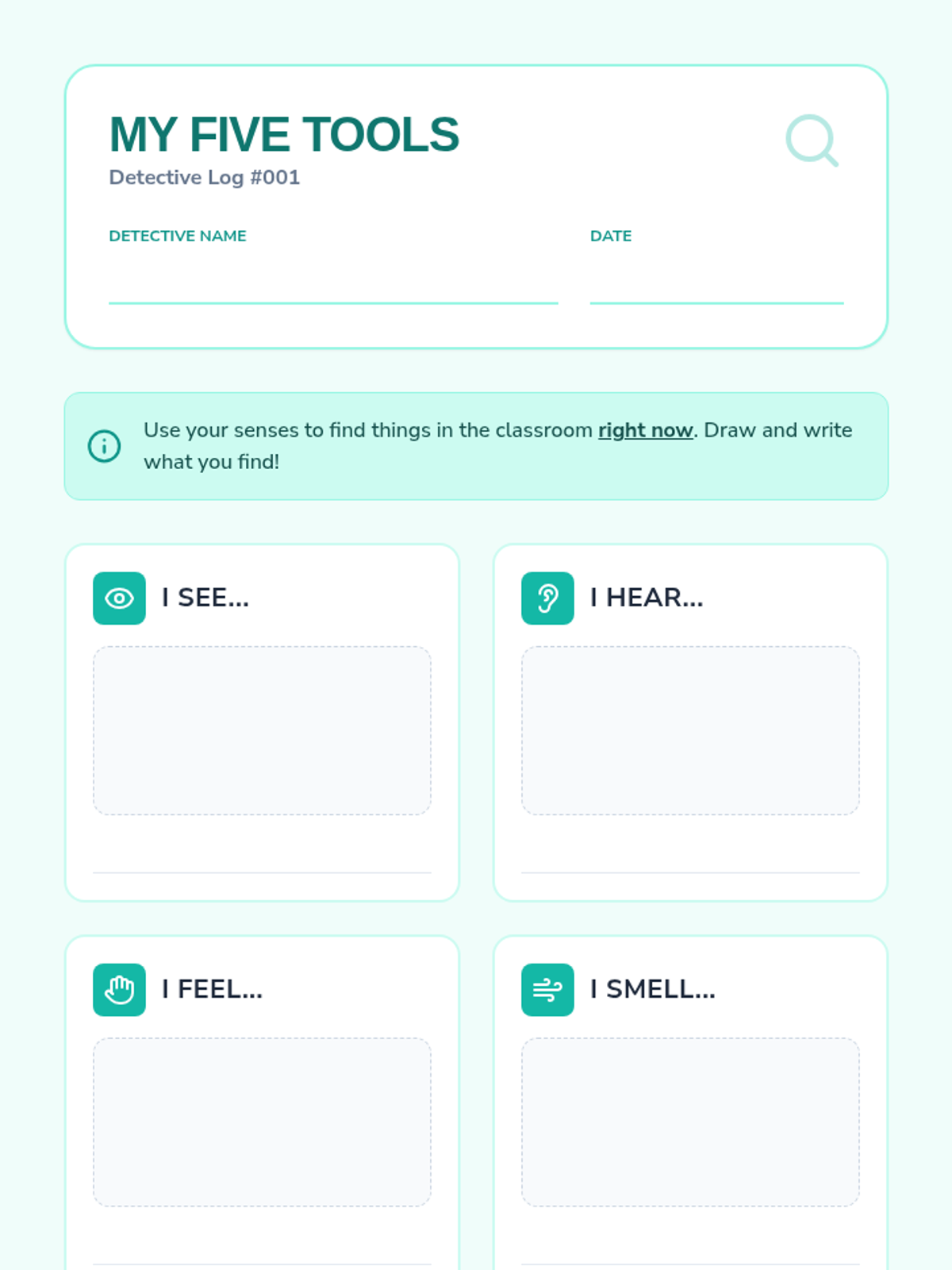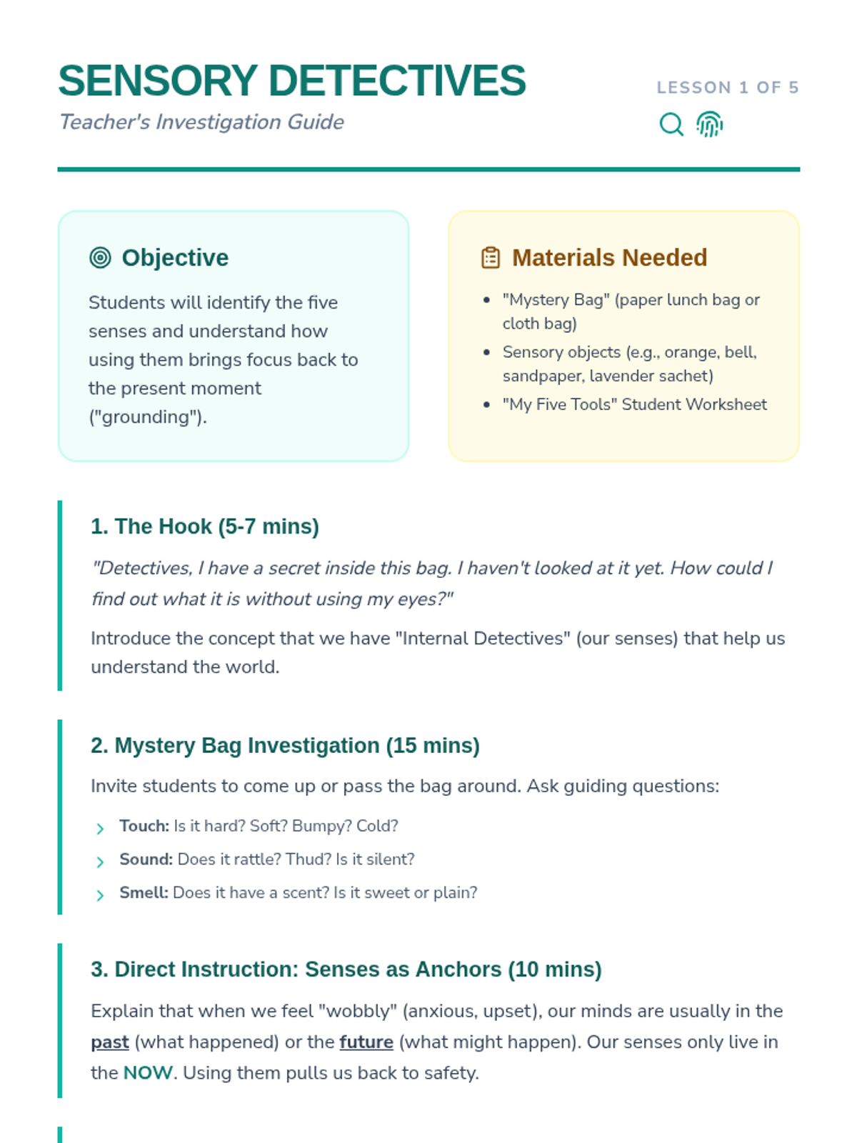A 5-lesson sequence for 2nd-grade students on using the five senses for emotional grounding and regulation. Students explore sensory awareness through a detective-themed series of lessons, culminating in the mastery of the 5-4-3-2-1 grounding technique.
