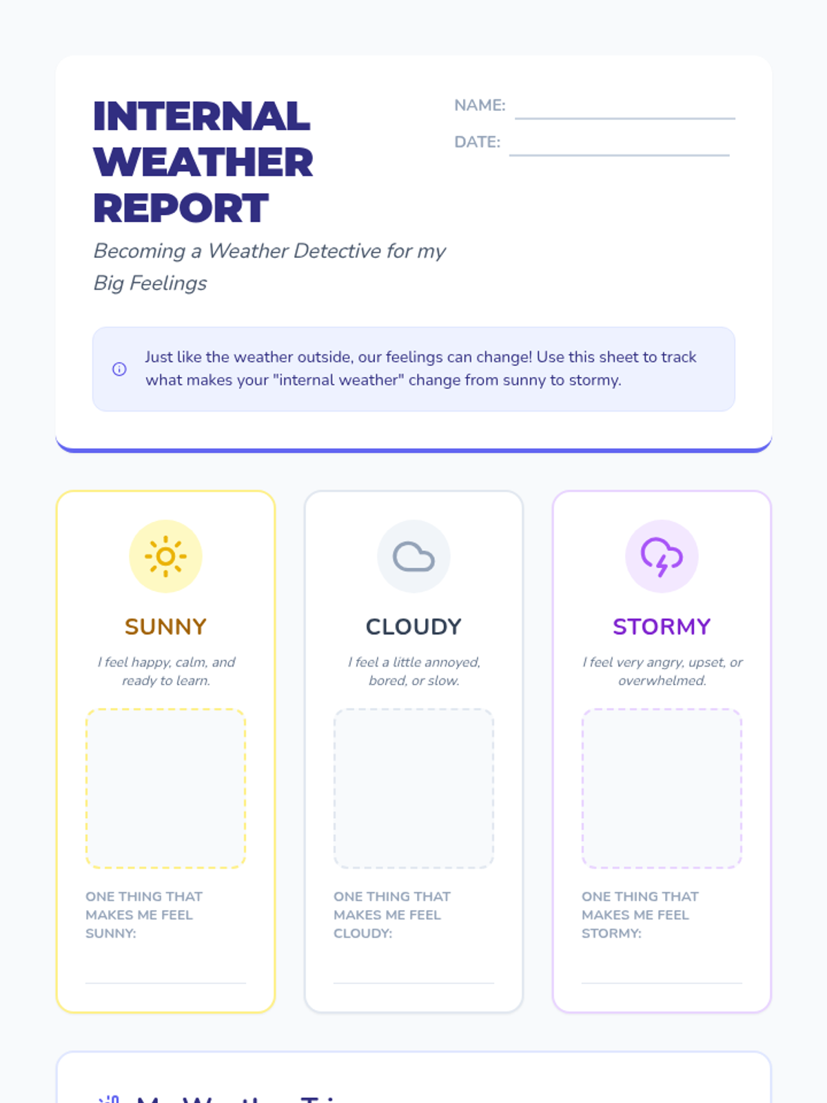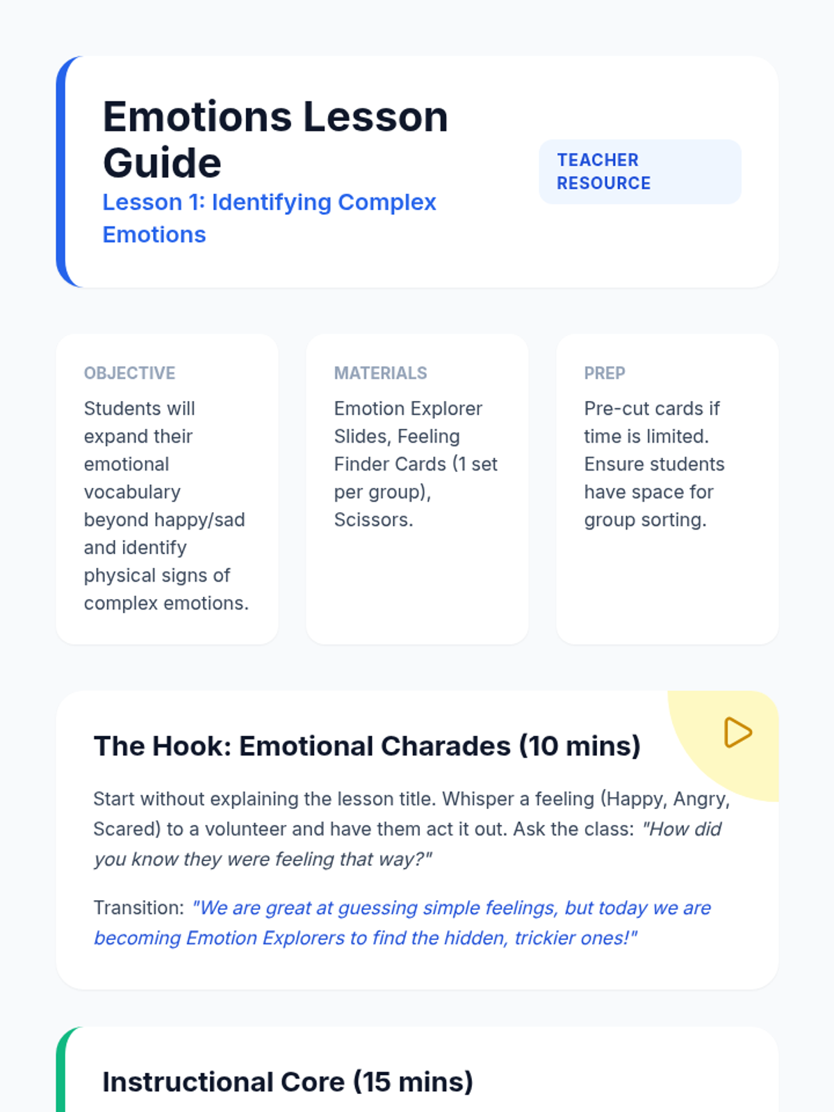 A comprehensive 4-week social-emotional learning curriculum for 1st and 2nd graders. Students learn to identify emotions using the Zones of Regulation, track triggers with a Feelings Thermometer, develop coping strategies, and build respectful friendships.