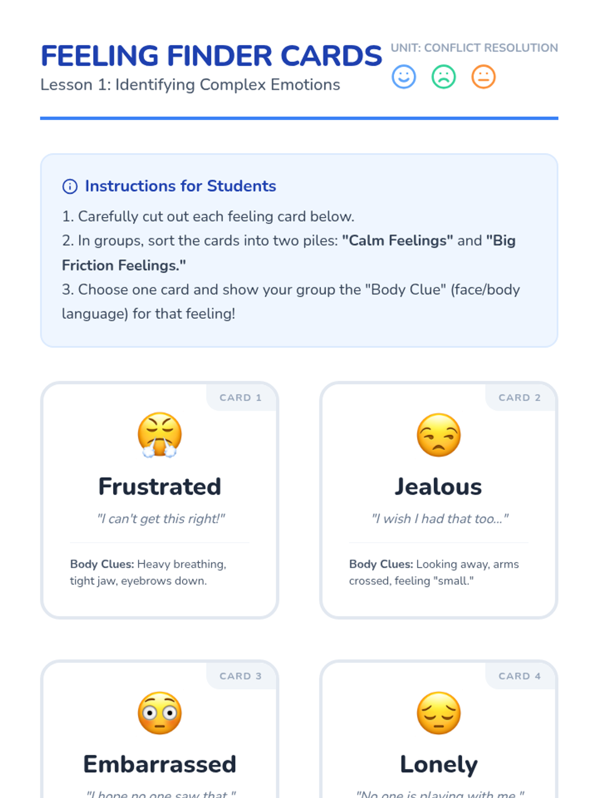 This sequence teaches 2nd-grade students how to identify complex emotions and use 'I' statements to resolve conflicts effectively and empathetically. Students move from building emotional vocabulary to practicing structured communication frames in real-world scenarios.