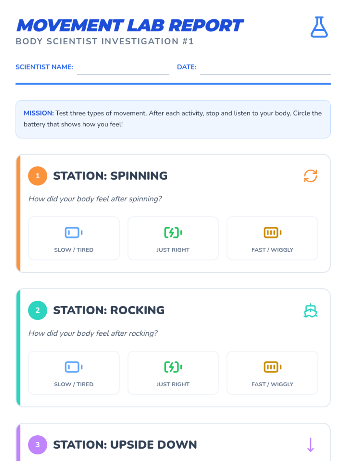 A 5-lesson workshop sequence where 2nd-grade students systematically explore vestibular, proprioceptive, tactile, auditory, and visual sensory inputs. Students act as 'body scientists' to evaluate how different tools and activities affect their regulation, culminating in a personalized 'Personal Power Plan' sensory diet.