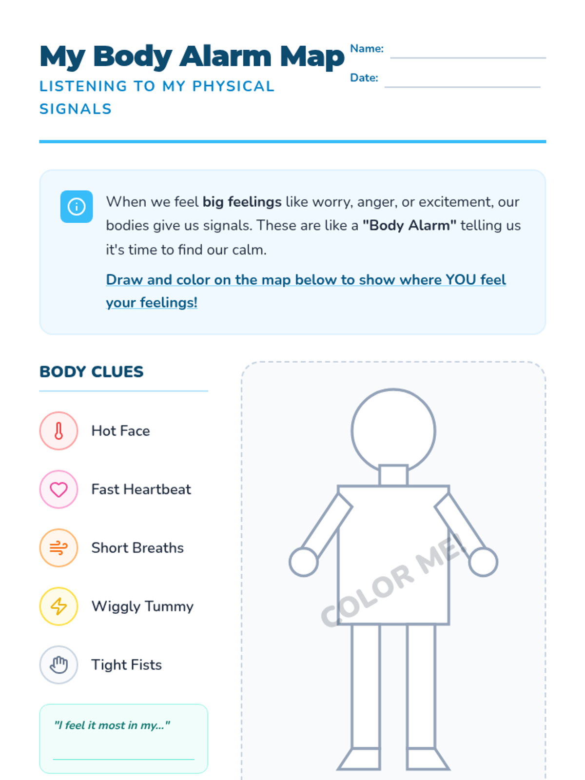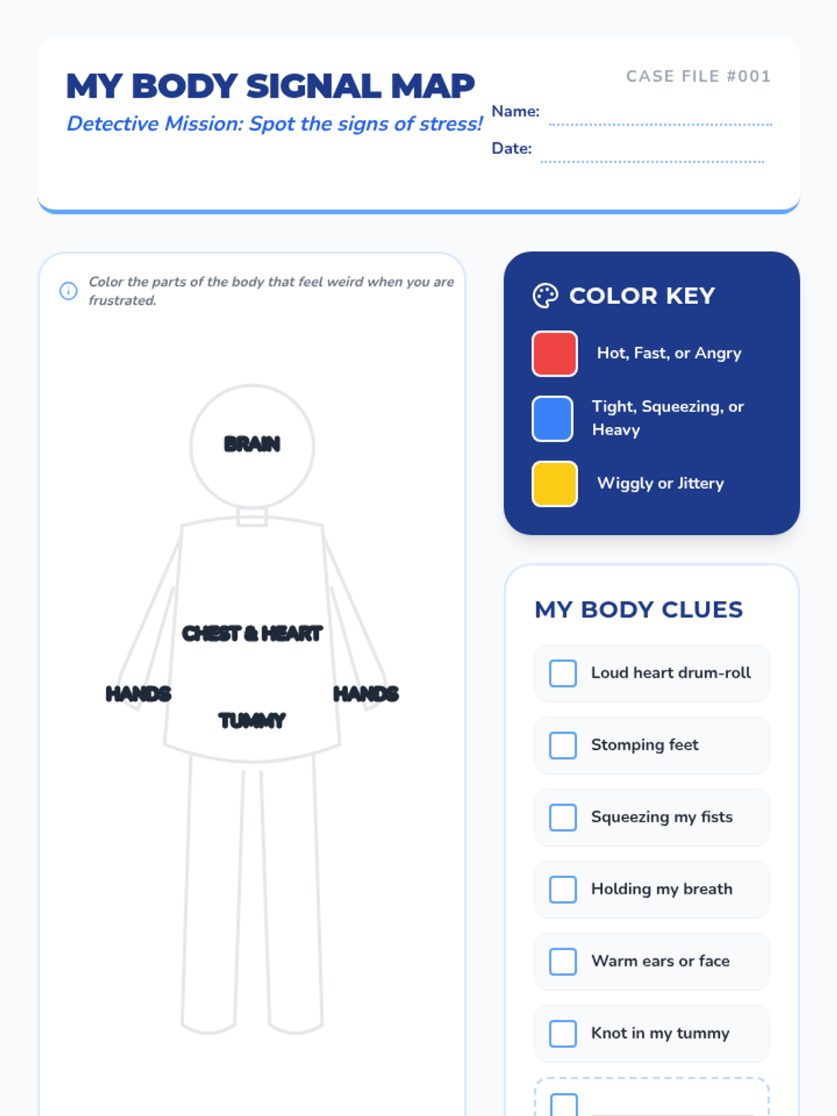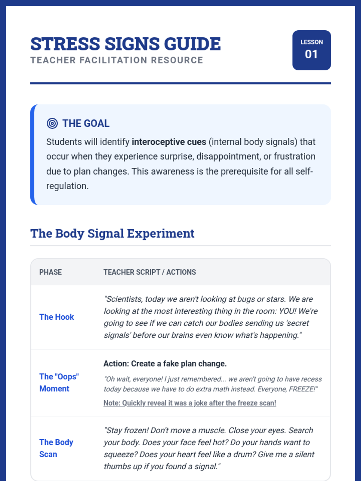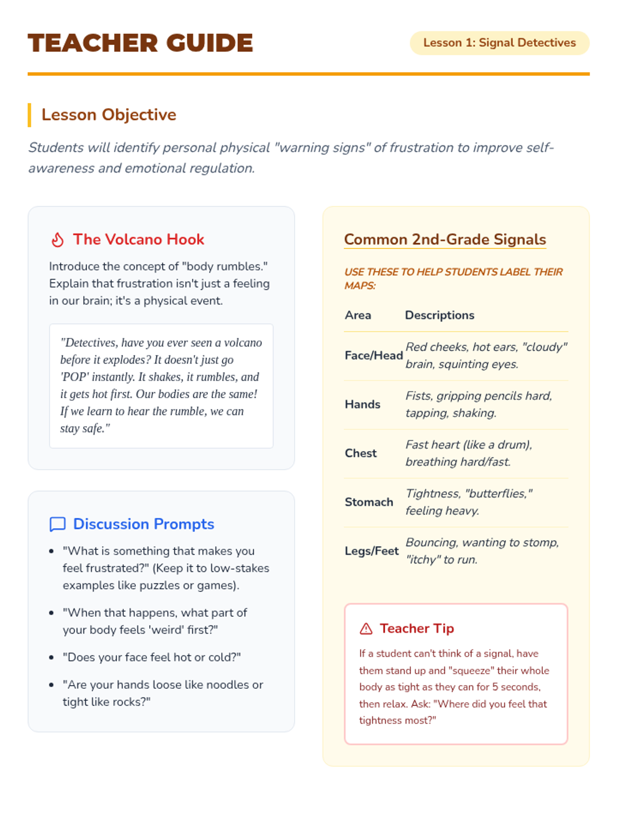 A comprehensive 5-lesson unit for 2nd graders to build somatic awareness, identifying physiological and behavioral signs of emotional escalation before they reach a crisis point. Students learn to recognize their 'baseline' calm state, map sensations to emotions, use an emotional thermometer, and identify personal warning signals.